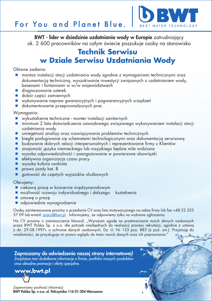 BWT - lider w dziedzinie uzdatniania wody w Europie zatrudniający ok. 2 600 pracowników na całym świecie poszukuje osoby na stanowisko Technik Serwisu w Dziale Serwisu Uzdatniania Wody Główne zadania: montaż instalacji stacji uzdatniania wody zgodnie z wymaganiami technicznymi oraz dokumentacją techniczną, wyszukiwanie inwestycji związanych z uzdatnianiem wody, basenami i fontannami w w/w województwach diagnozowanie usterek dobór części zamiennych wykonywanie napraw gwarancyjnych i pogwarancyjnych urządzeń dokumentowanie przeprowadzonych prac Wymagania: wykształcenie techniczne - monter instalacji sanitarnych minimum 2 lata doświadczenia zawodowego związanego wykonywaniem instalacji stacji uzdatniania wody umiejętność analizy oraz rozwiązywania problemów technicznych biegłe posługiwanie się schematami technologicznymi oraz dokumentacją serwisową budowanie dobrych relacji interpersonalnych i reprezentowanie firmy u Klientów znajomość języka niemieckiego lub rosyjskiego będzie mile widziana wysoka odpowiedzialność i zaangażowanie w powierzone obowiązki efektywna organizacja czasu pracy wysoka kultura osobista prawo jazdy kat. B gotowość do częstych wyjazdów służbowych Oferujemy: ciekawą pracę w koncernie międzynarodowym możliwość rozwoju indywidualnego i dalszego umowę o pracę odpowiednie wynagrodzenie kształcenia Osoby zainteresowane prosimy o przesłanie CV oraz listu motywacyjnego na adres firmy lub fax +48 22 533 57 09 lub e-mail: [email protected] . Informujemy, że odpowiemy tylko na wybrane zgłoszenia. Na CV prosimy o zamieszczenie klauzuli: „Wyrażam zgodę na przetwarzanie moich danych osobowych przez BWT Polska Sp. z o.o. dla potrzeb niezbędnych do realizacji procesu rekrutacji, zgodnie z ustawą z dn. 29.08.1997r. o ochronie danych osobowych, Dz. U. Nr 133 poz. 883 (z poź. zm.). Przyjmuję do wiadomości, że przysługuje mi prawo wglądu do treści moich danych oraz ich poprawiania.“ Zapraszamy do odwiedzenia naszej strony internetowej! Znajdziesz tam dodatkowe informacje o firmie, portfolio naszych produktów oraz aktualne promocje i oferty specjalne. www.bwt.pl Zapewniamy poufność informacji BWT Polska Sp. z o.o. ul. Połczyńska 116 01-304 Warszawa