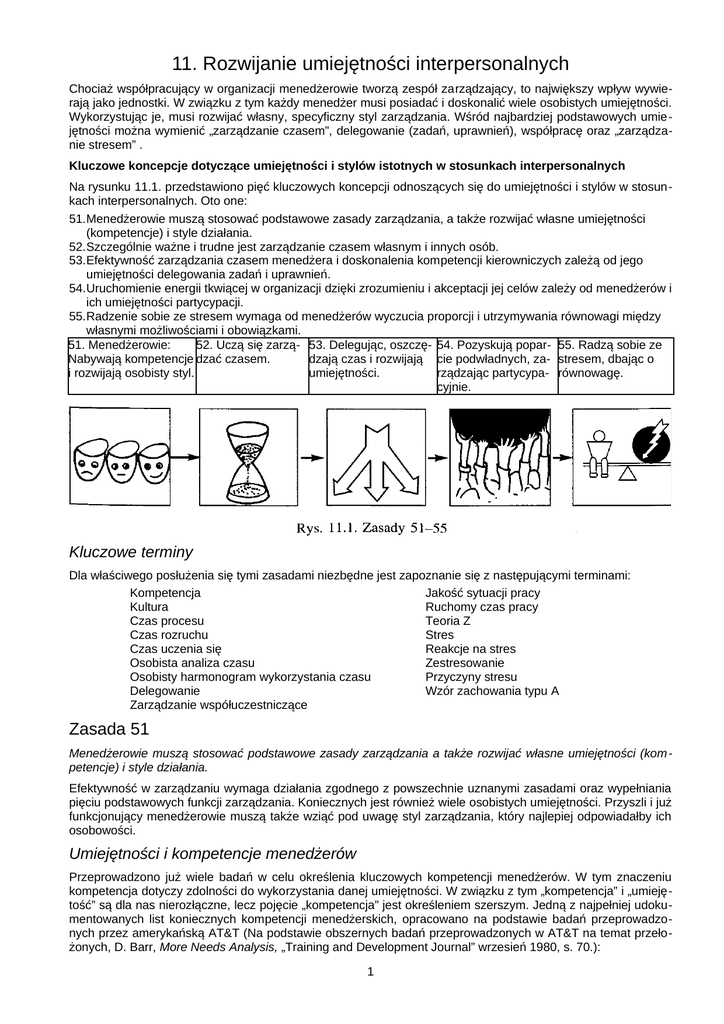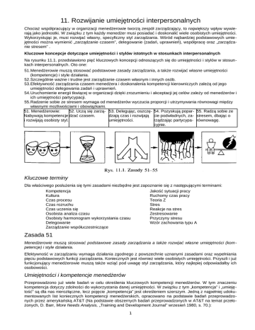 11. Rozwijanie umiejętności interpersonalnych Chociaż współpracujący w organizacji menedżerowie tworzą zespół zarządzający, to największy wpływ wywie rają jako jednostki. W związku z tym każdy menedżer musi posiadać i doskonalić wiele osobistych umiejętności. Wykorzystując je, musi rozwijać własny, specyficzny styl zarządzania. Wśród najbardziej podstawowych umie jętności można wymienić „zarządzanie czasem”, delegowanie (zadań, uprawnień), współpracę oraz „zarządza nie stresem” . Kluczowe koncepcje dotyczące umiejętności i stylów istotnych w stosunkach interpersonalnych Na rysunku 11.1. przedstawiono pięć kluczowych koncepcji odnoszących się do umiejętności i stylów w stosun kach interpersonalnych. Oto one: 51.Menedżerowie muszą stosować podstawowe zasady zarządzania, a także rozwijać własne umiejętności (kompetencje) i style działania. 52.Szczególnie ważne i trudne jest zarządzanie czasem własnym i innych osób. 53.Efektywność zarządzania czasem menedżera i doskonalenia kompetencji kierowniczych zależą od jego umiejętności delegowania zadań i uprawnień. 54.Uruchomienie energii tkwiącej w organizacji dzięki zrozumieniu i akceptacji jej celów zależy od menedżerów i ich umiejętności partycypacji. 55.Radzenie sobie ze stresem wymaga od menedżerów wyczucia proporcji i utrzymywania równowagi między własnymi możliwościami i obowiązkami. 51. Menedżerowie: 52. Uczą się zarzą 53. Delegując, oszczę 54. Pozyskują popar 55. Radzą sobie ze Nabywają kompetencje dzać czasem. dzają czas i rozwijają cie podwładnych, za stresem, dbając o i rozwijają osobisty styl. umiejętności. rządzając partycypa równowagę. cyjnie. Kluczowe terminy Dla właściwego posłużenia się tymi zasadami niezbędne jest zapoznanie się z następującymi terminami: Kompetencja Jakość sytuacji pracy Kultura Ruchomy czas pracy Czas procesu Teoria Z Czas rozruchu Stres Czas uczenia się Reakcje na stres Osobista analiza czasu Zestresowanie Osobisty harmonogram wykorzystania czasu Przyczyny stresu Delegowanie Wzór zachowania typu A Zarządzanie współuczestniczące Zasada 51 Menedżerowie muszą stosować podstawowe zasady zarządzania a także rozwijać własne umiejętności (kom petencje) i style działania. Efektywność w zarządzaniu wymaga działania zgodnego z powszechnie uznanymi zasadami oraz wypełniania pięciu podstawowych funkcji zarządzania. Koniecznych jest również wiele osobistych umiejętności. Przyszli i już funkcjonujący menedżerowie muszą także wziąć pod uwagę styl zarządzania, który najlepiej odpowiadałby ich osobowości. Umiejętności i kompetencje menedżerów Przeprowadzono już wiele badań w celu określenia kluczowych kompetencji menedżerów. W tym znaczeniu kompetencja dotyczy zdolności do wykorzystania danej umiejętności. W związku z tym „kompetencja” i „umieję tość” są dla nas nierozłączne, lecz pojęcie „kompetencja” jest określeniem szerszym. Jedną z najpełniej udoku mentowanych list koniecznych kompetencji menedżerskich, opracowano na podstawie badań przeprowadzo nych przez amerykańską AT&T (Na podstawie obszernych badań przeprowadzonych w AT&T na temat przeło żonych, D. Barr, More Needs Analysis, „Training and Development Journal” wrzesień 1980, s. 70.): 1 kontrolowanie pracy rozwiązywanie problemów planowanie pracy nieformalne komunikowanie ustne dostarczanie informacji zwrotnych o wykonaniu zadań trenowanie podwładnych tworzenie przekazów pisemnych i dokumentów tworzenie i utrzymywanie motywującej atmosfery zarządzanie czasem udział w zebraniach samodoskonalenie doradztwo w sprawach rozwoju kariery zawodowej podwładnych reprezentowanie firmy Inne badania uzupełniły tę listę o takie kompetencje, jak: znajomość podstawowych faktów, wyczulenie na wy darzenia, wytrzymałość emocjonalna, samopoznanie, delegowanie, innowacyjność, umiejętność działania w kontaktach z bezpośrednimi zwierzchnikami oraz zdolność współpracy z ludźmi spoza oddziału lub firmy. Szczególnego znaczenia wśród wymienianych kompetencji nabiera wynikająca z nich potrzeba nabycia lub roz winięcia w wysokim stopniu osobistych umiejętności, a w szczególności zarządzania czasem, delegowania, współuczestnictwa oraz zarządzania stresem. W niniejszym rozdziale omówione zostaną te właśnie cztery kom petencje. Szereg stylów Kompetencje można nabyć i doskonalić. Istnieje jednak wiele zastrzeżeń co do możliwości zmiany osobowości ludzkiej. Chociaż część badań sugeruje, że można doskonalić poprzez szkolenie różne style przywódcze, to jednak wiele autorytetów w tej dziedzinie jest odmiennego zdania. Istnieje natomiast powszechna zgoda co do faktu, że najważniejsze jest utrzymanie integralności i wewnętrznej zgodności własnego stylu. Pomocne będzie zastanowienie się nad cechami, które mają wpływ na styl zarządzania (kierowania) danej oso by. Poniższe zestawienie ukazuje skrajności różnych kontinuów: Przywództwo od autokratycznego do współuczestniczącego Stosunki wzajemne od chłodnych do ciepłych, od płytkich do głębokich Stosunek do ryzyka od szukania ryzyka do unikania ryzyka Rozwiązywanie problemów od intuicyjnego do logicznego Podejście do planowania od krótkowzrocznego lub niedbałego do wizjonerskiego i precyzyjnego Podejmowanie decyzji od dwuznacznego lub impulsywnego do stanowczego i rozstrzygającego Zorientowanie na działania od zwlekania po inicjowanie Gdyby drugi wymieniony powyżej zestaw skrajnych cech był uważany za odpowiedni dla każdego menedżera, to jasne jest, że nieliczni menedżerowie spełnialiby te kryteria. Na szczęście zarządzanie dostarcza tak różno rodnych sytuacji i wymagań, że pozostaje wiele miejsca dla menedżerów, których osobowość jest mieszanką tych kryteriów. Wynika z tego ogólna wskazówka, że każdy menedżer powinien s