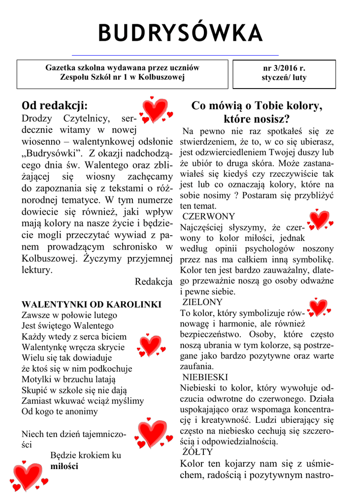 BUDRYSÓWKA Gazetka szkolna wydawana przez uczniów Zespołu Szkół nr 1 w Kolbuszowej Od redakcji: Drodzy Czytelnicy, serdecznie witamy w nowej wiosenno – walentynkowej odsłonie „Budrysówki”. Z okazji nadchodzącego dnia św. Walentego oraz zbliżającej się wiosny zachęcamy do zapoznania się z tekstami o różnorodnej tematyce. W tym numerze dowiecie się również, jaki wpływ mają kolory na nasze życie i będziecie mogli przeczytać wywiad z panem prowadzącym schronisko w Kolbuszowej. Życzymy przyjemnej lektury. Redakcja WALENTYNKI OD KAROLINKI Zawsze w połowie lutego Jest świętego Walentego Każdy wtedy z serca biciem Walentynkę wręcza skrycie Wielu się tak dowiaduje że ktoś się w nim podkochuje Motylki w brzuchu latają Skupić w szkole się nie dają Zamiast wkuwać wciąż myślimy Od kogo te anonimy Niech ten dzień tajemniczości Będzie krokiem ku miłości nr 3/2016 r. styczeń/ luty Co mówią o Tobie kolory, które nosisz? Na pewno nie raz spotkałeś się ze stwierdzeniem, że to, w co się ubierasz, jest odzwierciedleniem Twojej duszy lub że ubiór to druga skóra. Może zastanawiałeś się kiedyś czy rzeczywiście tak jest lub co oznaczają kolory, które na sobie nosimy ? Postaram się przybliżyć ten temat. CZERWONY Najczęściej słyszymy, że czerwony to kolor miłości, jednak według opinii psychologów noszony przez nas ma całkiem inną symbolikę. Kolor ten jest bardzo zauważalny, dlatego przeważnie noszą go osoby odważne i pewne siebie. ZIELONY To kolor, który symbolizuje równowagę i harmonie, ale również bezpieczeństwo. Osoby, które często noszą ubrania w tym kolorze, są postrzegane jako bardzo pozytywne oraz warte zaufania. NIEBIESKI Niebieski to kolor, który wywołuje odczucia odwrotne do czerwonego. Działa uspokajająco oraz wspomaga koncentrację i kreatywność. Ludzi ubierający się często na niebiesko cechują się szczerością i odpowiedzialnością. ŻÓŁTY Kolor ten kojarzy nam się z uśmiechem, radością i pozytywnym nastro- BUDRYSÓWKA jem. Ludzie, którzy zakładają ubrania w tym kolorze, są przeważnie marzycielami, często myślą o „niebieskich migdałach”, a także chcieliby prowadzić swobodne życie bez przeszkód. BRĄZOWY Brąz symbolizuje dojrzałość oraz stabilność. Osoby noszące ten kolor najczęściej mają wybraną drogę życiową, a także ustalone priorytety, są również bardzo rodzinni. Ubrania w tym kolorze są bardzo dobrym rozwiązaniem dla osób, które żyją w ciągłym stresie. A. źródło: Google grafika ************ Gdy ktoś cię kocha, wybaczyć ci umie, ale także wszystko zrozumie. Gdy złapie cię za ręce, szybciej zacznie bić twoje serce. Pojawi się szczęście i uczucie miłości, a w głębi będzie dużo radości. ************ Pamiętaj ten dzień, nie musi być tylko miłosny, może być również bardzo radosny. Zaproś do kina swoją przyjaciółkę, jak będzie głodna, daj jej swą bułkę. Złóż jej walentynkowe życzenia i powiedz do niej "100 lat Renia"! Andżelika KILKA KSIĄŻEK NA DŁUGIE WIECZORY James Dashner „Więzień Labiryntu” Kiedy Thomas budzi się w ciemnej windzie, jedyną rzeczą jaką pamięta, jest jego imię. Okazuje się, że wylądował w Strefie pełnej nastoletnich chłopców – otwartej przestrzeni otoczonej wielkimi murami, która znajduje się w centrum ogromnego i przerażającego Labiryntu. Gdy następnego dnia po Thomasie do Strefy trafia pierwsza dziewczyna z tajemniczą wiadomością, wszyscy Streferzy zdają sobie sprawę, że od tej pory nic już nie będzie takie same. Pierwszy tom trylogii „Więzień Labiryntu”, stworzonej przez amerykańskiego autora Jamesa Dashnera. Pełen akcji i nieustającego napięcia bestseller. Bardzo gorąco polecam! John Green „Papierowe miasta” Quentin Jacobsen ma osiemnaście lat i od zawsze jest zakochany w zbuntowanej sąsiadce Margo Roth Spiegelman. Pewnego, nudnego wieczoru w pokoju chłopaka zjawia się Margo w stroju nindży i wciąga go w niezły bałagan, po czym znika. Quentin wyrusza na poszukiwanie dziewczyny, idąc tropem skomplikowanych wskazówek, które zostawiła tylko dla niego. Powieść jednego z najpopularniejszych obecnie autorów literatury młodzieżowej na świecie. Poruszająca i tajemnicza. Polecam! BUDRYSÓWKA Gayle Forman „Ten jeden dzień” Życie Allyson jest uporządkowane i zaplanowane. Jednak wszystko się zmienia, gdy pod koniec swoich europejskich wakacji poznaje Willema, który różni się od niej pod każdym względem. Allyson zgadza się pojechać z nim do Paryża na jeden dzień, co jest bardzo nietypową dla niej decyzją... Wciągająca opowieść o niezwykłych przypadkach losu, napisana przez autorkę „Zostań, jeśli kochasz” i „Wróć, jeśli pamiętasz”. Gorąco polecam. Rainbow Rowell „Eleonora & Park” Dwoje outsiderów, jedna niezwykła miłość. Oto opowieść o dwójce szesnastolatków urodzonych pod nieszczęśliwą gwiazdą. Są w pełni świadomi tego, że pierwszej miłości prawie nigdy nie udaje się przetrwać, ale mimo wszystko na tyle zdesperowani i odważni, aby dać jej szansę. Zabawna i szczera historia o nastolatkach będących kłębkami emocji, którzy szukają swojego miejsca na świecie. Polecam. xxx Śniegu pełno dookoła, Wszyscy łapią zimne koła, Z których powstał już bałwanek, By umilić dzieciom ranek. Węgielkami dekorują, Marchewkami nos formują, Mimo zimna corocznego, Zróbmy razem coś pięknego. Gry wyobraźni Gra. Większość z nas, słysząc to słowo, natychmiast kojarzy je z grą komputerową lub planszową. Istnieje jednak jeszcze jeden rodzaj gier, o których większość obecnego młodego pokolenia (125 roku życia) nie ma pojęcia. Mowa tu o tak zwanych „Grach fabularnych” . Są one połączeniem gier planszowych, opowiadania opowieści i odgrywania ról. Były one bardzo popularne wśród amerykańskich Nerdów w czasach osiemdziesiątych i dziew