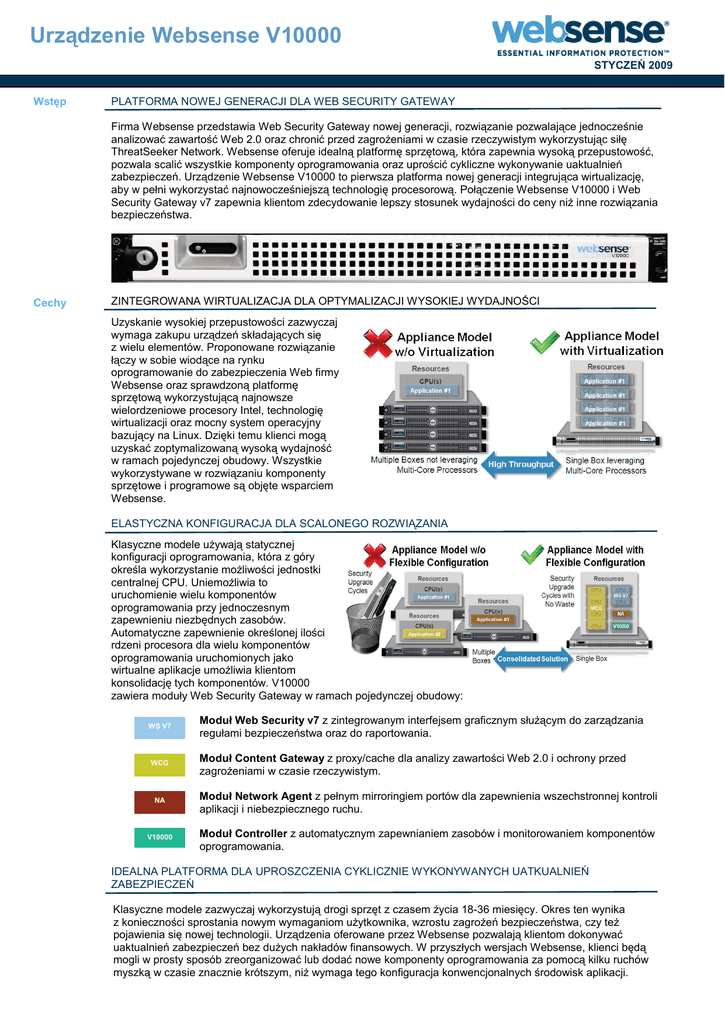 Urządzenie Websense V10000 STYCZEŃ 2009 Wstęp PLATFORMA NOWEJ GENERACJI DLA WEB SECURITY GATEWAY Firma Websense przedstawia Web Security Gateway nowej generacji, rozwiązanie pozwalające jednocześnie analizować zawartość Web 2.0 oraz chronić przed zagroŜeniami w czasie rzeczywistym wykorzystując siłę ThreatSeeker Network. Websense oferuje idealną platformę sprzętową, która zapewnia wysoką przepustowość, pozwala scalić wszystkie komponenty oprogramowania oraz uprościć cykliczne wykonywanie uaktualnień zabezpieczeń. Urządzenie Websense V10000 to pierwsza platforma nowej generacji integrująca wirtualizację, aby w pełni wykorzystać najnowocześniejszą technologię procesorową. Połączenie Websense V10000 i Web Security Gateway v7 zapewnia klientom zdecydowanie lepszy stosunek wydajności do ceny niŜ inne rozwiązania bezpieczeństwa. Cechy ZINTEGROWANA WIRTUALIZACJA DLA OPTYMALIZACJI WYSOKIEJ WYDAJNOŚCI Uzyskanie wysokiej przepustowości zazwyczaj wymaga zakupu urządzeń składających się z wielu elementów. Proponowane rozwiązanie łączy w sobie wiodące na rynku oprogramowanie do zabezpieczenia Web firmy Websense oraz sprawdzoną platformę sprzętową wykorzystującą najnowsze wielordzeniowe procesory Intel, technologię wirtualizacji oraz mocny system operacyjny bazujący na Linux. Dzięki temu klienci mogą uzyskać zoptymalizowaną wysoką wydajność w ramach pojedynczej obudowy. Wszystkie wykorzystywane w rozwiązaniu komponenty sprzętowe i programowe są objęte wsparciem Websense. ELASTYCZNA KONFIGURACJA DLA SCALONEGO ROZWIĄZANIA Klasyczne modele uŜywają statycznej konfiguracji oprogramowania, która z góry określa wykorzystanie moŜliwości jednostki centralnej CPU. UniemoŜliwia to uruchomienie wielu komponentów oprogramowania przy jednoczesnym zapewnieniu niezbędnych zasobów. Automatyczne zapewnienie określonej ilości rdzeni procesora dla wielu komponentów oprogramowania uruchomionych jako wirtualne aplikacje umoŜliwia klientom konsolidację tych komponentów. V10000 zawiera moduły Web Security Gateway w ramach pojedynczej obudowy: WS V7 WCG Moduł Web Security v7 z zintegrowanym interfejsem graficznym słuŜącym do zarządzania regułami bezpieczeństwa oraz do raportowania. Moduł Content Gateway z proxy/cache dla analizy zawartości Web 2.0 i ochrony przed zagroŜeniami w czasie rzeczywistym. NA Moduł Network Agent z pełnym mirroringiem portów dla zapewnienia wszechstronnej kontroli aplikacji i niebezpiecznego ruchu. V10000 Moduł Controller z automatycznym zapewnianiem zasobów i monitorowaniem komponentów oprogramowania. IDEALNA PLATFORMA DLA UPROSZCZENIA CYKLICZNIE WYKONYWANYCH UATKUALNIEŃ ZABEZPIECZEŃ Klasyczne modele zazwyczaj wykorzystują drogi sprzęt z czasem Ŝycia 18-36 miesięcy. Okres ten wynika z konieczności sprostania nowym wymaganiom uŜytkownika, wzrostu zagroŜeń bezpieczeństwa, czy teŜ pojawienia się nowej technologii. Urządzenia oferowane przez Websense pozwalają klientom dokonywać uaktualnień zabezpieczeń bez duŜych nakładów finansowych. W przyszłych wersjach Websense, klienci będą mogli w prosty sposób zreorganizować lub dodać nowe komponenty oprogramowania za pomocą kilku ruchów myszką w czasie znacznie krótszym, niŜ wymaga tego konfiguracja konwencjonalnych środowisk aplikacji. Urządzenie Websense V10000 STYCZEŃ 2009 Zalety WZROST WYDAJNOŚCI SYSTEMU Dla zwiększenia stosunku wydajności do ceny przy wdroŜeniu kaŜdego rozwiązania Web Security Gateway. Poddany testom – Przepustowość pasma na poziomie 250 Mbps przy włączonych wszystkich funkcjach (wartość średnia; róŜni się w zaleŜności od środowiska sieciowego). Bezpieczny – Dopracowany i silny system operacyjny bazujący na Linux. Nie wymaga Ŝadnych dodatkowych działań po stronie uŜytkownika. Z pełnym wsparciem – Wszystkie komponenty sprzętowe i programowe są objęte wsparciem Websense wraz z zarządzaniem łatami systemowymi (patchami). ZMNIEJSZENIE KOSZTÓW Poniesionych na idealną platformę do wdroŜenia rozwiązań Websense Essential Information Protection. Prostota – Łatwy sposób wdraŜania i wspierania cyklicznych uaktualnień zabezpieczeń w porównaniu do konwencjonalnych środowisk aplikacji. Wydajność – Wirtualne aplikacje automatycznie zapewniają maksymalną ilość zasobów i zwiększają skalowalność. Odporność – Awaria pojedynczej wirtualnej aplikacji nie wpływa na poziom świadczonych usług. Spec. PLATFORMA, ZASILANIE I INTERFEJSY Serwer w trybie wysokiej dostępności o rozmiarze 1U montowany w szafie rack. (1.67 x 16.7 x 30.4 cali lub 4.26 x 42.6 x 77.2 cm [H x W x D] oraz 35.9 lbs lub 16.5 kg) Zasilanie: Redundantny zasilacz 670W z monitoringiem. (1+1 zasilacze typu hot-plug i chłodzeniem o param. 1.61 Amps @ 208 V i 1143 BTU/hr) Porty: 4 porty Gigabit Ethernet z moŜliwością rozbudowy (10/100/1000Mbps). Forma: PROCESOR, PRZESTRZEŃ DYSKOWA I PAMIĘĆ CPU: Dyski: RAM: ® Dwa procesory Quad-Core Intel Xeon . (2x 5400 series 3.0 GHz procesory z 2x6MB Cache) 146GB lustrzanej przestrzeni dla aplikacji i 146GB lustrzanej przestrzeni dla cache. (dyski 4x146GB SAS 10K ze sprzętowym kontrolerem RAID i cache z potrzymaniem bateryjnym) Pamięć 16GB DDR2 (8x2GB DIMM). ŚRODOWISKO SIECIOWE, DOSTĘPNOŚĆ I SKALOWALNOŚĆ Topologie: Content Gateway – explicit/transparent forward proxy, proxy chain, multi-node clustering, zrównowaŜenie obciąŜenia WCCP, pliki auto-konfiguracji proxy. Network Agent – monitorowanie i blokowanie protokołów w trybie podsłuchu. Protokoły/Porty: Content Gateway – proxy dla HTTP, HTTPS i FTP over HTTP przy uŜyciu portów 80 i 443. Network Agent – kontrola ponad 130 protokołów (zapytaj o listę) poprzez wszystkie monitorowane porty. Identyfikacja i uwierzytelnianie: Dostępne metody transparentnej identyfikacji i/lub manualnego uwierzytelniania. (Domain Controller Agent, Logon Agent, RADIUS Agent, eDirectory Agent)