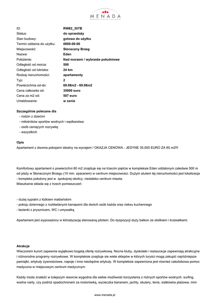 ID: RW82_307B Status: do sprzedaży Stan budowy: gotowa do użytku Termin oddania do użytku: 0000-00-00 Miejscowość: Słoneczny Brzeg Nazwa: Eden Położenie: Nad morzem / wybrzeże południowe Odległość od morza: 500 Odległość od lotniska: 24 km Rodzaj nieruchomości: apartamenty Typ: 2 Powierzchnia od-do: 69.08m2 - 69.08m2 Cena całkowita od: 35000 euro Cena za m2 od: 507 euro Umeblowanie: w cenie Szczególnie polecane dla - rodzin z dziećmi - miłośników sportów wodnych i wędkarstwa - osób ceniących rozrywkę - wszystkich Opis Apartament z dwoma pokojami idealny na wynajem ! OKAZJA CENOWA - JEDYNE 35.000 EURO ZA 60 m2!!! Komfortowy apartament o powierzchni 60 m2 znajduje się na trzecim piętrze w kompleksie Eden oddalonym zaledwie 500 m od plaży w Słonecznym Brzegu (10 min. spacerem) w centrum miejscowości. Dużym atutem tej nieruchomości jest lokalizacja - kompleks położony jest w spokojnej okolicy, niedaleko centrum miasta. Mieszkanie składa się z trzech pomieszczeń: - dużej sypialni z łóżkiem małżeńskim - pokoju dziennego z rozkładanymi kanapami dla dwóch osób każda oraz neksu kuchennego - łazienki z prysznicem, WC i umywalką Apartament jest wyposażony w klimatyzację sterowaną pilotem. Do dyspozycji duży balkon ze stolikiem i krzesełkami. Atrakcje Wieczorem kurort zapewnia wyjątkowo bogatą ofertę rozrywkową. Nocne kluby, dyskoteki i restauracje zapewniają atrakcyjne i różnorodne programy rozrywkowe. W kompleksie znajduje sie wiele sklepów w których turyści mogą zakupić najróżniejsze pamiątki, artykuły żywnościowe, napoje i inne niezbędne artykuły. W kompleksie zapewniona jest również całodobowa pomoc medyczna w miejscowym centrum medycznym. Każdy może znaleźć w tutejszym resorcie wygodna dla siebie możliwość korzystania z różnych sportów wodnych: surfing, wodne narty, czy podróż spadochronem za motorówką, wycieczka bananem, jachty, skutery, tenis, siatkówka plażowa, mini www.menada.pl golf, bowling, sporty dla wyczynowców, profesjonalistów i amatorów. Jest tu także genialny raj dla dzieci - dużo różnorodnych gier, baseny dla dzieci, zjeżdżalnie, carting, trampoliny. Cechy Dlaczego warto? nieruchomość od polskiego właściciela umeblowanie i wyposażenie w cenie atrakcyjna lokalizacja Cechy: parking basen klimatyzacja panoramiczna winda Usługi OPŁATA ZA ZARZĄDZANIE CZĘŚCIAMI WSPÓLNYMI: Nasza firma dba o utrzymanie apartamentu w ciągu roku - Dla naszych Klientów zapewniamy utrzymanie nieruchomości, ochronę 24 h przez cały rok, oświetlenie, bezpieczeństwo elektryczne i wodne, naprawy, sprzątanie i czyszczenie części wspólnych, zieleni, czyszczenie apartamentu czy też płatności rachunków. Uzyskiwanie dodatkowych dochodów z ewentualnego wynajmu apartamentu - Zapewniamy bowiem również organizację wynajmu apartamentu. obsługa posprzedażowa. Zasady płatności Zasady płatności: Cena winna być uiszczona w całości przelewem na konto właściciela przed podpisaniem aktu notarialnego, w przypadku podpisania umowy przedwstępnej niezbędna będzie wpłata zadatku w wysokości 2 000 EUR Koszty: Należy pamiętać, iż oprócz ceny za nieruchomość dochodzi koszt związany z opłatą notarialną u Notariusza (jest to ok. 4,5 % wartości zakupu). www.menada.pl