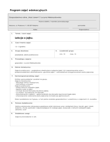 Program zajęć edukacyjnych Gospodarstwo rolne „Nad Jarem”/ Lucyna Niebrzydowska ______________________________________________________________________________________________________________________ Nazwa obiektu / nazwisko prowadzącego Mezowo, ul. Piaskowa 11, 83-307 Kiełpino _________________________________________________________________________________ Adres 1. pomorskie _________________________________ Województwo Temat / tytuł zajęć: Lekcja o jajku. 2. Czas trwania zajęć: 1,5 – 2 godziny 3. Grupa docelowa: przedszkole, szkoła podstawowa 5. 4. Liczebność grupy: min. 10 max. 15 Prowadzący zajęcia: gospodarz – Lucyna Niebrzydowska 6. Zakres tematyczny: Zajęcia praktyczno – poglądowe obejmujące rodzenie jajek i ich rozpoznawanie wraz z przeprowadzeniem doświadczenia „gumowe jajko” i samodzielnym przygotowaniem pasty jajecznej . 7. Harmonogram/przebieg zajęć: Krótkie wprowadzenie i podział na grupy. Zajęcia teoretyczne: - dlaczego rolnicy hodują kury, - mini konkurs o kurach. Zajęcia praktyczne: - pokaz różnych rodzajów jajek, - zgadnij czyje to jajko, - co kryje się pod skorupką (budowa jajka), - co można wyczarować ze skorupki, - doświadczenie z jajkiem – gdzie podziała się skorupka (gumowe/nagie jajo), - własnoręcznie wykonanie pasty jajecznej na bazie jaj ugotowanych. Dzieci podzielone na 2 grupy, w tym jedna zwiedza gospodarstwo i uczestniczy w zajęciach nt. owadów. 8. Pomoce dydaktyczne: tablice edukacyjne obrazujące grzebiące ptaki domowe wraz z pisklętami (kury, kaczki, gęsi, indyki, bażanty, strusie, perliczki) i odpowiadające im rodzaje jajek, koszyczek z różnymi rodzajami jajek, szklanka, ocet 9. Dodatkowe uwagi: Zajęcia prowadzone w sali.