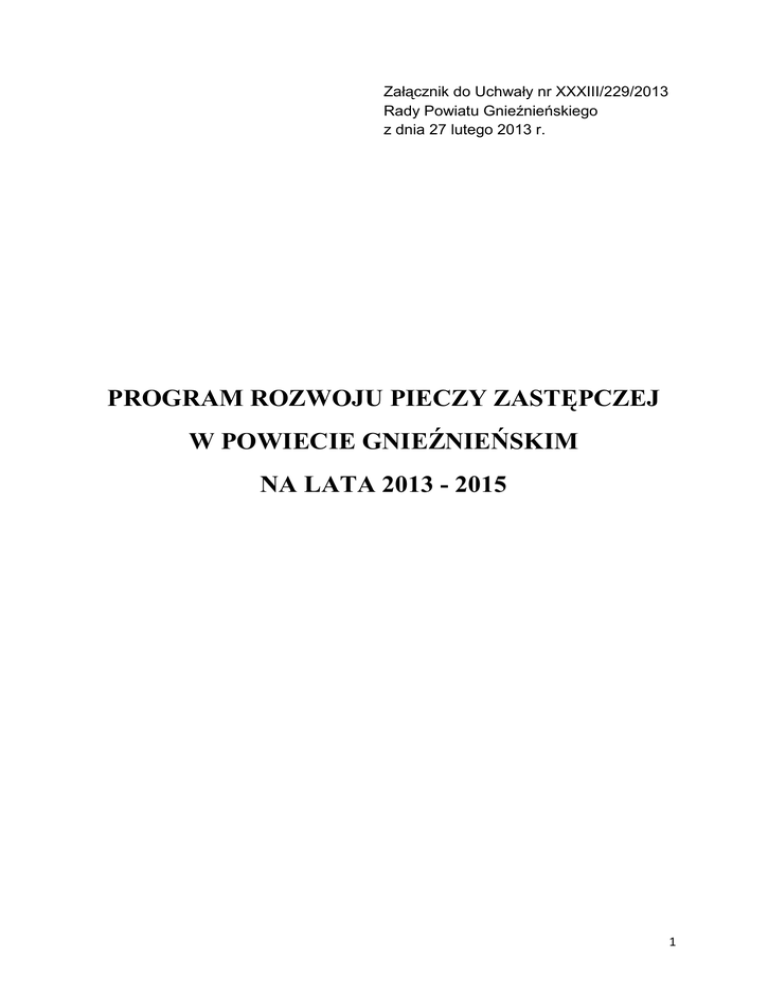 Załącznik do Uchwały nr XXXIII/229/2013 Rady Powiatu Gnieźnieńskiego z dnia 27 lutego 2013 r. PROGRAM ROZWOJU PIECZY ZASTĘPCZEJ W POWIECIE GNIEŹNIEŃSKIM NA LATA 2013 - 2015 1 SPIS TREŚCI WSTĘP …………………………………………………………………………...……….… 3 I. DIAGNOZA SYSTEMU WSPARCIA DZIECKA I RODZINY NA TERENIE POWIATU GNIEŹNIEŃSKIEGO …………………………….….…. 4 1. Stan obecny i działania w zakresie wspierania rodziny w środowisku lokalnym…………………………………………………………………………..…. 4 2. Rodziny zastępcze………………………………………………………….………... 6 3. Opieka i wychowanie w placówkach opiekuńczo-wychowawczych……...............… 8 4. Proces usamodzielniania wychowanków pieczy zastępczej……………………....... 10 5. Analiza ponoszonych przez powiat gnieźnieński kosztów – świadczenia dla rodzin zastępczych oraz dla pełnoletnich wychowanków rodzin zastępczych i placówek opiekuńczo-wychowawczych w latach 2009-2012 ...…. …13 II. CELE PROGRAMU ………………………………………………………..………….. 13 III. CZAS REALIZACJI I ADRESACI PROGRAMU…………….………………….... 14 IV. HARMONOGRAM REALIZACJI ZADAŃ…………………………………..….…. 14 Cel 1. Rozwój i wsparcie rodzinnej pieczy zastępczej …………….…….…………….…… 14 Cel 2. Dążenie w instytucjonalnej pieczy zastępczej do osiągnięcia modelu wychowawczego zbliżonego do rodzinnego ......………………………………...……………………... 16 Cel 3. Praca na rzecz powrotu dziecka do rodziny biologicznej ………………...…………17 Cel 4. Wspieranie usamodzielniających się wychowanków opuszczających pieczę zastępczą………………………….………………………………………........ 19 Cel 5. Współpraca z instytucjami działającymi na rzecz dziecka i rodziny………………… 20 V. OKOLICZNOŚCI MAJACE WPŁYW NA REALIZACJE PROGRAMU………... 20 VI. KOORDYNACJA PROGRAMU……………………………………………………... 21 VII. ŹRÓDŁA FINANSOWANIA PROGRAMU…………………………………….…. 21 VIII. MONITORING I EWALUACJA PROGRAMU………………………..……....... 21 2 WSTĘP Rodzina jest najlepszym środowiskiem rozwojowym dla dziecka. Jest społecznością powołaną do kształtowania życia jednostkowego i stanowi podstawę życia społecznego. Rodzina tworzy nowe życie, zapewnia jego przetrwanie i buduje społeczeństwo. Od stanu rodzin i ich umiejętności wychowawczych zależy przyszłość państwa. Prof. Gary Becker wyliczył, że w rodzinie powstaje najwięcej bogactwa - kapitał ludzki. Becker wykazał, że aż 80 proc. zasobów bogatych krajów stanowi kapitał ludzki, na resztę składają się zasoby materialne, bogactwa naturalne i urządzenia. W "Traktacie o rodzinie" Becker twierdzi, że tylko w rodzinie kształtują się cechy decydujące o żywotności i funkcjonalności społeczeństwa: solidarność, współpraca, poszanowanie dla drugiego człowieka, zdolność do poświęceń, zamiłowanie do porządku czy punktualność. Zdarza się, że w rodzinach z różnych przyczyn funkcje opiekuńczo – wychowawcze nie mogą być wypełnione. W takich sytuacjach, dla dobra najmłodszych, środowisko rodzinne może zostać zastąpione. Przyczynami konieczności umieszczenia dzieci w pieczy zastępczej zainteresowała się prof. Józefina Hrynkiewicz. W swoich badaniach pani profesor przeanalizowała proces umieszczania dzieci w placówkach opiekuńczo – wychowawczych. Powodem umieszczania dziecka poza rodziną jest patologia środowiska, w którym żyje dziecko oraz systemowa dysfunkcja instytucji powołanych do organizowania pracy z rodziną. Choroba alkoholowa rodziców wymieniana jest na pierwszym miejscu jako przyczyna odejścia dzieci z domu. Innymi przyczynami są: przemoc, dezorganizacja życia rodzinnego, niewydolność w wypełnianiu funkcji opiekuńczo–wychowawczych. Coraz częściej pojawia się też problem uzależnienia rodziców od środków odurzających innych niż alkohol czy wykorzystywanie seksualne dzieci. Prawie wszystkie dzieci umieszczone w placówkach opiekuńczo–wychowawczych pochodzą z rodzin żyjących w ubóstwie. W opiece zastępczej przebywają także dzieci rodziców, którzy ze względu na stan zdrowia (choroba psychiczna czy niepełnosprawność ruchowa) nie mogą osobiście sprawować opieki nad dzieckiem. Jako nowy problem pojawia się tzw. eurosieroctwo czyli porzucenie dzieci przez rodziców wyjeżdżających do pracy za granicę. Jak wynika z badań prof. J. Hrynkiewicz, znamienne jest, że problemy rodziny związane z wypełnianiem przez nią funkcji opiekuńczo– wychowawczej pojawiają się dopiero, gdy dziecko rozpoczyna naukę w szkole. Wtedy jednak najczęściej zachodzi już konieczność odizolowania dziecka od rodziny. Charakterystyczne też jest, że dzieci z rodzin zagrożonych dysfunkcjami na ogół nie są objęte wychowaniem przedszkolnym. W tej sytuacji problemy rodziny, narastające od dawna, nie są zauważane na czas, a rodzina nie otrzymuje skutecznej pomocy. Zbudowanie zintegrowanego systemu pieczy zastępczej, który zapewni skuteczna ochronę dzieciom i pomoc rodzinom w kryzysie jest głównym celem tego Programu. Niniejszy dokument określający kierunki rozwoju pieczy zastępczej, opracowany został przez Powiatowe Centrum Pomocy Rodzinie w Gnieźnie. Powstał jako efekt dyskusji w zespole, wymiany informacji oraz doświadczeń w postępowaniu w obrębie ustalania celów i kierunków działania zmierzających do rozwoju pieczy zastępczej. 3 W Programie wskazano na konieczność podjęcia działań rozwijających i wspierających rodzinną pieczę zastępczą oraz usamodzielniających się wychowanków, a także dz