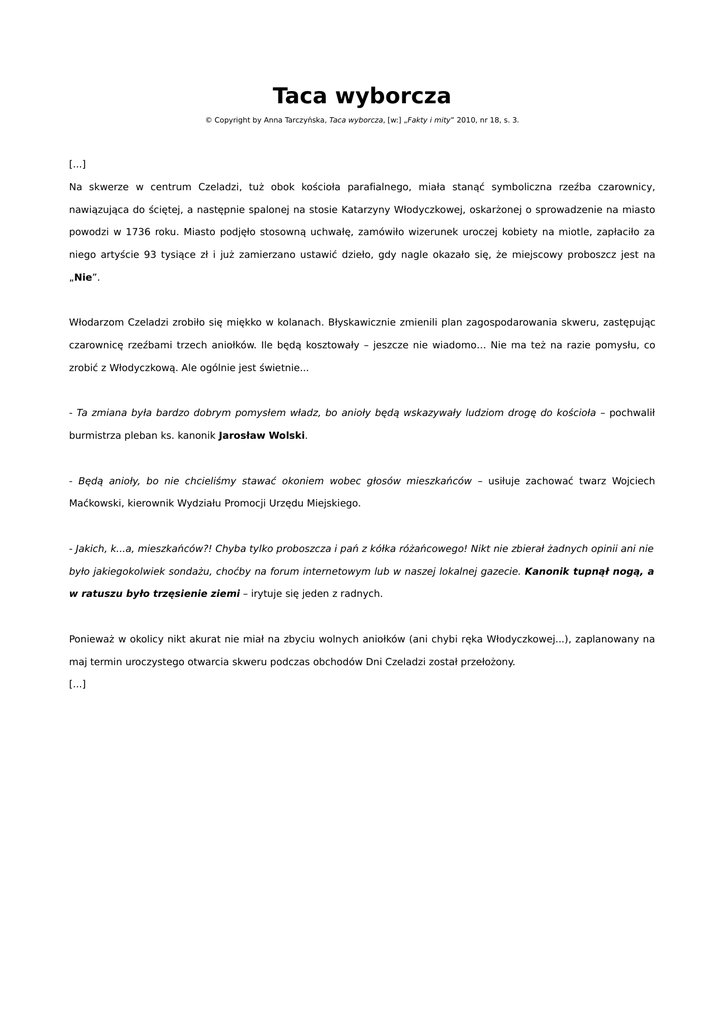 Taca wyborcza © Copyright by Anna Tarczyńska, Taca wyborcza, [w:] „Fakty i mity” 2010, nr 18, s. 3. [...] Na skwerze w centrum Czeladzi, tuż obok kościoła parafialnego, miała stanąć symboliczna rzeźba czarownicy, nawiązująca do ściętej, a następnie spalonej na stosie Katarzyny Włodyczkowej, oskarżonej o sprowadzenie na miasto powodzi w 1736 roku. Miasto podjęło stosowną uchwałę, zamówiło wizerunek uroczej kobiety na miotle, zapłaciło za niego artyście 93 tysiące zł i już zamierzano ustawić dzieło, gdy nagle okazało się, że miejscowy proboszcz jest na „Nie”. Włodarzom Czeladzi zrobiło się miękko w kolanach. Błyskawicznie zmienili plan zagospodarowania skweru, zastępując czarownicę rzeźbami trzech aniołków. Ile będą kosztowały – jeszcze nie wiadomo… Nie ma też na razie pomysłu, co zrobić z Włodyczkową. Ale ogólnie jest świetnie... - Ta zmiana była bardzo dobrym pomysłem władz, bo anioły będą wskazywały ludziom drogę do kościoła – pochwalił burmistrza pleban ks. kanonik Jarosław Wolski. - Będą anioły, bo nie chcieliśmy stawać okoniem wobec głosów mieszkańców – usiłuje zachować twarz Wojciech Maćkowski, kierownik Wydziału Promocji Urzędu Miejskiego. - Jakich, k...a, mieszkańców?! Chyba tylko proboszcza i pań z kółka różańcowego! Nikt nie zbierał żadnych opinii ani nie było jakiegokolwiek sondażu, choćby na forum internetowym lub w naszej lokalnej gazecie. Kanonik tupnął nogą, a w ratuszu było trzęsienie ziemi – irytuje się jeden z radnych. Ponieważ w okolicy nikt akurat nie miał na zbyciu wolnych aniołków (ani chybi ręka Włodyczkowej...), zaplanowany na maj termin uroczystego otwarcia skweru podczas obchodów Dni Czeladzi został przełożony. [...]