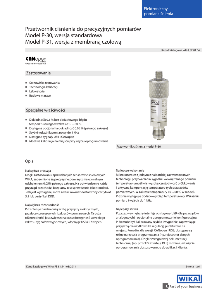 Elektroniczny pomiar ciśnienia Przetwornik ciśnienia do precyzyjnych pomiarów Model P-30, wersja standardowa Model P-31, wersja z membraną czołową Karta katalogowa WIKA PE 81.54 Zastosowanie Stanowiska testowania Technologia kalibracji Laboratoria Budowa maszyn Specjalne właściwości Dokładność: 0.1 % bez dodatkowego błędu temperaturowego w zakresie10 ... 60 °C Dostępna opcjonalna dokładność 0.05 % (pełnego zakresu) Szybki wskaźnik pomiarowy do 1 kHz Dostępne sygnały USB i CANopen Możliwa kalibracja na miejscu przy użyciu oprogramowania Przetwornik ciśnienia model P-30 Opis Najwyższa precyzja Dzięki zastosowaniu sprawdzonych sensorów ciśnieniowych WIKA, zapewnione są precyzyjne pomiary z maksymalnym odchyleniem 0.05% pełnego zakresu. Na potwierdzenie każdy przyrząd przechodzi bezpłatny test sprawdzenia jako standard. Jeśli jest wymagane, może zostać również dostarczony certyfikat 3.1 lub certyfikat DKD. Największa różnorodność P-3x oferuje bardzo dużą liczbę przyłączy elektrycznych, przyłączy procesowych i zakresów pomiarowych. Ta duża różnorodność jest zwiększona przez dostępność szerokiego zakresu sygnałów wyjściowych, włączając USB i CANopen. Karta katalogowa WIKA PE 81.54 ∙ 08/2011 Najlepsze wykonanie Mikrokontroler z jednym z najbardziej zaawansowanych technologii przytwarzania sygnału i wewnętrznego pomiaru temperatury umożliwia wysoką częstotliwość próbkowania i aktywną kompensację temperatury tych przyrządów pomiarowych. W zakresie temperatury 10 ... 60 °C w modelu P-3x nie występuje dodatkowy błąd temperaturowy. Wskaźniki pomiaru i wyjścia do 1 kHz. Najlepszy serwis Poprzez wewnętrzny interfejs obsługowy USB (dla przyrządów analogowych) i opcjonalne oprogramowanie konfiguracyjne, P-3x może być kalibrowany szybko i wygodnie, zapewniając przyjazną dla użytkownika regulację punktu zero na miejscu. Ponadto, dla wersji CANopen i USB, dostępne są różne narzędzia programowania (np. rejestrator danych oprogramowania). Dzięki szczegółowej dokumentacji technicznej (np. protokół interfejs, DLL) możliwe jest użycie oprogramowania dostosowanego do aplikacji klienta. Strona 1 z 6 Zakresy pomiarowe Ciśnienie względne bar psi 0 ... 0.25 0 ... 0.4 0 ... 0.6 0 ... 1 0 ... 1.6 0 ... 2.5 0 ... 4 0 ... 6 0 ... 10 0 ... 16 0 ... 25 0 ... 40 0 ... 60 0 ... 100 0 ... 160 0 ... 250 0 ... 400 0 ... 600 0 ... 1000 0 ... 5 0 ... 10 0 ... 15 0 ... 25 0 ... 30 0 ... 50 0 ... 60 0 ... 100 0 ... 160 0 ... 200 0 ... 250 0 ... 300 0 ... 400 0 ... 500 0 ... 600 0 ... 750 0 ... 800 0 ... 1000 1) 0 ... 1500 0 ... 2000 0 ... 3000 0 ... 5000 0 ... 10000 0 ... 0.4 0 ... 0.6 0 ... 1 0 ... 1.6 0 ... 2.5 0 ... 4 0 ... 6 0 ... 5 0 ... 10 0 ... 15 0 ... 25 0 ... 30 0 ... 50 0 ... 60 0 ... 100 0 ... 160 0 ... 200 Ciśnienie absolutne bar 0 ... 0.25 0 ... 10 psi Podciśnienienie i zakresy +/bar psi -1 ... 0 -30 inHG ... 0 -1 ... 0.6 -30 inHG ... 15 -1 ... 1.5 -30 inHG ... 30 -1 ... 3 -30 inHG ... 60 -1 ... 5 -30 inHG ... 100 -1 ... 9 -30 inHG ... 160 -1 ... 15 -30 inHG ... 200 1) Dotyczy tylko P-30 Podane zakresy są również dostępne w kg/cm2, MPa i kPa. Inne zakresy pomiarowe dostępne sa na zapytanie. Dopuszczalne przeciążenie ■3 razy: do 16 bar ■2 razy: od 16 bar ■1.5 razy: 0 ... 1000 psi, 0 ... 1500 psi, 0 ... 10000 psi Odporność próżniowa: tak Sygnał wyjściowy Typ sygnału Zasilanie Wartość 4 ... 20 mA 4 ... 20 mA 0 ... 20 mA Napięciowy (3-przewodowy) DC 0 ... 10 V DC 0 ... 5 V DC 1 ... 5 V DC 0.5 ... 4.5 V USB CANopen Prądowy (2-przewodowy) Prądowy (3-przewodowy) Obciążenie w Ω Prądowy (2-przewodowy): ≤ (napięcie zasilania - 9 V) / 0.02 A Prądowy (3-przewodowy): ≤ (napięcie zasilania - 9 V) / 0.02 A Napięciowy (3-przewodowy): > Umax / 1 mA Strona 2 z 6 Napięcie zasilania DC 9 ...30 V DC 14 ... 30 V (dla wyjścia napięciowego DC 0 ... 10 V) Wskaźnik pomiarowy 3-przewodowy i CANopen: 2-przewodowy USB: 1 ms 2 ms 3 ms Całkowity pobór prądu Sygnał prądowy (2-przewodowy): Sygnał prądowy (3-przewodowy): Sygnał napięciowy (3-przewodowy): USB: CANopen: max. 25 mA max. 45 mA max. 10 mA 40 mA 60 mA Karta katalogowa WIKA PE 81.54 ∙ 08/2011 Dokładność Przyłącza procesowe Nieliniowość (IEC 61298-2) ≤ ± 0.04 % zakresu BFSL Model P-30 Dokładność w temperaturze pokojowej Standard Gwint EN 837 G 1/4 B G 1/4 wewnętrzny G 1/2 B G 1/4 A 1/4 NPT 1/4 NPT wewnętrzny 1/2 NPT M18 x 1.5 zewnętrzny G 1/4 wewnętrzny G 1/2 zewnętrzny G 1/4 wewnętrzny Klasa dokładności Standard ≤ ± 0.1 % zakresu 1) Opcja ≤ ± 0.05 % zakresu 1) 2) 1) Obejmuje nieliniwość, histerezę, punkt zero i odchylenie pełnej skali (odpowiada błędowi urządzenia wg IEC 61298-2). Kalibrowany w pozycji pionowej z przyłączem procesowym skierowanym w dół. 2) Dla zakresów pomiarowych +/- i zakresu ≤ 0.4 bar na zapytanie. DIN 3852-E 2) ANSI/ASME B1.20.1 - Błąd temperaturowy -20 ... +10 °C: ≤ ± 0.2 % / 10 K brak dodatkowego błędu 10 ... 60 °C: (aktywnie kompensowany) 60 ... 80 °C: ≤ ± 0.2 % / 10 K Stabilność długookresowa ≤ ± 0.1% zakresu Całkowity błąd zakresu (10 ... 60 °C) ≤ ± 0.1% zakresu Regulacja i rekalibracja Kalibracja poprzez oprogramowanie "EasyCom 2011“ „EasyCom CANopen®“ Punkt zero: -5 ... +20 % zakresu Zakres: -5 ... +20 % zakresu Inne przyłącza dostępne na zapytanie Model P-31 Standard Gwint EN 837 G 1/2 B z membraną czołową G 1 B z membraną czołową Uszczelnienia (model P-31) EN 837 Standard NBR, FPM, FKM Opcja EPDM Uszczelnienia wymienione jako "Standard" są załączone w dostawie. Przyłącza elektryczne Warunki odniesienia Temperatura: Ciśnienie atmosferyczne: Wilgotność: Pozycja nominalna: Napięcie zasilania: Obciążenie: Czas nagrzewania: Pozycja montażu: 15 ... 25 °C 950 ... 1050 mbar 45 ... 75 % względny przyłacze procesowe montaż dolny (LM) DC 24 V patrz sygnały wyjściowe < 10 min jak wymagane Opis Stopień ochrony 