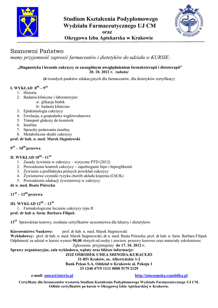 Studium Kształcenia Podyplomowego Wydziału Farmaceutycznego UJ CM oraz Okręgowa Izba Aptekarska w Krakowie Szanowni Państwo mamy przyjemność zaprosić farmaceutów i dietetyków do udziału w KURSIE: „Diagnostyka i leczenie cukrzycy ze szczególnym uwzględnieniem farmakoterapii i dietoterapii” 20. 10. 2012 r. /sobota/ (6 twardych punktów edukacyjnych dla farmaceutów, dla dietetyków certyfikaty) I. WYKŁAD 800 – 945 1. Historia 2. Badania kliniczne i laboratoryjne: a/. glikacja białek b/. badania kliniczne 3. Epidemiologia cukrzycy 4. Ewolucja, a gospodarka węglowodanowa 5. Transport glukozy do komórek 6. Insulina 7. Sposoby podawania insuliny 8. Metaboliczne skutki cukrzycy prof. dr hab. n. med. Marek Stępniewski 945 – 1000 przerwa II. WYKŁAD 1000– 1130 1. Zasady żywienia w cukrzycy – wytyczne PTD (2012) 2. Prowadzenie kontroli cukrzycy – zapobieganie hipo i hiperglikemii 3. Żywienie a profilaktyka późnych powikłań cukrzycy 4. Żywieniowe czynniki ryzyka chorób układu krążenia (ChUK) 5. Prowadzenie edukacji żywieniowej w cukrzycy dr n. med. Beata Piórecka 1145 – 1200 przerwa III. WYKŁAD 1200 – 1330 1. Farmakologiczne leczenie cukrzycy typu II prof. dr hab n. farm. Barbara Filipek 1335 Sprawdzian testowy, rozdanie certyfikatów uczestnictwa dla lekarzy i dietetyków. Kierownictwo Naukowe: prof. dr hab. n. med. Marek Stępniewski Wykładowcy: prof. dr hab. n. med. Marek Stępniewski; dr n. med. Beata Piórecka; prof. dr hab. n. farm. Barbara Filipek Odpłatność za udział w kursie wynosi 90,00 złotych od osoby i zawiera: przerwy kawowe oraz materiały szkoleniowe. Zgłoszenia przyjmujemy do 17. 10. 2012 r. Sprawy organizacyjne, sala wykładowa, wpłaty oraz bliższe informacje: ZOZ OŚRODEK UMEA SHINODA-KURACEJO 31-851 Kraków, os. Albertyńskie 1-2 Bank Pekao S.A. Oddział w Krakowie al. Pokoju 1 33 1240 4719 1111 0000 5179 2129 e-mail: [email protected] http://umeaopoka.republika.pl Certyfikaty dla farmaceutów wystawia Studium Kształcenia Podyplomowego Wydziału Farmaceutycznego UJ CM. Odbiór certyfikatów po kursie w Okręgowej Izbie Aptekarskiej w Krakowie.