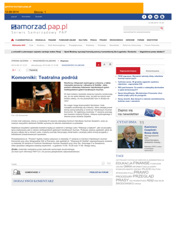 gmina-europa.pap.pl 12-08-2014 Strona: 1 pap.pl Newsletter Kontakt 12.08.2014 13:30 wyszukiwanie zaawansowane E-ADMINISTRACJA EDUKACJA FINANSE FUNDUSZE UNIJNE KULTURA PRACA PRAWO ŚRODOWISKO ZDROWIE FORUM WSZYSTKIE Biblioteka SAF | Czat | Konkurs | Klub Samorządowy | Przegląd prasy | Partnerzy | Przetargi | Newsletter | Reforma śmieciowa | Forum finansów ament Ukrainy uchwalił w pierwszym czytaniu sankcje wobec Rosji • Spod Moskwy wyruszył konwój pomocy humanitarnej dla Ługańska i Doniecka • Uzgodniona przez władze Rosji i Ukrainy STRONA GŁÓWNA WIADOMOŚCI KLUBOWE Depesza 2014-08-12 12:31 aktualizacja: 2014-08-12 13:28 WIADOMOŚCI KLUBOWE 0 A A A Tweetnij Najpopularniejsze PKW zaprasza. Wyraźnie wzrosły diety członków komisji wyborczych Komorniki: Teatralna podróż Niesforny chłopczyk wystrugany z drewna, a także niezwykle pomocny i odważny dr Dolittle - takie postaci odwiedzą niebawem najmłodszych gości wielkopolskich galerii handlowych Auchan. W dwie kolejne niedziele sierpnia maluchy przekonają się, że nie warto kłamać oraz, że jeśli na czymś nam bardzo zależy, nic nie przeszkodzi nam w drodze do celu! Fot. UG Komorniki Komentowane Cyfrowe serce. W grudniu egzamin systemu rejestrów - zapowiada COI RIO pod koszem. Co zrobić z nadwyżką dochodów z opłat śmieciowych? Nowa klasyfikacja. Ministerstwo Finansów chce dodać piątą cyfrę do paragrafu Nowy dowód. Bez danych o adresie zameldowania, kolorze oczu i wzroście Do czego mogą doprowadzić kłamstwa i brak rozsądku przekonają się maluchy, które zasiądą przed letnią sceną teatralną w Centrum Handlowym Auchan Komorniki. W najbliższą niedzielę 17 sierpnia poznają tam bowiem historię Pinokia, chłopca wystruganego z drewna przez stolarza Gepetta. Z kolei mali widzowie, którzy w niedzielę 24 sierpnia odwiedzą Centrum Handlowe Auchan Swadzim, wraz ze znanym wszystkim doktorem Dolittle wyruszą na ratunek zwierzakom w potrzebie. CYTAT DNIA Kazimierz Czaplicki: Nowa dieta Najbliższe bezpłatne spektakle teatralne będą już ostatnimi z letniego cyklu "Wakacje z bajkami", jaki od początku lipca realizowany jest w dwóch wielkopolskich galeriach handlowych Auchan. Podczas sześciu spektakli, jakie do tej pory odbyły się w ramach cyklu, maluchy poznały fascynujący świat teatru i przeżyły pełne emocji przygody z bohaterami prezentowanych opowieści. Wynagrodzenie było niezachęcające, delikatnie mówiąc... Przedstawienie pt. "Pinokio" będzie można zobaczyć w niedzielę 17 sierpnia w Centrum Handlowym Auchan Komorniki przy ulicy Głogowskiej 432 w Poznaniu, zaś spektakl pt. "Wyprawa Dr Dolittle" zaprezentowana zostanie w niedzielę 24 sierpnia w Centrum Handlowym Auchan Swadzim przy ulicy Św. Antoniego 2 w Swadzimiu. Obie opowieści odegrane zostaną trzykrotnie - o godzinie 13.00, 15.00 oraz 17.00. Wstęp wolny. Sekretarz PKW o pracy w komisjach wyborczych Źródło: materiały nadsyłane przez jednostki samorządu terytorialnego. Za treść tych informacji PAP S.A. nie ponosi jakiejkolwiek odpowiedzialności. TAGI CZYTELNICY DOTACJE DZIECKO E-ADMINISTRACJA TAGI: EDUKACJA FINANSE FUNDUSZE UNIJNE GMINA INFORMATYZACJA KADRY KONKURS MIASTO ODPADY PŁACE POLITYKA KOMENTARZE: 0 PRZEJDŹ NA FORUM PRAWO SPOŁECZNA Praca PROCEDURY PRZEGLĄD DODAJ SWÓJ KOMENTARZ PRASY RIO ROZMAITOŚCI RZĄD SĄD SEJM ŚRODOWISKO URZĄD gmina-europa.pap.pl 12-08-2014 Strona: 2 MULTIMEDIA PRZECZYTAJ RÓWNIEŻ Częstochowa: Wydatki na administrację Nowy Targ: Rajd Rowerowy wokół Tatr Częstochowa zajęła 14. miejsce wśród miast grodzkich wydających najmniej na administrację. Burmistrz miasta, Nowotarski Klub Kolarski oraz Sklep Rowerowy "ROWEX" zapraszają na XIX Rajd Rowerowy wokół Tatr Borzęcin: Nowe boisko Aleksandrów Kuj Klub Sportowy "Orlęta" zainaugurował sezon 2014/2015 w rozgrywkach IV ligi KPZPN 10 sierpnia na Stadionie Miejskim Trwają prace związane z budową boiska wielofunkcyjnego oraz zagospodarowaniem terenu przy szkole podstawowej w Łękach WIADOMOŚCI KLUBOWE ZAINWESTUJ W GMINIE Częstochowa: Wydatki na administrację Kępno: Wykaz nieruchomości XXIII Międzynarodowy Festiwal Folkloru, Strzegom 6.08.2014 r. Burmistrz Miasta i Gminy Kępno ogłasza wykaz nieruchomości przeznaczonych na sprzedaż Częstochowa zajęła 14. miejsce wśród miast grodzkich wydających najmniej na administrację. Toruń: Remont przychodni Nowy Targ: Rajd Rowerowy wokół Tatr Spotkanie samorządowców z Prezydentem RP przed 25-leciem samorządności, Warszawa, 30.07.2014 r. Kępno: Wykaz nieruchomości Komorniki: Teatralna podróż Borzęcin: Nowe boisko Aleksandrów Kuj.: Nowy sezon Grudziądz: Nowe centrum monitoringu Pieniężno: Spotkanie z piłką Elbląg: Efektywna edukacja Kępno: Budowa ulicy Topolowej Grudziądz: Eska w mieście XXIII Międzynarodowe Spotkanie Folklorystyczne Kupalnocka, Serock, 06.07.2014 r. Ostrowiec Św.: Targowisko miejskie Częstochowa: Wojciech Tochman w literackim odwachu Borzęcin: Kolejna promesa Sosnowiec: Punkt dla czarnych Brwinów: Fanatic na dożynkach Elbląg: Miasto za pół ceny Toruń: Medale dla par Strzegom: Zakończenie festiwalu POLECANE ARTYKUŁY Finanse Wybory 2014 Nowa klasyfikacja. Ministerstwo Finansów chce dodać piątą cyfrę do paragrafu Wywiady i opinie PKW zaprasza. Wyraźnie wzrosły diety członków komisji wyborczych Prawo Edukacja Cyfrowe serce. W grudniu egzamin systemu rejestrów zapowiada COI Sejm uchwalił. Cena nie będzie jedynym kryterium rozstrzygania przetargów PARTNERZY Tu zapisujemy. MEN informuje, jak klasyfikować wydatki na podręczniki Praca Środowisko Wszystkie pensje. Przypominamy tabelę wynagrodzeń pracowników jst RIO pod koszem. Co zrobić z nadwyżką dochodów z opłat śmieciowych? gmina-europa.pap.pl 12-08-2014 Strona: 3 PAP NA SKRÓTY Informacje Codzienny Serwis Informacyjny | English News Service | Daily News | PAP Business Daily | Kalendarium | Biznes Serwis Ekonomiczny | Market Insider |