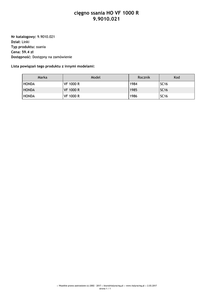 cięgno ssania HO VF 1000 R 9.9010.021 Nr katalogowy: 9.9010.021 Dział: Linki Typ produktu: ssania Cena: 59.4 zł Dostępność: Dostępny na zamówienie Lista powiązań tego produktu z innymi modelami: Marka Model Rocznik Kod HONDA VF 1000 R 1984 SC16 HONDA VF 1000 R 1985 SC16 HONDA VF 1000 R 1986 SC16 :: Wszelkie prawa zastrzeżone (c) 2002 - 2017 :: [email protected] :: www.italyracing.pl :: 2.03.2017 strona 1 / 1