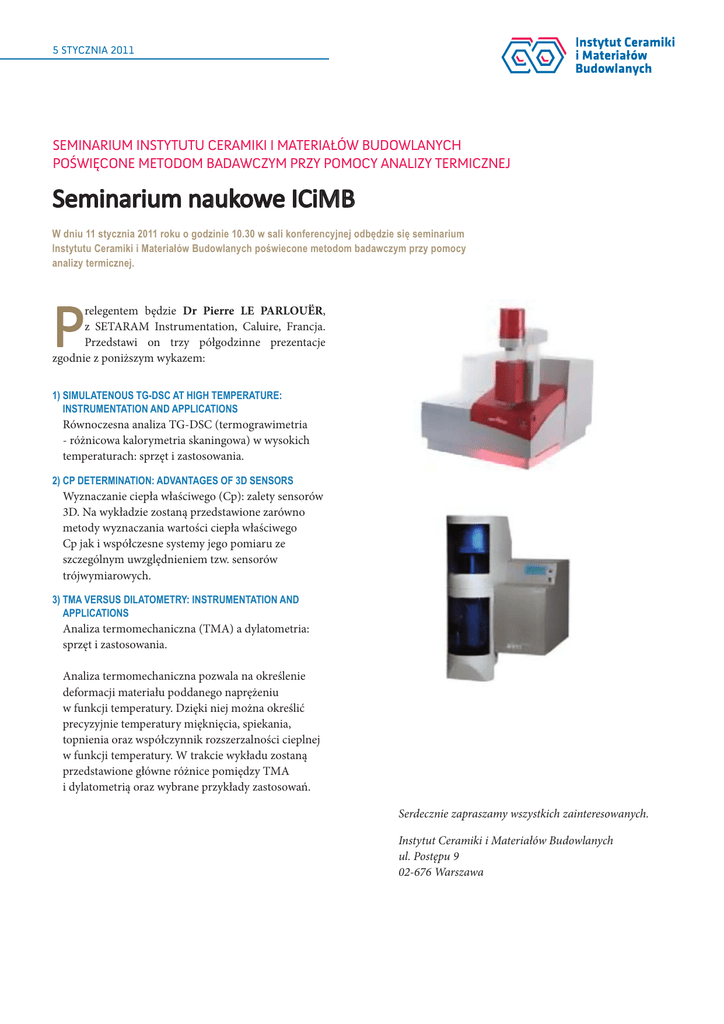 5 STYCZNIA 2011 SEMINARIUM INSTYTUTU CERAMIKI I MATERIAŁÓW BUDOWLANYCH POŚWIĘCONE METODOM BADAWCZYM PRZY POMOCY ANALIZY TERMICZNEJ Seminarium naukowe ICiMB W dniu 11 stycznia 2011 roku o godzinie 10.30 w sali konferencyjnej odbędzie się seminarium Instytutu Ceramiki i Materiałów Budowlanych poświecone metodom badawczym przy pomocy analizy termicznej. P relegentem będzie Dr Pierre LE PARLOUËR, z SETARAM Instrumentation, Caluire, Francja. Przedstawi on trzy półgodzinne prezentacje zgodnie z poniższym wykazem: 1) SIMULATENOUS TG-DSC AT HIGH TEMPERATURE: INSTRUMENTATION AND APPLICATIONS Równoczesna analiza TG-DSC (termograwimetria - różnicowa kalorymetria skaningowa) w wysokich temperaturach: sprzęt i zastosowania. 2) CP DETERMINATION: ADVANTAGES OF 3D SENSORS Wyznaczanie ciepła właściwego (Cp): zalety sensorów 3D. Na wykładzie zostaną przedstawione zarówno metody wyznaczania wartości ciepła właściwego Cp jak i współczesne systemy jego pomiaru ze szczególnym uwzględnieniem tzw. sensorów trójwymiarowych. 3) TMA VERSUS DILATOMETRY: INSTRUMENTATION AND APPLICATIONS Analiza termomechaniczna (TMA) a dylatometria: sprzęt i zastosowania. Analiza termomechaniczna pozwala na określenie deformacji materiału poddanego naprężeniu w funkcji temperatury. Dzięki niej można określić precyzyjnie temperatury mięknięcia, spiekania, topnienia oraz współczynnik rozszerzalności cieplnej w funkcji temperatury. W trakcie wykładu zostaną przedstawione główne różnice pomiędzy TMA i dylatometrią oraz wybrane przykłady zastosowań. Serdecznie zapraszamy wszystkich zainteresowanych. Instytut Ceramiki i Materiałów Budowlanych ul. Postępu 9 02-676 Warszawa