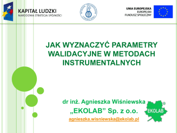 JAK WYZNACZYĆ PARAMETRY WALIDACYJNE W METODACH INSTRUMENTALNYCH dr inż. Agnieszka Wiśniewska „EKOLAB” Sp. z o.o. [email protected] DZIAŁALNOŚĆ „EKOLAB” SP. Z O.O. Akredytowane laboratorium badawcze „Ekolab” Sp. z o.o. prowadzi następujące badania i pomiary: 1) badania laboratoryjne (wody, ścieków, gleby, osadów ściekowych, odpadów, próbek powietrza itp.), 2) pomiary środowiska pracy, 3) pomiary emisji zanieczyszczeń, 4) pomiary hałasu w środowisku, 5) pomiary skuteczności wentylacji, 6) badania czystości powietrza, 7) badania sprężonego powietrza. AKREDYTACJA LABORATORIUM Akredytacja to uznanie przez jednostkę akredytującą kompetencji laboratorium do wykonywania określonych działań. W przypadku laboratoriów badawczych jest to uznanie kompetencji do wykonywania poszczególnych badań. W Polsce jedyną jednostką akredytacyjną jest Polskie Centrum Akredytacji (PCA). Akredytacja jest udzielana przez PCA na wniosek laboratorium, po dokonaniu jego oceny i potwierdzeniu, że spełnia określone wymagania. Ocena dokonywana jest podczas audytu z udziałem audytorów PCA. AKREDYTACJA LABORATORIUM Laboratoria badawcze muszą spełniać wymagania normy PN-EN ISO/IEC 17025:2005 Ogólne wymagania dotyczące kompetencji laboratoriów badawczych i wzorcujących AKREDYTACJA LABORATORIUM Punkt 5 normy przedstawia wymagania techniczne, jakie powinno spełnić laboratorium badawcze, aby uzyskać akredytację. Czynniki wpływające na prawidłowość i wiarygodność badań: - czynnik ludzki (personel); - warunki lokalowe i środowiskowe; - metody badań oraz ich walidacja; - wyposażenie; - spójność pomiarowa; - pobieranie próbek; - postępowanie z obiektami badania (badanymi próbkami). AKREDYTACJA LABORATORIUM Metody badań oraz ich walidacja - stosowanie w laboratorium właściwych metod znormalizowanych i/lub metod własnych, - prawidłowe przeprowadzenie walidacji metod badawczych (procedura walidacji i protokół z walidacji), - szacowanie niepewności metod badawczych, - kontrola jakości wykonywanych badań. AKREDYTACJA LABORATORIUM Spójność pomiarowa - stosowanie certyfikowanych wzorców i certyfikowanych materiałów odniesienia (CRM), - opracowanie procedur kalibracji wyposażenia pomiarowego, - upoważnienie personelu do przeprowadzania kalibracji, - stosowanie wywzorcowanych przyrządów pomiarowych ze świadectwami wzorcowania, - zachowanie spójności z jednostkami SI. WALIDACJA Walidacja jest potwierdzeniem, przez zbadanie i przedstawienie obiektywnego dowodu, że zostały spełnione szczególne wymagania dotyczące konkretnie zamierzonego zastosowania. Walidacja ma zatem na celu sprawdzenie, czy w warunkach danego laboratorium jesteśmy w stanie wykonać oznaczenie daną metodą analityczną z założoną precyzją, dokładnością i niepewnością. Procedura pomiarowa – szczegółowy opis sposobu postępowania prowadzącego do przeprowadzenia pomiarów za pomocą zastosowanej metody pomiarowej KIEDY PRZEPROWADZAMY WALIDACJĘ? Walidacja powinna być przeprowadzona kiedy: 1) opracowujemy nową procedurę analityczną, 2) rozszerzamy zakres już zwalidowanej metodyki np. zakres oznaczanych stężeń, oznaczenie danego analitu w innej matrycy, 3) przeprowadzamy porównanie nowej metody analitycznej z inną znaną i zwalidowaną metodą, 4) stwierdzamy w wyniku kontroli jakości stosowanej metodyki zmienność jej parametrów walidacyjnych w czasie, 5) planujemy wykorzystanie danej metodyki w innym laboratorium, z zastosowaniem innej aparatury, lub oznaczenia rutynowe za pomocą danej metodyki mają być wykonywane przez innego analityka. PRZED PRZYSTĄPIENIEM DO PROCESU WALIDACJI Przed przystąpieniem do procesu walidacji należy określić podstawowe cechy procedury analitycznej: czy ma to być analiza jakościowa, czy ilościowa; rodzaj oznaczanego analitu; rodzaj matrycy, w której będzie oznaczany dany analit; poziom i zakres stężeń oznaczanego analitu; obecność substancji przeszkadzających (interferentów) i sposoby ich wyeliminowania; istnienie regulacji prawnych lub innych wymogów, którym powinna sprostać dana procedura analityczna; PRZED PRZYSTĄPIENIEM DO PROCESU WALIDACJI wymagana wartość granicy wykrywalności i granicy oznaczalności; wymagany poziom dla precyzji i poprawności metody; wymagany zakres stosowania; wymagana odporność metody; wymagana aparatura pomiarowa i sprzęt pomocniczy; czy istnieje możliwość zastosowania walidowanej procedury badawczej w innych laboratoriach. ZAŁOŻENIA WALIDACYJNE Przeprowadzenie procesu walidacji wymaga zastosowania: • ślepych próbek, • wzorców (np. roztworów kalibracyjnych, próbek testowych, gazów wzorcowych, kalibratorów itp.), • (certyfikowanych) materiałów odniesienia, • powtórzeń, • obróbki statystycznej wyników w celu wyznaczenia niepewności walidowanej metody. PARAMETRY WALIDACJYJNE 1) 2) 3) 4) 5) 6) 7) 8) 9) 10) precyzja (powtarzalność, precyzja pośrednia, odtwarzalność), dokładność, poprawność, granica wykrywalności, granica oznaczalności, zakres pomiarowy, liniowość, selektywność, odporność, elastyczność. PRECYZJA Precyzja to stopień zgodności pomiędzy niezależnymi wynikami uzyskanymi w trakcie analizy danej próbki z zastosowaniem danej procedury analitycznej. Precyzja jest miarą rozrzutu uzyskanych wyników oznaczeń wokół wartości średniej. Miarą precyzji jest odchylenie standardowe średniej lub względne odchylenie standardowe RSD: n Sx xi x 2 i 1 nn1 RSD Sx 100% x gdzie: n – liczba wykonywanych pomiarów xi – pojedynczy pomiar _ x - średnia arytmetyczna z pomiarów Precyzja wyrażana jest jako powtarzalność, precyzja pośrednia lub odtwarzalność. PRECYZJA Powtarzalność to precyzja wyników uzyskanych w tych samych warunkach pomiarowych, czyli w danym laboratorium, przez jednego analityka, na jednym aparacie pomiarowym, przy użyciu tych samych odczynników i tej samej próbki oraz w krótkim cz