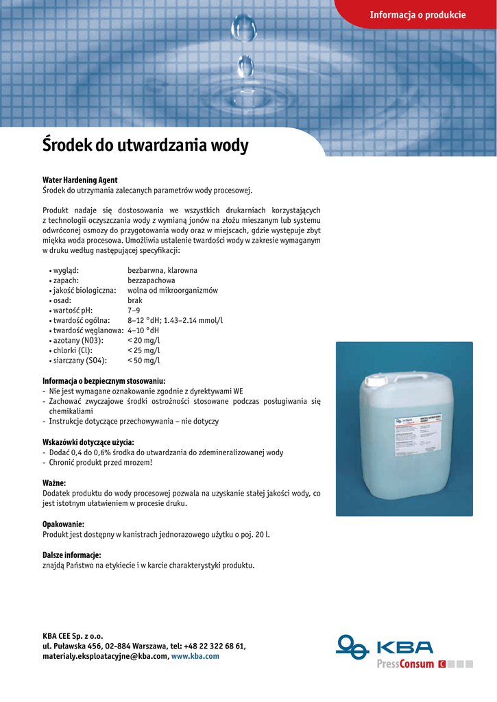 Informacja o produkcie Środek Hardening do utwardzania wody Water Agent Water Hardening Agent Środek do utrzymania zalecanych parametrów wody procesowej. Produkt nadaje się dostosowania we wszystkich drukarniach korzystających z technologii oczyszczania wody z wymianą jonów na złożu mieszanym lub systemu odwróconej osmozy do przygotowania wody oraz w miejscach, gdzie występuje zbyt miękka woda procesowa. Umożliwia ustalenie twardości wody w zakresie wymaganym w druku według następującej specyfikacji: • wygląd: bezbarwna, klarowna bezzapachowa • jakość biologiczna: wolna od mikroorganizmów • osad: brak • wartość pH: 7–9 • twardość ogólna: 8–12 °dH; 1.43–2.14 mmol/l • twardość węglanowa: 4–10 °dH • azotany (NO3): < 20 mg/l • chlorki (Cl): < 25 mg/l • siarczany (SO4): < 50 mg/l • zapach: Informacja o bezpiecznym stosowaniu: - Nie jest wymagane oznakowanie zgodnie z dyrektywami WE - Zachować zwyczajowe środki ostrożności stosowane podczas posługiwania się chemikaliami - Instrukcje dotyczące przechowywania – nie dotyczy Wskazówki dotyczące użycia: - Dodać 0,4 do 0,6% środka do utwardzania do zdemineralizowanej wody - Chronić produkt przed mrozem! Ważne: Dodatek produktu do wody procesowej pozwala na uzyskanie stałej jakości wody, co jest istotnym ułatwieniem w procesie druku. Opakowanie: Produkt jest dostępny w kanistrach jednorazowego użytku o poj. 20 l. Dalsze informacje: znajdą Państwo na etykiecie i w karcie charakterystyki produktu. KBA CEE Sp. z o.o. ul. Puławska 456, 02-884 Warszawa, tel: +48 22 322 68 61, [email protected], www.kba.com