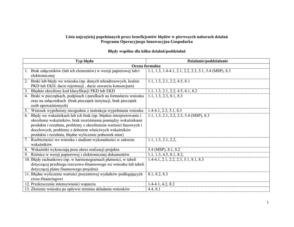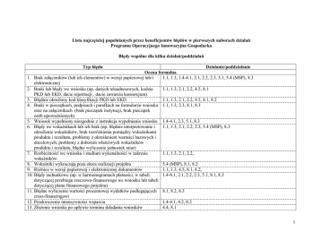 Lista najczęściej popełnianych przez beneficjentów błędów w pierwszych naborach działań Programu Operacyjnego Innowacyjna Gospodarka Błędy wspólne dla kilku działań/poddziałań Typ błędu Działanie/poddziałanie Ocena formalna 1. Brak załączników (lub ich elementów) w wersji papierowej lub/i 1.1, 1.3, 1.4-4.1, 2.1, 2.2, 2.3, 5.1, 5.4 (MSP), 8.3 elektronicznej 2. Braki lub błędy we wniosku (np. danych teleadresowych, kodzie 1.1, 1.3, 2.1, 2.2, 4.5, 8.1 PKD lub EKD, dacie rejestracji , dacie zawarcia konsorcjum) 3. Błędnie określony kod klasyfikacji PKD lub EKD 1.1, 1.3, 2.1, 2.2, 4.5, 8.1, 8.2 4. Braki w pieczątkach, podpisach i parafkach na formularzu wniosku 1.1, 1.3, 2.3, 8.1, 8.3 oraz na załącznikach (brak pieczątek instytucji, brak pieczątek osób upowaŜnionych) 5. Wniosek wypełniony niezgodnie z instrukcja wypełniania wniosku 1.4-4.1, 2.3, 5.1, 8.3 6. Błędy we wskaźnikach lub ich brak (np. błędnie interpretowanie i 1.1, 1.3, 2.1, 2.2, 2.3, 5.4 (MSP), 8.3 określenie wskaźników, brak rozróŜnienia pomiędzy wskaźnikami produktu i rezultatu, problemy z określeniem wartości bazowych i docelowych, problemy z doborem właściwych wskaźników produktu i rezultatu, błędne wyliczenie jednostek miar) 7. RozbieŜności we wniosku i studium wykonalności w zakresie 1.1, 1.3, 2.1, 2.2, wskaźników 8. Wskaźniki wykraczają poza okres realizacji projektu 5.4 (MSP), 8.1, 8.2 9. RóŜnice w wersji papierowej i elektronicznej dokumentów 1.1, 1.3, 4.5, 8.1, 8.2, 10. Błędy rachunkowe (np. w harmonogramach płatności, w tabeli 1.4-4.1, 2.1, 2.2, 2.3, 5.1, 8.1, 8.3 dotyczącej przebiegu rzeczowo-finansowego we wniosku lub tabeli dotyczącej planu finansowego projektu) 11. Błędne wyliczenie wartości procentowej wydatków podlegających 8.1, 8.2, 8.3 cross-financingowi 12. Przekroczenie intensywności wsparcia 1.4-4.1, 4.2, 8.2 13. ZłoŜenie wniosku po upływie terminu składania wniosków 4.4, 8.1 1 14. Błędne podanie kwoty wnioskowanego dofinansowania 2.1, 2.2, 4.5 15. Błędy w harmonogramie rzeczowo-finansowym (np. błędy 1.1, 1.3, 2.1, 2.2, 2.3, 5.4 (MSP) rachunkowe, niepełny wydruk, błędne oznaczenie formy płatności zaliczka/refundacja, niewłaściwe zaplanowanie okresu realizacji etapów, brak szczegółowych opisów kategorii wydatków) 16. Brak dat dziennych lub niespójne informacje na temat rozpoczęcia 2.1, 2.2, 5.4 (MSP) i zakończenia realizacji projektu 17. Przesłanie poprawionego wniosku o dofinansowanie po upływnie 3.1, 4.2, 4.4, 5.4, wyznaczonego terminu 18. Rozpoczęcie realizacji projektu przed otrzymaniem potwierdzenia, 4.2, 4.4 Ŝe projekt kwalifikuje się do wsparcia 19. Oznaczenie podatku VAT zarówno jako wydatku 5.4 (MSP), 8.1, kwalifikowanego, jak i niekwalifikowalnego 20. W tabeli Plan finansowy projektu błędnie dokonano podziału 5.4 (MSP), 8.1, 8.2 okresu realizacji projektu na kwartały Ocena merytoryczna (nie dotyczy działań 1.1, 1.3, 2.1, 2.2, 2.3, 8.1, 8.2, 8.3) 21. Projekt nie jest zgodny z celami i zakresem merytorycznym 1.4-4.11, 3.3, 4.2, 5.4 (IOB i MSP) działania 22. Planowane wydatki są niekwalifikowane 1.4-4.1, 4.4, 5.1, 5.2, 5.4 (IOB) 23. Informacje zawarte we wniosku lub załączone dokumenty nie 1.4-4.1, 4.2 potwierdzają zdolności Wnioskodawcy do sfinansowania projektu 24. Brak moŜliwości obiektywnej weryfikacji wskaźników produktu i 1.4-4.1, 4.2, 4.4, 5.2, 5.4 (IOB) rezultatu lub wskaźniki są: nieadekwatne do danego rodzaju projektu; niewspółmiernie niskie w stosunku do nakładów finansowych i okresu trwania projektu; dublują się; odnoszą się do działań niekwalifikowanych; są niespójne z opisem projektu lub błędnie zdefiniowane 25. Wydatki projektu nie są odpowiednio uzasadnione, nieadekwatne 3.1, 3.3, 4.2, 5.2, 5.4 (IOB) 1 Zgodnie z Kryteriami wyboru projektów w ramach Programu Operacyjnego Innowacyjna Gospodarka, zatwierdzonymi 15 grudnia 2008 r. przez Komitet Monitorujący Program Innowacyjna Gospodarka niniejsze kryterium nie obowiązuje juŜ w stosunku do działań 1.4-4.1 oraz 4.2. 2 lub nieracjonalne w odniesieniu do zakresu i celów projektu (lub brak jest danych umoŜliwiających stwierdzenie czy wydatki spełniają te kryteria) 26. Brak wskazania przez Wnioskodawcę odpowiedniego potencjału technicznego, kadrowego i organizacyjnego do realizacji projektu 3.1, 4.22 Błędy specyficzne dla poszczególnych działań/poddziałań Działanie PO IG Działanie 1.1 Poddziałanie 1.1.1 Działanie 1.3 Opis błędów Etap oceny − brak pełnomocnictwa do podpisywania wniosku o dofinansowanie i załączników, − pomimo tego, Ŝe wymagany jest oryginalny odpis z KRS, wydany nie później niŜ 3 miesiące przed datą złoŜenia wniosku, wnioskodawcy dostarczali kopię tego dokumentu, − kopie dokumentów potwierdzane przez osoby nieupowaŜnione (np. przez Radcę Prawnego), − brak daty i miejsca sporządzania wniosku (ostatnia strona wniosku), − kwalifikowalność wydatków – wystąpienie kosztu niekwalifikowanego (np. koszt audytu w projektach poniŜej 2 mln PLN), − wystąpienie wydatku w nieodpowiedniej kategorii wydatków – np. w kategorii „koszty ogólne” - delegacji zagranicznych; w kategorii „materiały i surowce” – materiałów biurowych, − przekroczone limity kwot na promocję projektu, − rozbieŜności w kwotach kategorii wydatków w punkcie 22 wniosku i tabelą kumulacja harmonogramu rzeczowo-finansowego, − rozbieŜności w zakresie liczby partnerów – inna we wniosku niŜ w umowie konsorcjum, − załączniki do wniosku nieopracowane w oparciu o wytyczne (harmonogramy niezgodne z obowiązującymi wzorami), − róŜnice stempli czasowych na wersji papierowej i elektronicznej wniosku (po wydruku wersji oficjalnej wniosku, dodawano jakiś załącznik, np. statut i oznaczano wniosek jako „gotowy” co powodowało zmianę formalna 2 Zgodnie z Kryteriami wyboru projektów w ramach Programu Operacyjnego Innowacyjna Gospodarka, zatw