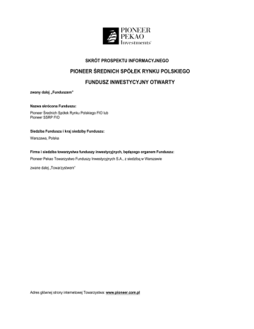 SKRÓT PROSPEKTU INFORMACYJNEGO PIONEER ŚREDNICH SPÓŁEK RYNKU POLSKIEGO FUNDUSZ INWESTYCYJNY OTWARTY zwany dalej „Funduszem” Nazwa skrócona Funduszu: Pioneer Średnich Spółek Rynku Polskiego FIO lub Pioneer SSRP FIO Siedziba Funduszu i kraj siedziby Funduszu: Warszawa, Polska Firma i siedziba towarzystwa funduszy inwestycyjnych, będącego organem Funduszu: Pioneer Pekao Towarzystwo Funduszy Inwestycyjnych S.A., z siedzibą w Warszawie zwane dalej „Towarzystwem” Adres głównej strony internetowej Towarzystwa: www.pioneer.com.pl Rozdział I Dane o Funduszu 1. Data i numer wpisu Funduszu do rejestru funduszy inwestycyjnych Fundusz został wpisany do rejestru funduszy inwestycyjnych w dniu 9 października 2006 r., pod numerem RFi 256. Fundusz prowadzi działalność zgodnie z prawem wspólnotowym regulującym zasady zbiorowego inwestowania w papiery wartościowe. 2. Czas trwania Funduszu Czas trwania Funduszu jest nieograniczony. 3. Cel inwestycyjny Funduszu Celem inwestycyjnym Funduszu jest wzrost wartości aktywów Funduszu w wyniku wzrostu wartości lokat. Fundusz nie gwarantuje osiągnięcia celu inwestycyjnego. 4. Charakterystyka uznanego indeksu akcji lub dłużnych papierów wartościowych oraz stopień odzwierciedlenia indeksu przez Fundusz Nie dotyczy. 5. Zasady polityki inwestycyjnej Funduszu 5.1. Główne kategorie lokat Funduszu Fundusz jest funduszem akcji. Aktywa Funduszu są lokowane przede wszystkim w dopuszczone do obrotu regulowanego lub będące w ofercie publicznej na terytorium Rzeczypospolitej Polskiej akcje spółek średniej wielkości. Za spółki o średniej wielkości będą uznane te spółki, których kapitalizacja rynkowa: - nie jest większa od kapitalizacji rynkowej spółki wchodzącej w skład indeksu mWIG40 publikowanego przez Giełdę Papierów Wartościowych w Warszawie, posiadającej największą kapitalizację rynkową spośród spółek wchodzących w skład tego indeksu, oraz - nie jest mniejsza niż kapitalizacja rynkowa spółki wchodzącej w skład indeksu mWIG40, posiadającej najmniejszą kapitalizację spośród spółek wchodzących w skład tego indeksu. Spółki spełniające ww. warunek, ale wchodzące w skład indeksu WIG 20 nie będą uznawane za spółki średniej wielkości. Całkowita wartość lokat innych niż lokaty w akcje spółek średniej wielkości nie będzie większa niż 33% Aktywów Funduszu. 5.2. Podstawowe kryteria doboru lokat do portfela inwestycyjnego Funduszu Dobór do portfela inwestycyjnego Funduszu poszczególnych rodzajów instrumentów finansowych dopuszczalnych jako przedmiot lokat Funduszu jest uzależniony od decyzji zarządzającego Funduszem podejmowanej z uwzględnieniem warunków ekonomicznych i sytuacji na rynkach instrumentów finansowych, oceny płynności, bezpieczeństwa i kształtowania się rentowności tych instrumentów, jak również celu inwestycyjnego oraz zasad dywersyfikacji aktywów Funduszu. Podstawę wyboru akcji stanowić będą analizy fundamentalne i analizy wskaźników wyceny rynkowej spółek. Ocena akcji obejmuje czynniki należące do analizy ilościowej jak też jakościowej. W ocenie ilościowej istotne znaczenie będą miały analizy historycznych i prognozowanych wartości występujących w sprawozdaniach finansowych obejmujące m.in.: analizę przychodów, rentowności, struktury finansowania, płynności oraz analizy porównawczej wskaźników wyceny rynkowej spółek. Wśród elementów analizy jakościowej istotne będą między innymi oceny: długoterminowej przewagi konkurencyjnej, pozycji rynkowej, ekonomii skali, wartość marki i produktów oferowanych przez daną spółkę, jej kadry zarządzającej, sieci dystrybucji, ogólnych perspektyw rozwoju. Zarządzający będzie poszukiwał akcji spółek o ponadprzeciętnym potencjale wzrostu zysków i przychodów w średnim i długim horyzoncie czasu. Część portfela lokowana w inne aktywa niż akcje będzie głównie inwestowana w dłużne papiery wartościowe, w tym polskie papiery skarbowe oraz depozyty bankowe. Istotnym czynnikiem determinującym decyzje inwestycyjne w odniesieniu do tych rodzajów lokat będzie zachowanie płynności. Inwestycje Funduszu w dłużne papiery wartościowe będą dokonywane na podstawie kalkulacji rentowności tych papierów sporządzonej w oparciu o prognozy podstawowych parametrów rynku finansowego takich jak: poziom i kierunek zmian stopy procentowej, kształt krzywej dochodowości i poziom inflacji. Zarządzający Funduszem dobierając dłużne papiery wartościowe do portfela inwestycyjnego Funduszu będzie zwracał szczególną uwagę na ryzyka związane z inwestycją w dany papier wartościowy takie jak: ryzyko stopy procentowej, ryzyko płynności papierów, a także na ryzyko wypłacalności emitenta. 5.3. Szczególne strategie inwestycyjne stosowane przez Fundusz w odniesieniu do inwestycji na określonym obszarze geograficznym, w określonej branży lub sektorze gospodarczym albo w odniesieniu do określonej kategorii lokat, albo w celu odzwierciedlenia indeksu akcji lub dłużnych papierów wartościowych Fundusz koncentruje się głównie na instrumentach finansowych emitentów z siedzibą na obszarze Rzeczpospolitej Polski. W przypadku inwestycji w papiery wartościowe i instrumenty rynku pieniężnego denominowanych w walutach innych niż złoty polski (PLN) Fundusz będzie podejmować działania mające na celu ograniczanie ryzyka inwestycyjnego związanego ze zmianą kursów walut wobec PLN, w tym także poprzez zawieranie umów mających za przedmiot instrumenty pochodne, w tym niewystandaryzowane instrumenty pochodne. Skład portfela inwestycyjnego Funduszu może ulegać zmianom w ramach limitów inwestycyjnych określonych w Ustawie oraz w Statucie Funduszu, w szczególności w obrębie określonej kategorii lokat. 5.4. Charakterystyka obligacji, w które lokuje Fundusz z uwzględnieniem rodzaju emitenta (rządowy, korporacyjny), terminu wykupu oraz wy