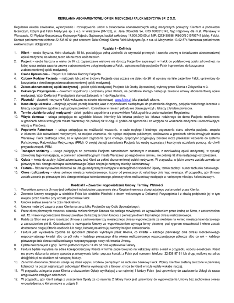 REGULAMIN ABONAMENTOWEJ OPIEKI MEDYCZNEJ FALCK MEDYCYNA SP. Z O.O. Regulamin określa zawieranie, wykonywanie i rozwiązywanie umów o świadczenie abonamentowych usług medycznych pomiędzy Klientem a podmiotem leczniczym, którym jest Falck Medycyna sp. z o.o. w Warszawie (01-102), ul. Jana Olbrachta 94, KRS 0000213143, Sąd Rejonowy dla m.st. Warszawy w Warszawie, XII Wydział Gospodarczy Krajowego Rejestru Sądowego, kapitał zakładowy 17.500.000,00 zł, NIP: 5272435938, REGON 015755741 (dalej: Falck). Kontakt pod numerem telefonu: 22 536 97 61 pod adresem: Dział Obsługi Klienta Falck Medycyna Sp. z o.o. ul. Marynarska 13 02-674 Warszawa pod adresem elektronicznym: [email protected] Rozdział I – Definicje 1. Klient – osoba fizyczna, która ukończyła 18 lat, posiadająca pełną zdolność do czynności prawnych i zawarła umowę o świadczenie abonamentowej opieki medycznej na własną rzecz lub na rzecz osób trzecich. 2. Pacjent – osoba fizyczna w wieku do 67 r.ż (ograniczenie wiekowe nie dotyczy Pacjentów zapisanych w Falck do podstawowej opieki zdrowotnej), na której rzecz została zawarta umowa o abonamentowe usługi medyczne z Falck., wpisana na listę pacjentów Falck i uprawniona do korzystania z abonamentowej opieki medycznej. 3. Osoba Uprawniona – Pacjent lub Członek Rodziny Pacjenta. 4. Członek Rodziny Pacjenta - małżonek lub partner życiowy Pacjenta oraz uczące się dzieci do 26 lat wpisany na listę pacjentów Falck, uprawniony do korzystania z określonego zakresu abonamentowej opieki medycznej. 5. Zakres abonamentowej opieki medycznej – pakiet opieki medycznej Pacjenta lub Osoby Uprawnionej, wybrany przez Klienta z Załącznika nr 3. 6. Deklaracja Przystąpienia – dokument wypełniony i podpisany przez Klienta, na podstawie którego następuje zawarcie umowy abonamentowej opieki medycznej. Wzór Deklaracji Przystąpienia stanowi Załącznik nr 1 do Regulaminu. 7. Placówki – placówki medyczne Falck wskazane na stronie internetowej www.falck.pl jako placówki własne. 8. Konsultacje lekarskie – obejmują wywiad, poradę lekarską wraz z czynnościami niezbędnymi do postawienia diagnozy, podjęcia właściwego leczenia u lekarzy specjalistów zgodnie z wykupionym pakietem. Konsultacje w ramach pakietu nie obejmują wizyt u lekarzy z tytułem profesora. 9. Termin udzielenia usługi medycznej – dzień i godzina uzgodniona z pracownikiem Falck zgodnie z postanowieniami Regulaminu. 10. Wizyta domowa – usługa polegająca na wyjeździe lekarza internisty lub lekarza pediatry lub lekarza rodzinnego do domu Pacjenta realizowana w granicach administracyjnych miasta Warszawy nie później niż w ciągu 6 godzin od zgłoszenia i ze względu na wskazania medyczne uniemożliwiające wizytę w Placówce. 11. Pogotowie Ratunkowe – usługa polegająca na możliwości wezwania, w razie nagłego i istotnego pogorszenia stanu zdrowia pacjenta, zespołu z lekarzem i/lub ratownikami medycznymi, na miejsce zdarzenia, nie będące miejscem publicznym, realizowana w granicach administracyjnych miasta Warszawy. Falck zastrzega sobie, że w sytuacjach zagrożenia życia chorego, dyspozytor przyjmujący zlecenie może przekazać wezwanie do systemu Państwowego Ratownictwa Medycznego (PRM). O swojej decyzji zawiadamia Pacjenta lub osobę wzywającą i koordynuje udzielanie pomocy, do chwili przyjazdu zespołu PRM. 12. Transport sanitarny – usługa polegająca na przewozie Pacjenta samochodem sanitarnym z noszami, z możliwością opieki medycznej, w sytuacji zdrowotnej tego wymagającej, w granicach administracyjnych miasta Warszawy, po uzgodnieniu terminu, nie później niż dnia następnego od zgłoszenia. 13. Opłata – kwota do zapłaty, której zobowiązany jest Klient za pakiet abonamentowej opieki medycznej. W przypadku, w jakim umowa została zawarta po pierwszym dniu danego miesiąca kalendarzowego Opłata obejmuje następny miesiąc kalendarzowy. 14. Faktura – faktura wystawiona Klientowi za Usługę medyczną zawierająca w szczególności wysokość Opłaty, termin zapłaty i numer rachunku bankowego. 15. Okres rozliczeniowy – okres pełnego miesiąca kalendarzowego, liczony od pierwszego do ostatniego dnia tego miesiąca. W przypadku, gdy Umowa została zawarta po pierwszym dniu danego miesiąca kalendarzowego, pierwszy okres rozliczeniowy następuje w następnym miesiącu kalendarzowym. Rozdział II – Zawarcie i wypowiedzenie Umowy. Terminy. Płatności Warunkiem zawarcia Umowy jest dokładne i indywidualne zapoznanie się z Regulaminem oraz akceptacja jego postanowień przez Klienta. Zawarcie Umowy następuje w siedzibie Falck lub siedzibie Placówki z dniem wskazanym w Deklaracji Przystąpienia i z chwilą podpisania jej w tym miejscu przez Klienta i przy udziale pracownika Falck. 3. Umowa zostaje zawarta na czas nieokreślony. 4. Umowa może być zawarta przez Klienta na rzecz kilku Pacjentów czy Osób Upoważnionych. 5. Przez okres pierwszych dwunastu okresów rozliczeniowych Umowa nie podlega rozwiązaniu za wypowiedzeniem przez żadną ze Stron, z zastrzeżeniem ust. 12. Prawo wypowiedzenia Umowy powstaje dla każdej ze Stron Umowy z pierwszym dniem trzynastego okresu rozliczeniowego. 6. Każda ze Stron ma prawo rozwiązać Umowę z zachowaniem trzy miesięcznego okresu wypowiedzenia ze skutkiem na koniec miesiąca kalendarzowego z zastrzeżeniem pkt 5. Oświadczenie o rozwiązaniu Umowy za wypowiedzeniem wymaga formy pisemnej pod rygorem nieważności i winno zostać dostarczone drugiej Stronie osobiście lub drogą listowną na adres jej siedziby/miejsca zamieszkania. 7. Faktura jest wystawiana zgodnie ze sposobem płatności wybranym przez Klienta, co kwartał – każdego pierwszego dnia okresu rozliczeniowego rozpoczynającego kwartał albo co pół roku – każdego pierwszego dnia okresu rozliczeniowego rozpoczynającego półrocze albo co rok – każdego pierwszego dnia okresu rozliczeniowego rozpoczynającego nowy rok 