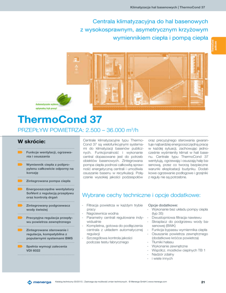 Centrala klimatyzacyjna do hal basenowych z wysokosprawnym, asymetrycznym krzyżowym wymiennikiem ciepła i pompą ciepła Automatycznie wybiera optymalny tryb pracy! ThermoCond 37 Przepływ powietrza: 2.500 – 36.000 m3/h W skrócie: Funkcje wentylacji, ogrzewania i osuszania Wymiennik ciepła z polipropylenu całkowicie odporny na korozję Zintegrowana pompa ciepła Energooszczędne wentylatory SolVent z regulacją przepływu oraz kontrolą drgań Zintegrowany podgrzewacz wody świeżej Precyzyjna regulacja przepływu powietrza zewnętrznego Zintegrowane sterowanie i regulacja, kompatybilna z popularnymi systemami BMS Spełnia wymogi zalecenia VDI 6022 Centrale klimatyzacyjne typu ThermoCond 37 są wielofunkcyjnymi systemami do klimatyzacji basenów publicznych. Funkcjonalność i wykonanie central dopasowane jest do potrzeb obiektów basenowych. Zintegrowana pompa ciepła podnosi całkowitą sprawność energetyczną centrali i umożliwia osuszanie basenu w recyrkulacji. Połączenie wysokiej jakości podzespołów oraz precyzyjnego sterowania gwarantuje najbardziej energooszczędną pracę w każdej sytuacji, zachowując jednocześnie wyśmienity klimat w hali basenu. Centrale typu ThermoCond 37 wentylują, ogrzewają i osuszają halę basenową, przez co tworzą bezpieczne warunki eksploatacji budynku. Dodatkowe ogrzewanie podłogowe i grzejniki z reguły nie są potrzebne. Wybrane cechy techniczne i opcje dodatkowe: - Filtracja powietrza w każdym trybie pracy - Nagrzewnica wodna - Parametry centrali regulowane indywidualnie - Kompletna, gotowa do podłączenia centrala z układem automatycznej regulacji - Szczegółowa kontrola jakości podczas testu fabrycznego Opcje dodatkowe: - Wykonanie bez układu pompy ciepła (typ 35) - Dwustopniowa filtracja nawiewu - Skraplacz do podgrzewu wody basenowej (BWK) - Funkcja bypassu wymiennika ciepła -Osuszanie powietrza zewnętrznego (dodatkowe króćce powietrza) - Tłumiki hałasu -Wykonanie zewnętrzne -Współcz. mostków cieplnych TB 1 - Nadzór zdalny - i wiele innych Katalog techniczny 03/2013 | Zastrzega się możliwość zmian technicznych. © Menerga GmbH | www.menerga.com 21 ThermoCond publiczne Klimatyzacja hal basenowych | ThermoCond 37 Klimatyzacja hal basenowych | ThermoCond 37 Opis funkcji ThermoCond publiczne Ogrzewanie w recyrkulacji Jeśli hala basenowa wymaga dogrzewania, ciepło jest przekazywane za pośrednictwem nagrzewnicy wodnej. Przepustnica bypass asymetrycznego krzyżowego wymienOsuszanie w recyrkulacji Powietrze recyrkulacyjne osuszane jest za pośrednictwem parownika pompy ciepła. Proces osuszania jest wzmocniony dzięki współdziałaniu pompy ciepła z asymetrycznym krzyżowym wymiennikiem ciepła. Powietrze osuszone w parowniku przepływa przez wymiennik ciepła, gdzie ogrzewa Praca w trybie basenowym W trybie basenowym dodawana jest niezbędna ilość powietrza higienicznego zgodnie z VDI 2089. Udział powietrza zewnętrznego jest zmienny i zależy od aktualnego obciążenia hali basenowej, strumienia parowania wody z basenu, a także od zawartości wilgoci w Praca z 100% udziałem powietrza zewnętrznego Wraz ze wzrostem zawartości wilgoci w powietrzu zewnętrznym, przepustnica recyrkulacji jest coraz bardziej przymykana. W warunkach wilgotnego lata centrala pracuje ze 100-procentowym udziałem powietrza zeOpcje dodatkowe W niektórych wypadkach osiągnięcie parametrów powietrza w hali basenowej zgodnie z VDI 2089 może wymagać zastosowania dodatkowego systemu przepustnic powietrza. Powietrze zewnętrzne jest pobierane przez dodatkowy króciec powietrza. Część powietrza zewnętrznego jest schładzana na wymienniku cie- Tryb spoczynkowy Jeśli w trybie spoczynkowym temperatura i wilgotność na hali basenowej są utrzymane, centrala przechodzi w tryb pełnej recyrkulacji. Dzięki temu zachowany jest niezbędny obieg powietrza w hali basenowej. W miarę możliwości wentylatory pracują na obniżonej wydajności powietrza. powietrzu zewnętrznym. Powietrze nawiewane podgrzewane jest ciepłem odzyskanym od powietrza wywiewanego. Jeśli wymagana jest większa ilość ciepła, jest ono dostarczane za pośrednictwem nagrzewnicy wodnej. wnętrznego. Pompa ciepła przekazuje ciepło albo do powietrza nawiewanego albo do skraplacza BWK, podgrzewającego wodę basenową (wyposażenie dodatkowe). pła, a następnie osuszana na parowniku pompy ciepła. Tak schłodzone i osuszone powietrze przepływa przez wymiennik ciepła, jest mieszane z pozostałą częścią powietrza zewnętrznego i wprowadzane do hali basenowej. Jeśli hala basenowa nie wymaga dogrzewania, ciepło zostanie oddane do powietrza usuwanego. (+) (+) V NAWIEW V POW. ZEWN. (+) (+) V POW. USUW. * V K POW. ZEWN. WYWIEW (+) (+) V POW. USUW. * NAWIEW V K POW. ZEWN. WYWIEW (+) (+) V NAWIEW V K POW. USUW. * POW. ZEWN. WYWIEW (+) (+) V NAWIEW POW. USUW. * V K POW. USUW. (+) POW. ZEWN. K WYWIEW (+) NAWIEW (+) V * K V * skraplacz BWK: tylko przy centralach typu 37 xx 11 22 POW. USUW. * K nika ciepła otwiera się, dzięki czemu WYWIEW maleją wewnętrzne opory przepływu. Przepustnice powietrza zewnętrz- NAWIEW nego i usuwanego są zamknięte. się ciepłem odzyskanym od powietrza wywiewanego. Proces ten pozwala z kolei na lepsze osuszenie powietrza wywiewanego. Wstępnie podgrzane powietrze jest mieszane z powietrzem recyrkulacyjnym, podgrzewane na skraplaczu i nagrzewnicy wodnej a następnie nawiewane do hali basenowej. POW. ZEWN. WYWIEW Katalog techniczny 03/2013 | Zastrzega się możliwość zmian technicznych. © Menerga GmbH | www.menerga.com