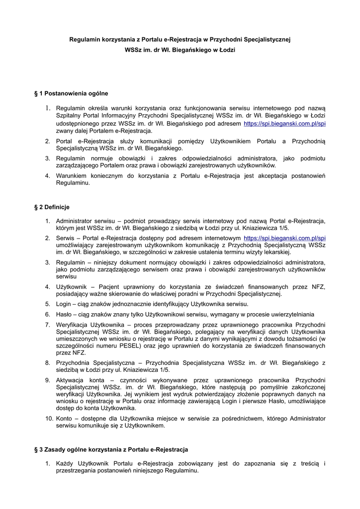 Regulamin korzystania z Portalu e-Rejestracja w Przychodni Specjalistycznej WSSz im. dr Wł. Biegańskiego w Łodzi § 1 Postanowienia ogólne 1. Regulamin określa warunki korzystania oraz funkcjonowania serwisu internetowego pod nazwą Szpitalny Portal Informacyjny Przychodni Specjalistycznej WSSz im. dr Wł. Biegańskiego w Łodzi udostępnionego przez WSSz im. dr Wł. Biegańskiego pod adresem https://spi.bieganski.com.pl/spi zwany dalej Portalem e-Rejestracja. 2. Portal e-Rejestracja służy komunikacji pomiędzy Specjalistyczną WSSz im. dr Wł. Biegańskiego. Użytkownikiem Portalu a Przychodnią 3. Regulamin normuje obowiązki i zakres odpowiedzialności administratora, jako zarządzającego Portalem oraz prawa i obowiązki zarejestrowanych użytkowników. podmiotu 4. Warunkiem koniecznym do korzystania z Portalu e-Rejestracja jest akceptacja postanowień Regulaminu. § 2 Definicje 1. Administrator serwisu – podmiot prowadzący serwis internetowy pod nazwą Portal e-Rejestracja, którym jest WSSz im. dr Wł. Biegańskiego z siedzibą w Łodzi przy ul. Kniaziewicza 1/5. 2. Serwis – Portal e-Rejestracja dostępny pod adresem internetowym https://spi.bieganski.com.pl/spi umożliwiający zarejestrowanym użytkownikom komunikację z Przychodnią Specjalistyczną WSSz im. dr Wł. Biegańskiego, w szczególności w zakresie ustalenia terminu wizyty lekarskiej. 3. Regulamin – niniejszy dokument normujący obowiązki i zakres odpowiedzialności administratora, jako podmiotu zarządzającego serwisem oraz prawa i obowiązki zarejestrowanych użytkowników serwisu 4. Użytkownik – Pacjent uprawniony do korzystania ze świadczeń finansowanych przez NFZ, posiadający ważne skierowanie do właściwej poradni w Przychodni Specjalistycznej. 5. Login – ciąg znaków jednoznacznie identyfikujący Użytkownika serwisu. 6. Hasło – ciąg znaków znany tylko Użytkownikowi serwisu, wymagany w procesie uwierzytelniania 7. Weryfikacja Użytkownika – proces przeprowadzany przez uprawnionego pracownika Przychodni Specjalistycznej WSSz im. dr Wł. Biegańskiego, polegający na weryfikacji danych Użytkownika umieszczonych we wniosku o rejestrację w Portalu z danymi wynikającymi z dowodu tożsamości (w szczególności numeru PESEL) oraz jego uprawnień do korzystania ze świadczeń finansowanych przez NFZ. 8. Przychodnia Specjalistyczna – Przychodnia Specjalistyczna WSSz im. dr Wł. Biegańskiego z siedzibą w Łodzi przy ul. Kniaziewicza 1/5. 9. Aktywacja konta – czynności wykonywane przez uprawnionego pracownika Przychodni Specjalistycznej WSSz. im. dr Wł. Biegańskiego, które następują po pomyślnie zakończonej weryfikacji Użytkownika. Jej wynikiem jest wydruk potwierdzający złożenie poprawnych danych na wniosku o rejestrację w Portalu oraz informację zawierającą Login i pierwsze Hasło, umożliwiające dostęp do konta Użytkownika. 10. Konto – dostępne dla Użytkownika miejsce w serwisie za pośrednictwem, którego Administrator serwisu komunikuje się z Użytkownikem. § 3 Zasady ogólne korzystania z Portalu e-Rejestracja 1. Każdy Użytkownik Portalu e-Rejestracja zobowiązany jest do zapoznania się z treścią i przestrzegania postanowień niniejszego Regulaminu. 2. Korzystanie z Portalu e-Rejestracja oznacza całkowitą zgodę Użytkownika na przestrzeganie postanowień niniejszego Regulaminu i przetwarzanie przez Administratora jego danych zamieszczonych w Portalu. 3. Za kompletność i rzetelność danych oraz informacji przekazywanych na strony Portalu e-Rejestracja odpowiada Użytkownik, który te treści zamieścił. 4. Administrator serwisu nie ponosi odpowiedzialności za dane, które zostały błędnie wprowadzone przez Użytkownika, a w szczególności za szkody wyrządzone osobom trzecim w związku z korzystaniem przez nich z udostępnionych informacji. 5. Z Portalu e-Rejestracja mogą korzystać wyłącznie Użytkownicy, którzy dokonali rejestracji zgodnej z zasadami wskazanymi w niniejszym Regulaminie. § 4 Rejestracja Użytkownika 1. Użytkownik uzyskuje możliwość korzystania ze wszystkich udostępnionych funkcji Portalu eRejestracja po wcześniejszym: a. wypełnieniu formularza rejestracyjnego, b. potwierdzeniu rejestracji Użytkownika, c. Aktywacji konta Specjalistycznej. Użytkownika przez uprawnionego pracownika Przychodni 2. W celu Aktywacji konta Użytkownika – po wypełnieniu formularza rejestracyjnego oraz otrzymaniu potwierdzenia rejestracji Użytkownik zobowiązany jest zgłosić się osobiście z dowodem tożsamości oraz ze skierowaniem do konkretnej Poradni w Przychodni Specjalistycznej – jeśli skierowanie jest wymagane przepisami NFZ – do rejestracji Przychodni Specjalistycznej. § 5 Wyrejestrowanie / Zablokowanie konta Użytkownika 1. Każdy Użytkownik zostaje Wyrejestrowany z Portalu e-Rejestracja po dokonaniu przez lekarza wypisu z konkretnej Poradni w Przychodni Specjalistycznej do POZ. 2. Konto Użytkownika może zostać Zablokowane ze skutkiem natychmiastowym w następujących przypadkach: a. nieprawidłowego korzystania z Portalu przez Użytkownika, b. na wniosek użytkownika, c. w przypadku kilkukrotnego niestawienia się Użytkownika na umówioną wizytę lub zbyt późnego odwołania wizyty. 3. Odblokowanie zablokowanego konta następuje na wniosek Użytkownika. 4. Administrator zastrzega sobie prawo do zablokowania konta Użytkownika, którego działania będą niezgodne z niniejszym Regulaminem. § 6 Zasady bezpieczeństwa 1. Użytkownik ma obowiązek ochrony wszelkich danych dotyczących jego konta przed osobami trzecimi. 2. Użytkownik ponosi odpowiedzialność za udostępnienie Loginu i Hasła do jego konta osobom trzecim. 3. Użytkownik jest zobowiązany niezwłocznie informować Administratora o każdym przypadku utraty Loginu lub Hasła jego konta. 4. Administrator nie ponosi odpowiedzialności za modyfikację, utratę, jaki i za ujawnienie danych wprowadzonych przez Użytkownika do Portalu e-Rejestr