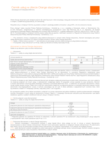 Cennik usług w ofercie Orange stacjonarny obowiązuje od 5 listopada 2008 roku Oferta Orange stacjonarny jest dostępna jedynie dla osób fizycznych, które korzystają z Usług jako konsument (nie zawiera Umowy bezpośrednio w związku z działalnością gospodarczą, ani zawodową). Wszystkie ceny w niniejszym Cenniku są podane w złotych i zawierają podatek od towarów i usług (VAT), o ile nie oznaczono inaczej. Przez „Orange” należy rozumieć Polską Telefonię Komórkową – Centertel sp. z o.o. z siedzibą w Warszawie, adres: ul. Skierniewicka 10a, 01-230 Warszawa, zarejestrowana w rejestrze przedsiębiorców prowadzonym przez Sąd Rejonowy dla m. st. Warszawy, XII Wydział Gospodarczy Krajowego Rejestru Sądowego pod numerem KRS 0000006107, o kapitale zakładowym 2.690.201.964,00 PLN, nr NIP 527-02068-72. Pozostałe pojęcia w niniejszym Cenniku pisane wielką literą są zgodne z definicjami zawartymi w Regulaminie Świadczenia Usług Telefonii Stacjonarnej przez Polską Telefonię Komórkową – Centertel sp. z o.o. 1.1. Przy zawieraniu umowy o świadczenie usług telekomunikacyjnych w ramach oferty Orange stacjonarny, Abonent obowiązany jest pokryć opłatę aktywacyjną w wysokości 315 złotych za każdy kontrakt w ramach oferty Orange stacjonarny. 1.2. Opłata, o której mowa w punkcie 1.1. jest doliczana do pierwszego rachunku telefonicznego za usługi telekomunikacyjne. 1.3. W przypadku usług rozliczanych za minutę, opłaty są naliczane za każdą rozpoczętą minutę. Abonament w ofercie Orange stacjonarny Opłaty te są naliczane z góry za okres rozliczeniowy. 2.1. Abonament. Tabela nr 1 – opłaty za usługi objęte abonamentem. umowa zawarta na: Opłata abonamentowa (abonament) ilość minut w ramach abonamentu, do wykorzystania na krajowe numery stacjonarne naliczanie sekundowe blokada prezentacji własnego numeru prezentacja numeru przychodzącego 1) 12 miesięcy 371) 24 miesiące 42 371) 42 80 40 czas nieoznaczony 42 0 bezpłatnie bezpłatnie bezpłatnie Abonament w opcji 37 z umową na czas określony dostępny jest jedynie dla klientów, którzy w momencie zawierania umowy o świadczenie usług telekomunikacyjnych w ramach oferty Orange stacjonarny już są Abonentami, w rozumieniu Regulaminu świadczenia usług telekomunikacyjnych w sieci telekomunikacyjnej GSM 900/1800 i UMTS przez spółkę pod firmą Polska Telefonia Komórkowa Centertel Spółka z ograniczoną odpowiedzialnością, bądź Regulaminu Świadczenia Usług Orange Freedom/ Internet dla Firm, bądź Regulaminu Świadczenia Usług Telefonii Stacjonarnej przez Polską Telefonię Komórkową – Centertel sp. z o.o. W zamian za dostęp do sieci telekomunikacyjnej Abonent jest obciążany opłatą abonamentową za każdy okres rozliczeniowy, przy czym opłata ta nie obejmuje połączeń ani innych usług, z zastrzeżeniem następnego zdania. W przypadku umowy zawartej na czas oznaczony, Abonent w ramach abonamentu otrzymuje pakiet zawierający wskazaną w powyższej tabeli ilość minut - w zależności od wysokości abonamentu i okresu na jaki została zawarta umowa. Pakiet minut może być wykorzystany wyłącznie na połączenia głosowe na wszystkie stacjonarne krajowe numery abonenckie oraz niegeograficzne numery 4-cyfrowe zaczynające się od cyfry 9 (9xxx) jednakże z wyłączeniem tych numerów 9xxx, które są określone w tabeli nr 4 niniejszego Cennika, całą dobę, przez 7 dni w tygodniu. Po wyczerpaniu pakietu minut dalsze korzystanie z połączeń na numery stacjonarne jest płatne dodatkowo zgodnie postanowieniami niniejszego Cennika. Korzystanie z innych usług niż wymienione w ramach Tabeli nr 1 niniejszego Cennika jest rozliczane poza Abonamentem i jest płatne dodatkowo zgodnie z opłatami określonymi dla tych usług w niniejszym Cenniku. 2.2. Cennik połączeń, poza Abonamentem Tabela nr 2 – opłaty za usługi nie objęte Abonamentem. opłata 0,20 połączenie głosowe do sieci krajowych operatorów stacjonarnych zł/ minuta połączenie głosowe do sieci krajowych operatorów komórkowych. 0,57 1) Nie dotyczy sieci P4 (PLAY) zł/ minuta 0,75 1) połączenie głosowe do sieci P4 (PLAY) zł/ minuta rachunek szczegółowy 5 zł 1) Połączenia głosowe do operatora P4 (PLAY) to połączenia z sieciami operatora P4 lub dostawcami usług świadczących usługi wyłącznie z wykorzystaniem sieci, której operatorem jest P4 sp. z o.o. MAS/PDF18/0808 Strona 1 z 3 Usługa 2.3. Rozliczanie Abonamentu w ofercie Orange stacjonarny 2.3.1. Abonent korzystający z Abonamentu korzysta z usługi Kapitał Minut, która polega na tym, iż minuty w ramach Abonamentu niewykorzystane w danym okresie rozliczeniowym Abonent może wykorzystać najpóźniej w następnym okresie rozliczeniowym. Po zakończeniu tego okresu minuty nie przechodzą na kolejne okresy rozliczeniowe, nie mogą być wykorzystane, a ich wartość nie podlega zwrotowi. 2.3.2. Jeżeli Abonament zostanie udostępniony przed rozpoczęciem pierwszego pełnego okresu rozliczeniowego, Abonent zostanie obciążony kwotą proporcjonalną do czasu korzystania z Abonamentu w danym okresie. Polska Telefonia Komórkowa Centertel Spółka z o.o. z siedzibą w Warszawie, adres: 01-230 Warszawa ul. Skierniewicka 10 a, zarejestrowana w Sądzie Rejonowym dla m. st. Warszawy XII Wydział Gospodarczy – Krajowego Rejestru Sądowego pod numerem KRS 0000006107, o kapitale zakładowym 2.690.501.964,00 PLN, (NIP 527-020-68-72) 2.3.3. Zarządzanie usługami dodatkowymi wymienionymi w niniejszym Cenniku (tj. zlecenie takich czynności jak: włączenie, wyłączenie lub zmiana usługi dodatkowej) poprzez Orange Automatyczne Biuro Obsługi pod numerem 510500500 nie podlega dodatkowej opłacie. Zarządzanie usługami dodatkowymi wymienionymi w niniejszym Cenniku (tj. zlecenie takich czynności jak: włączenie, wyłączenie lub zmiana usługi dodatkowej) za pośrednictwem Orange Biura Obsługi Klienta: w drodze bezpośredniego połączeni