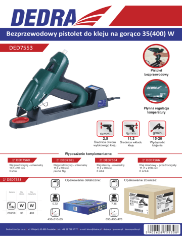 Bezprzewodowy pistolet do kleju na gorąco 35(400) W DED7553 Pistolet bezprzewodowy Płynna regulacja temperatury 2,5 11,2 15-20 Średnica otworu wylotowego kleju Średnica wkładu kleju Wydajność klejenia Wyposażenie komplementarne: Art. Nr DED7560 Klej przeźroczysty - uniwersalny 11,2 x 200 mm 6 sztuk Art. Nr Art. Nr DED7561 Klej przeźroczysty - uniwersalny 11,2 x 200 mm paczka 1kg DED7553 Zasilanie DED7564 Moc maksymalna ~Hz W W 230/50 35 400 Art. Nr Klej mleczny - uniwersalny 11,2 x 200 mm 6 sztuk Opakowanie detaliczne: Moc robocza V Art. Nr DED7566 Klej miodowy - przeźroczysty 11,2 x 200 mm 6 sztuk Opakowanie zbiorcze: 1 10 0,72 7,15 mm mm 450x310x85 650x450x470 Dedra-Exim Sp. z o.o. | ul. 3 Maja 8, 05-800 Pruszków | tel.: +48 22 738 37 77 | e-mail: [email protected] | dedra.pl | pansam.pl | desconpolska.pl