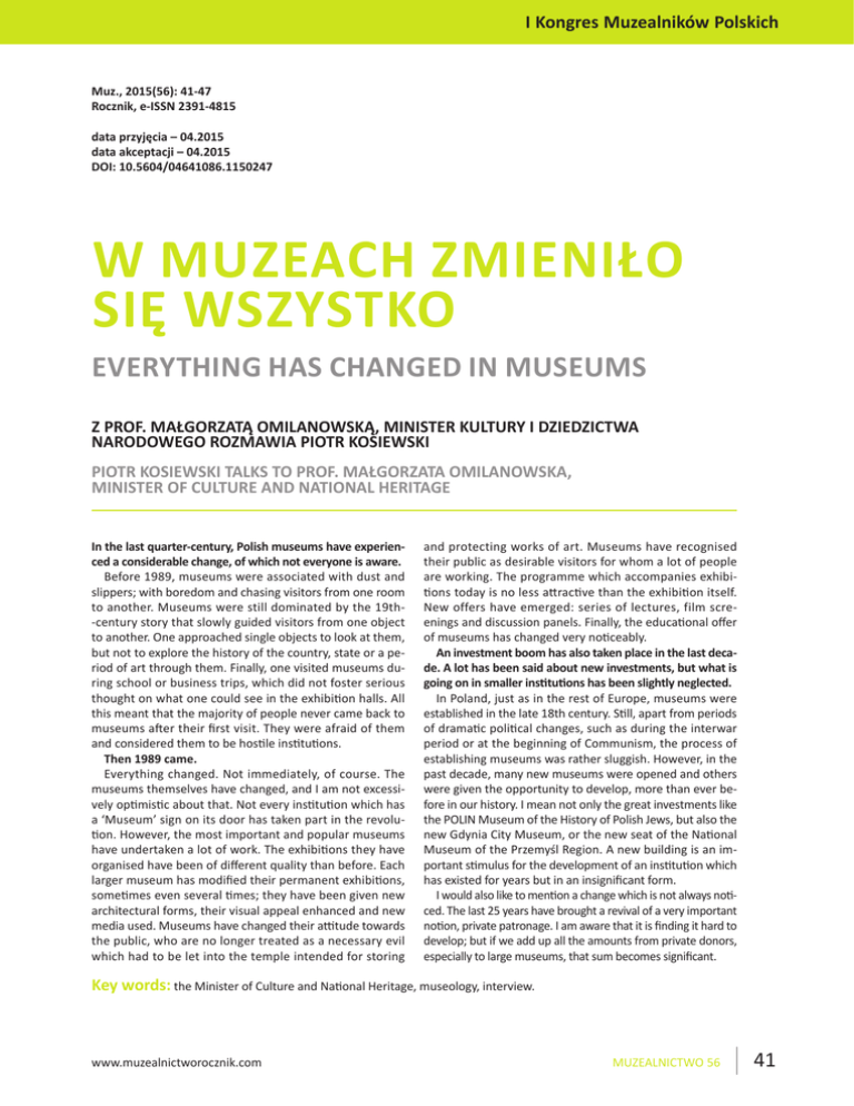 I Kongres Muzealników Polskich Muz., 2015(56): 41-47 Rocznik, e-ISSN 2391-4815 data przyjęcia – 04.2015 data akceptacji – 04.2015 DOI: 10.5604/04641086.1150247 W MUZEACH ZMIENIŁO SIĘ WSZYSTKO EVERYTHING HAS CHANGED IN MUSEUMS Z PROF. MAŁGORZATĄ OMILANOWSKĄ, MINISTER KULTURY I DZIEDZICTWA NARODOWEGO ROZMAWIA PIOTR KOSIEWSKI PIOTR KOSIEWSKI TALKS TO PROF. MAŁGORZATA OMILANOWSKA, MINISTER OF CULTURE AND NATIONAL HERITAGE In the last quarter-century, Polish museums have experienced a considerable change, of which not everyone is aware. Before 1989, museums were associated with dust and slippers; with boredom and chasing visitors from one room to another. Museums were still dominated by the 19th-century story that slowly guided visitors from one object to another. One approached single objects to look at them, but not to explore the history of the country, state or a period of art through them. Finally, one visited museums during school or business trips, which did not foster serious thought on what one could see in the exhibition halls. All this meant that the majority of people never came back to museums after their first visit. They were afraid of them and considered them to be hostile institutions. Then 1989 came. Everything changed. Not immediately, of course. The museums themselves have changed, and I am not excessively optimistic about that. Not every institution which has a ‘Museum’ sign on its door has taken part in the revolution. However, the most important and popular museums have undertaken a lot of work. The exhibitions they have organised have been of different quality than before. Each larger museum has modified their permanent exhibitions, sometimes even several times; they have been given new architectural forms, their visual appeal enhanced and new media used. Museums have changed their attitude towards the public, who are no longer treated as a necessary evil which had to be let into the temple intended for storing and protecting works of art. Museums have recognised their public as desirable visitors for whom a lot of people are working. The programme which accompanies exhibitions today is no less attractive than the exhibition itself. New offers have emerged: series of lectures, film screenings and discussion panels. Finally, the educational offer of museums has changed very noticeably. An investment boom has also taken place in the last decade. A lot has been said about new investments, but what is going on in smaller institutions has been slightly neglected. In Poland, just as in the rest of Europe, museums were established in the late 18th century. Still, apart from periods of dramatic political changes, such as during the interwar period or at the beginning of Communism, the process of establishing museums was rather sluggish. However, in the past decade, many new museums were opened and others were given the opportunity to develop, more than ever before in our history. I mean not only the great investments like the POLIN Museum of the History of Polish Jews, but also the new Gdynia City Museum, or the new seat of the National Museum of the Przemyśl Region. A new building is an important stimulus for the development of an institution which has existed for years but in an insignificant form. I would also like to mention a change which is not always noticed. The last 25 years have brought a revival of a very important notion, private patronage. I am aware that it is finding it hard to develop; but if we add up all the amounts from private donors, especially to large museums, that sum becomes significant. Key words: the Minister of Culture and National Heritage, museology, interview. www.muzealnictworocznik.com MUZEALNICTWO 56 41 W ostatnim ćwierćwieczu w polskich muzeach zaszła radykalna zmiana, którą chyba nie wszyscy dostrzegają. Muzea przed 1989 rokiem kojarzyły się z kurzem i kapciami. Z nudą i przeganianiem zwiedzających z sali do sali. W muzeach dominował typ XIX-wiecznej jeszcze opowieści, która wolno snuła się od obiektu do obiektu. Często chodziło się do nich, by popatrzeć na poszczególne obiekty, a nie za ich pośrednictwem poznawać dzieje kraju, regionu czy jakiejś epoki w sztuce. Wreszcie, do muzeum trafiało się przede wszystkim podczas wycieczek szkolnych czy zakładowych, które nie sprzyjały poważniejszej refleksji nad tym, co można było zobaczyć w salach wystawienniczych. Wszystko to sprawiło, że większość osób po pierwszej wizycie do muzeów nigdy nie wracało. Bało się ich, uważało za instytucje nieprzyjazne. Przyszedł 1989 rok. Zmieniło się wszystko. Nie od razu oczywiście. Zmieniły się same muzea, przy czym nie jestem przesadną optymistką. Nie w każdej instytucji, która na swych drzwiach ma tabliczkę z napisem „Muzeum”, miała miejsce rewolucja. Jednak muzea znajdujące się w głównym obiegu i cieszące się dużą popularnością wykonały ogromną pracę. Wystawy przez nie organizowanie miały inną niż dotychczas jakość. We wszystkich wielkich muzeach zmodyfikowano, czasami po kilkakroć, wystawy stałe. Nadano im nową formułę architektoniczną, zwiększono ich wizualną atrakcyjność oraz zaczęto wykorzystywać nowe media. Instytucje muzealne zmieniły swój stosunek do widza. Przestały go traktować, jako zło konieczne, które trzeba wpuścić do świątyni przeznaczonej do przechowywania i zabezpieczania dzieł sztuki. Muzea uznały widza za pożądanego, atrakcyjnego gościa, dla którego pracuje wiele osób. Wszystko, co dzisiaj towarzyszy wystawom jest nie mniej atrakcyjne, jak same ekspozycje. Pojawiły się oferty: cykle wykładów, pokazy filmowe, dyskusje. Wreszcie, to najbardziej widoczna zmiana, zmieniła się oferta edukacyjna muzeów. W ostatniej dekadzie miał też miejsce boom inwestycyjny. O nowych, wielkich inwestycjach mówi się wiele, zapominając trochę o tym, co dzieje się w mniejszych ośrodkach. W Polsce, podobnie jak w całej Europie, mu