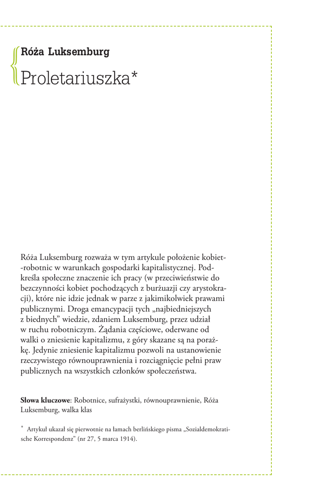 Róz. a Luksemburg Proletariuszka* Róża Luksemburg rozważa w tym artykule położenie kobiet-robotnic w warunkach gospodarki kapitalistycznej. Podkreśla społeczne znaczenie ich pracy (w przeciwieństwie do bezczynności kobiet pochodzących z burżuazji czy arystokracji), które nie idzie jednak w parze z jakimikolwiek prawami publicznymi. Droga emancypacji tych „najbiedniejszych z biednych” wiedzie, zdaniem Luksemburg, przez udział w ruchu robotniczym. Żądania częściowe, oderwane od walki o zniesienie kapitalizmu, z góry skazane są na porażkę. Jedynie zniesienie kapitalizmu pozwoli na ustanowienie rzeczywistego równouprawnienia i rozciągnięcie pełni praw publicznych na wszystkich członków społeczeństwa. Słowa kluczowe: Robotnice, sufrażystki, równouprawnienie, Róża Luksemburg, walka klas * Artykuł ukazał się pierwotnie na łamach berlińskiego pisma „Sozialdemokratische Korrespondenz” (nr 27, 5 marca 1914). } anzpraktyka cyteroet 6/2012 50 Dzień proletariuszki otwiera tydzień socjaldemokracji1. Partia wydziedziczonych wysyła na front swoją kobiecą kolumnę i podejmuje osiem dni ciężkiej pracy, aby na nowych polach siać ziarno socjalizmu. Żądanie politycznego równouprawnienia kobiet jest pierwszą podnoszoną na tym froncie kwestią, dzięki której partia szykuje się do pozyskania nowych zwolenników dla postulatów całej klasy robotniczej. Współczesna najemna proletariuszka wkracza na publiczną scenę jako pionierka klasy robotniczej i jednocześnie całej płci żeńskiej; pierwsza pionierka od tysiącleci. Kobieta z ludu od zawsze ciężko pracowała. W pierwotnej hordzie dźwigała ciężary, zbierała żywność; w prymitywnej wiosce uprawiała zboże, mełła, lepiła garnki; w starożytności obsługiwała jako niewolnica rządzących, których latorośle ssały jej piersi; w średniowieczu przędła w izbie dla feudalnych panów. Ale odkąd istnieje własność prywatna, kobieta z ludu pracuje najczęściej poza wielkim warsztatem społecznej produkcji, a więc także poza kulturą, zamknięta w stłoczonym domu i w nędzy życia rodzinnego. To dopiero kapitalizm wydarł ją rodzinie i narzucił jej jarzmo społecznej produkcji na obcych polach, w warsztatach, na placach budowy, w biurach, w fabrykach i domach towarowych. Jako kobieta z burżuazji pasożytuje ona na społeczeństwie, a jej funkcja polega jedynie na konsumpcji owoców wyzysku, jako drobnomieszczanka jest jucznym zwierzęciem rodziny. Dopiero jako nowoczesna proletariuszka kobieta staje się człowiekiem, ponieważ to dopiero walka, uczestnictwo w tworzeniu kultury i historii ludzkości czyni ją człowiekiem. Dla posiadającej burżujki jej dom jest jej światem. Dla proletariuszki jej domem jest cały świat, wraz z jego cierpieniami i radościami, z jego okrucieństwami i surowością. Proletariuszka wędruje wraz z budowniczymi tunelu z Włoch do Szwajcarii, obozuje w barakach i podśpiewując, suszy ubranka niemowlaków w pobliżu skał, które za pomocą dynamitu wylatują w powietrze. Jako sezonowa pracownica rolna przesiaduje wiosną w hałasie dworców kolejowych na swoich skromnych tobołkach, z chustą na prostej fryzurze, i czeka cierpliwie na transport ze wschodu na zachód. Na międzypokładzie oceanicznych parowców przemieszcza się z każdą falą, która nędzę kryzysu przelewa z Europy do Ameryki. 1 W 1914 roku Międzynarodowy Dzień Kobiet świętowano pod hasłem walki o równouprawnienie i prawa wyborcze kobiet. Ów socjaldemokratyczny dzień kobiet rozpoczął trwający od 8 do 15 maja 1914 roku „czerwony tydzień”, którego celem była agitacja na rzecz socjaldemokracji i zachęcanie do lektury jej wydawnictw prasowych. W rezultacie tej akcji odnotowano istotny przyrost liczby członków partii, a także zwiększenie liczby abonentów prasy socjaldemokratycznej. Róz.a Luksemburg 51 anzpraktyka cyteroet 6/2012 Porusza się w masie różnojęzycznych głodujących proletariuszy, którzy, gdy wzbierze powrotna fala amerykańskiego kryzysu, powrócą do nędzy ojczystej Europy, do nowych nadziei i rozczarowań, do nowego polowania na pracę i chleb. Kobieta z burżuazji nie ma żadnego rzeczywistego interesu w walce o prawa polityczne, ponieważ nie pełni ona w społeczeństwie żadnej funkcji gospodarczej, ponieważ delektuje się gotowymi owocami klasowego panowania. Żądanie równouprawnienia kobiet jest – będzie to szok dla burżujek – czystą ideologią odosobnionych słabych grup bez materialnego zakorzenienia, fantomem sprzeczności między kobietą a mężczyzną, kaprysem. Stąd też burleskowy charakter ruchu sufrażystek2. Proletariuszka potrzebuje praw politycznych, ponieważ pełni w społeczeństwie taką samą funkcję ekonomiczną, jak proletariusz, tak samo jak on haruje dla kapitału, tak samo utrzymuje państwo i tak samo jest przez nie wyzyskiwana i zniewalana. Posiada takie same interesy i do ich obrony potrzebuje takiej samej broni. Jej polityczne żądania są głęboko zakorzenione w społecznej przepaści, która dzieli klasę wyzyskiwanych od klasy wyzyskujących; nie w przeciwieństwie między mężczyzną a kobietą, lecz w przeciwieństwie między kapitałem a pracą. Formalnie rzecz biorąc, polityczne prawa kobiet pozostają w harmonii z burżuazyjnym państwem. Przykłady Finlandii, amerykańskich stanów, pojedynczych gmin udowadniają, że równouprawnienie kobiet nie obala jeszcze państwa, nie narusza panowania kapitału. Ponieważ jednak w rzeczywistości polityczne prawa kobiet są obecnie czysto proletariackim żądaniem klasowym, dla dzisiejszych kapitalistycznych Niemiec brzmią one niczym trąby sądu ostatecznego. Tak jak republika, tak jak milicja, tak jak ośmiogodzinny dzień pracy, tak też prawa wyborcze kobiet mogą zwyciężyć lub polec jedynie wraz z całą walką klasową proletariatu, jedynie za pomocą proletariackich sposobów walki i środków władzy mogą one zostać obr