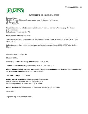 Warszawa 2016-04-05 ZAPROSZENIE DO SKŁADANIA OFERT Zamawiający: Miejskie Przedsiębiorstwo Oczyszczania w m. st. Warszawie Sp. z o.o. ul. Obozowa 43 01-161 Warszawa Przedmiot zamówienia (z wyszczególnieniem rodzaju asortymentu/towaru jego ilości oraz jednostki miary): Zakup i dostawa akcesoriów PC Opis przedmiotu zamówienia: Zakup i dostawa 2szt. karty graficznej Sapphire Radeon R5 230, 1GB DDR3 (64 Bit), HDMI, DVI, VGA, BULK Zakup i dostawa 2szt. Natec Uniwersalny zasilacz/ładowarka/adapter 230V-USB 5V/2A, 4x Port, Black Dostawa na ul. Obozową 43 Płatność 21dni. Wymagany termin realizacji zamówienia: 2016-04-13. Termin składania ofert upływa w dn.: 2016-04-08 o godz. 9:00 Osoba do kontaktu w sprawie zamówienia z ramienia komórki metorycznie odpowiedzialnej za przedmiot zamówienia: Marcin Rukuszewicz Tel. kontaktowy: 22 877 47 98 Oferty należy nadesłać w jednej z następujących form: - drogą mailową na adres: [email protected] - w formie pisemnej: ul. Obozowa 43, pok. 105A Ocena ofert będzie dokonywana na podstawie następujących kryteriów: cena 100% Zapraszamy do składania ofert.