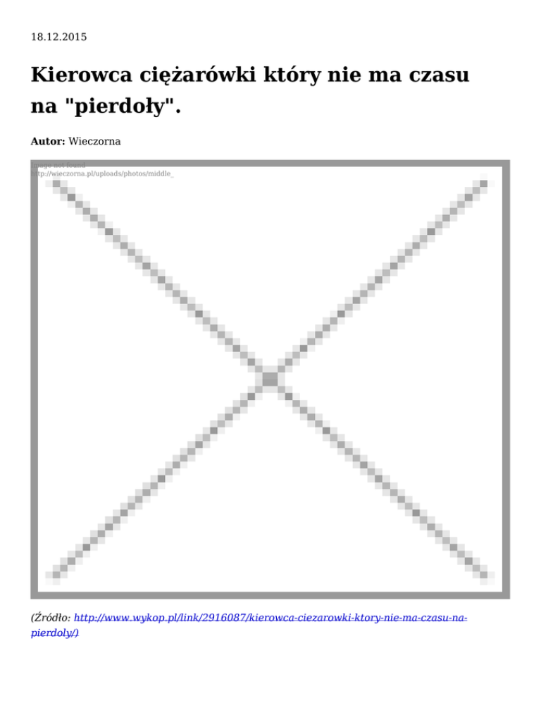 18.12.2015 Kierowca ciężarówki który nie ma czasu na "pierdoły". Autor: Wieczorna Image not found http://wieczorna.pl/uploads/photos/middle_ (Źródło: http://www.wykop.pl/link/2916087/kierowca-ciezarowki-ktory-nie-ma-czasu-napierdoly/) Image not found http://xh.cdn02.imgwykop.pl/c3397993/link_hZCnMlUSDUa4HX2sV1ODhRgMJk5y6KYL,w104h74.jpg Akcja od 0:29.