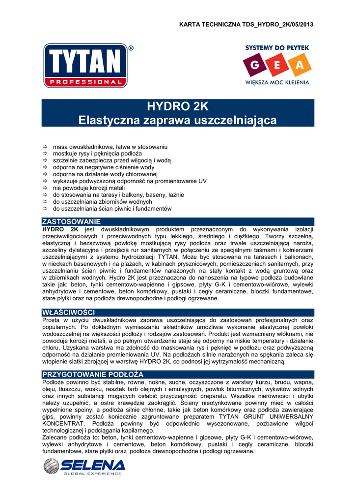 KARTA TECHNICZNA TDS_HYDRO_2K/05/2013 HYDRO 2K Elastyczna zaprawa uszczelniająca masa dwuskładnikowa, łatwa w stosowaniu mostkuje rysy i pęknięcia podłoża szczelnie zabezpiecza przed wilgocią i wodą odporna na negatywne ciśnienie wody odporna na działanie wody chlorowanej wykazuje podwyższoną odporność na promieniowanie UV nie powoduje korozji metali do stosowania na tarasy i balkony, baseny, łaźnie do uszczelniania zbiorników wodnych do uszczelniania ścian piwnic i fundamentów ZASTOSOWANIE HYDRO 2K jest dwuskładnikowym produktem przeznaczonym do wykonywania izolacji przeciwwilgociowych i przeciwwodnych typu lekkiego, średniego i ciężkiego. Tworzy szczelną, elastyczną i bezszwową powłokę mostkującą rysy podłoża oraz trwale uszczelniającą naroża, szczeliny dylatacyjne i przejścia rur sanitarnych w połączeniu ze specjalnymi taśmami i kołnierzami uszczelniającymi z systemu hydroizolacji TYTAN. Może być stosowana na tarasach i balkonach, w nieckach basenowych i na plażach, w kabinach prysznicowych, pomieszczeniach sanitarnych, przy uszczelnianiu ścian piwnic i fundamentów narażonych na stały kontakt z wodą gruntową oraz w zbiornikach wodnych. Hydro 2K jest przeznaczona do nanoszenia na typowe podłoża budowlane takie jak: beton, tynki cementowo-wapienne i gipsowe, płyty G-K i cementowo-wiórowe, wylewki anhydrytowe i cementowe, beton komórkowy, pustaki i cegły ceramiczne, bloczki fundamentowe, stare płytki oraz na podłoża drewnopochodne i podłogi ogrzewane. WŁAŚCIWOŚCI Prosta w użyciu dwuskładnikowa zaprawa uszczelniająca do zastosowań profesjonalnych oraz popularnych. Po dokładnym wymieszaniu składników umożliwia wykonanie elastycznej powłoki wodoszczelnej na większości podłoży i rodzajów zastosowań. Produkt jest wzmacniany włóknami, nie powoduje korozji metali, a po pełnym utwardzeniu staje się odporny na niskie temperatury i działanie chloru. Uzyskana warstwa ma zdolność do maskowania rys i pęknięć w podłożu oraz podwyższoną odporność na działanie promieniowania UV. Na podłożach silnie narażonych na spękania zaleca się wtopienie siatki zbrojącej w warstwę HYDRO 2K, co podnosi jej wytrzymałość mechaniczną. PRZYGOTOWANIE PODŁOŻA Podłoże powinno być stabilne, równe, nośne, suche, oczyszczone z warstwy kurzu, brudu, wapna, oleju, tłuszczu, wosku, resztek farb olejnych i emulsyjnych, powłok bitumicznych, wykwitów solnych oraz innych substancji mogących osłabić przyczepność preparatu. Wszelkie nierówności i ubytki należy uzupełnić, a ostre krawędzie zaokrąglić. Ściany nieotynkowane powinny mieć w całości wypełnione spoiny, a podłoża silnie chłonne, takie jak beton komórkowy oraz podłoża zawierające gips, powinny zostać koniecznie zagruntowane preparatem TYTAN GRUNT UNIWERSALNY KONCENTRAT. Podłoża powinny być odpowiednio wysezonowane, pozbawione wilgoci technologicznej i podciągania kapilarnego. Zalecane podłoża to: beton, tynki cementowo-wapienne i gipsowe, płyty G-K i cementowo-wiórowe, wylewki anhydrytowe i cementowe, beton komórkowy, pustaki i cegły ceramiczne, bloczki fundamentowe, stare płytki oraz podłoża drewnopochodne i podłogi ogrzewane. KARTA TECHNICZNA TDS_HYDRO_2K/05/2013 PRZYGOTOWANIE MASY Elastyczna zaprawa uszczelniająca HYDRO 2K oferowana jest w dwu komponentowych zestawach: składnik A – sucha mieszanka, składnik B – emulsja. Składniki te pakowane są w oddzielne pojemniki w dopasowanych do wymieszania proporcjach. Emulsję (składnik B) należy przelać do odpowiedniej wielkości pojemnika a następnie równocześnie dosypywać suchej mieszanki (składnik A) i mieszać całość mieszadłem wolnoobrotowym aż do uzyskania jednorodnej konsystencji i barwy. Produkt nadaje się do użycia po upływie ok. 5 minut i ponownym wymieszaniu. Do wykonania pierwszej warstwy hydroizolacji można przygotować produkt z dodatkiem max. 3% wody. Nie mieszać z innymi materiałami. SPOSÓB UŻYCIA Masę należy nakładać na przygotowane podłoże w co najmniej dwóch warstwach. Pierwszą warstwę nakładać pędzlem lub szczotką, dbając o dokładne wtarcie jej w podłoże dla zwiększenia przyczepności. Prace należy zacząć od miejsc, gdzie będą stosowane taśmy dylatacyjne oraz kształtki i kołnierze uszczelniające. W świeżo nałożoną na podłoże masę należy wtopić stosowane akcesoria uszczelniające, zwracając szczególną uwagę na precyzję wtopienia. Następnie wykonać pierwszą warstwę uszczelnienia na całej izolowanej powierzchni. Grubość warstwy powinna zapewnić równomierne, dokładne i szczelne pokrycie izolowanego podłoża. Po całkowitym wyschnięciu pierwszej warstwy (ok. 3 h) można przystąpić do nakładania kolejnej. Czynność tę należy wykonać na całej izolowanej powierzchni pędzlem lub gładką pacą stalową. Ewentualne kolejne warstwy należy nakładać dopiero po wyschnięciu wcześniejszych. Grubość pojedynczej warstwy nie powinna przekraczać 1 mm, a końcowa grubość uzyskanej powłoki nie powinna być mniejsza niż 2 mm. Prace wykonywać w temperaturze powietrza, podłoża i produktu od +5°C do +25°C. chroniąc świeżo nałożoną warstwę przez minimum 12 h przed niekorzystnymi warunkami zewnętrznymi oraz przez minimum 7 dni przed działaniem wody pod ciśnieniem. Uzyskaną powłokę należy docelowo trwale zabezpieczyć okładziną. Do przyklejania płytek stosować należy kleje klasy C2: GEA536, GEA 636, GEA736 lub GEA836. ZUŻYCIE 2 Średnio zużywa się ok. 1,5 kg produktu na 1 m izolowanej powierzchni przy grubości warstwy 1 mm. izolacja typ lekki (przeciwwilgociowa) typ średni (woda gruntowa) typ ciężki (woda pod ciśnieniem) grubość powłoki [mm] zużycie [kg/m²] 2,0 ok. 3,0 2,5 ok. 3,75 3,0 ok. 4,5 DANE TECHNICZNE proporcje mieszania komponentów: A do B temperatura stosowania czas użycia po wymieszaniu czas schnięcia pierwszej warstwy możliwość wch