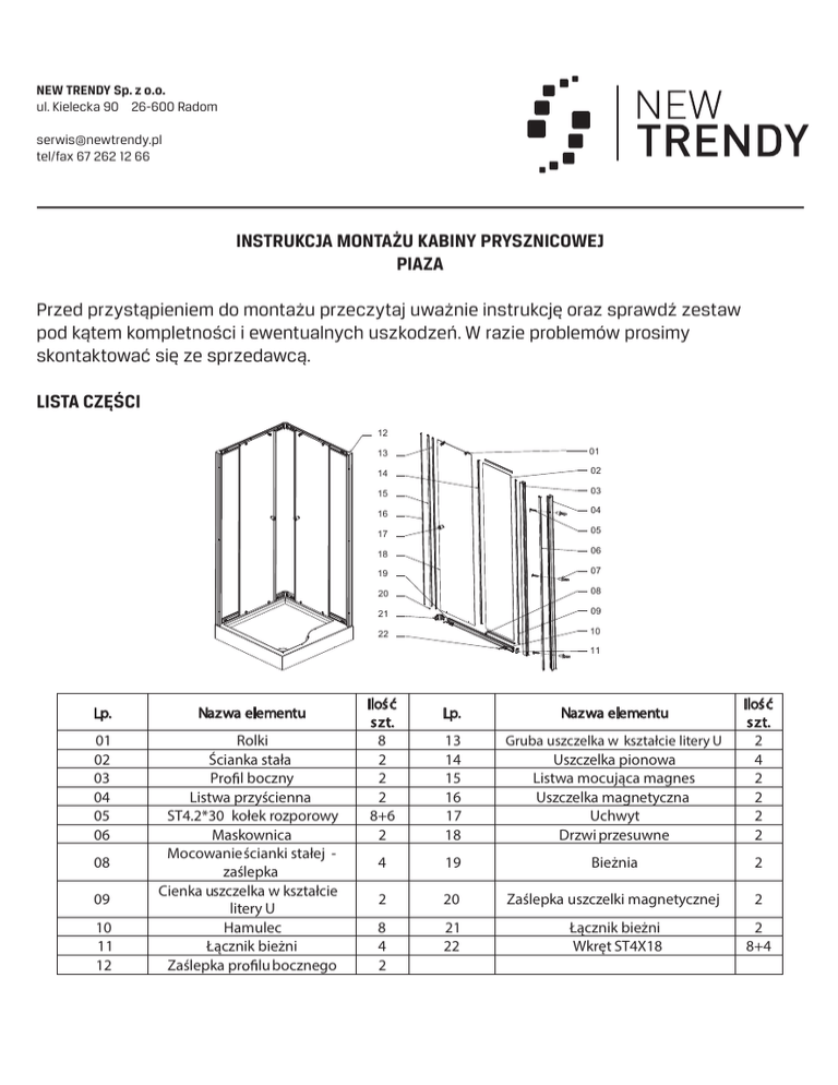 NEW TRENDY Sp. z o.o. ul. Kielecka 90 26-600 Radom [email protected] tel/fax 67 262 12 66 INSTRUKCJA MONTAŻU KABINY PRYSZNICOWEJ PIAZA Przed przystąpieniem do montażu przeczytaj uważnie instrukcję oraz sprawdź zestaw pod kątem kompletności i ewentualnych uszkodzeń. W razie problemów prosimy skontaktować się ze sprzedawcą. LISTA CZĘŚCI 12 13 01 14 02 15 03 16 04 17 05 18 06 19 07 20 08 21 09 22 10 11 Lp. Nazwa elementu 01 02 03 04 05 06 Rolki Ścianka stała Pr l boczny Listwa przyścienna ST4.2*30 kołek rozporowy Maskownica Mocowanie ścianki stałej zaślepka Cienka uszczelka w kształcie litery U Hamulec Łącznik bieżni Zaślepka pr lu bocznego 08 09 10 11 12 Ilość szt. 8 2 2 2 8+6 2 Lp. Nazwa elementu 13 14 15 16 17 18 Gruba uszczelka w kształcie litery U Uszczelka pionowa Listwa mocująca magnes Uszczelka magnetyczna Uchwyt Drzwi przesuwne Ilość szt. 2 4 2 2 2 2 4 19 Bieżnia 2 2 20 Zaślepka uszczelki magnetycznej 2 8 4 2 21 22 Łącznik bieżni Wkręt ST4X18 2 8+4 1. Postaw brodzik na ziemi i wypoziomuj go używając poziomicy. Zamontuj odpowiednio odpływ. 2. Wsuń zaślepkę ścianki stałej w szczelinę w bieżniach a następ nie zamocuj łączniki bieżni (a) 3. Po nałożeniu wąskiej uszczelki na pionową krawędź ścianki stałej, wsuń ściankę stałą w szczeliny w bieżniach górnej i dolnej i zamocuj profil boczny.Użyj wkrętów 4.2x30 aby połączyć bieżnie i profil boczny (b) 4. Połącz listwę mocującą magnes (15) z drzwiami przesuwnymi używając szerokiej uszczelki (13) i wsuń magnes w odpowiednie miejsce w aluminiową listwę mocującą i zablokuj magnes za pomocą zaślepki (20) (c) 5. Zamocuj rolki nadrzwiach przesuwnych Rolki górne Rolki dolne Rolki dolne 6. Połącz elementy bieżni górnejza pomocą łącznika narożnego i wkrętów 4.2x10. (e) 7. Zmontowaną konstrukcję postaw na brodziku, ustaw pion na profilu bocznym, a bieżnie dolną dopasuj do brodzika 8. Wywierć otwory i przymocuj kabinę za pomocą kołków rozporowych(f) 9. Zamocuj wkręty zabezpieczające wysuwanie się kabiny z profilu przyściennego 10. Drzwi przesuwne zamocuj w bieżniach i wyreguluj rolki w pionie 11. Przykręć uchwyty w drzwiach (g) 12. Zamocuj zaślepkę profilu pionowego(h) oraz hamulce na bieżniach (I) 13. Uszczelnij miejsce między bieżnią i brodzikiem oraz między ścianą i profilem pionowym za pomocą silikonu c i h d f g a b e KONSERWACJA Prosimy o czyszczenie aluminiowych powierzchni kabiny oraz szyb miękką szmatka używając nie żrących i nie rysujących środków czyszczących. W celu zapewnienia prawidłowego działania rolek należy je raz w miesiącu zabezpieczyć wazeliną sanitarną. Stosowani e środków nie zalecanych przez producenta i niewłaściwa konserwacja rolek może narazić Państwa na utratę gwarancji. Życzymy przyjemnego użytkowania naszego produktu