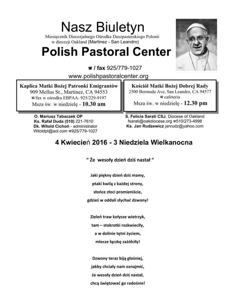 Nasz Biuletyn Miesięcznik Diecezjalnego Ośrodka Duszpasterskiego Polonii w diecezji Oakland (Martinez - San Leandro) Polish Pastoral Center ? / fax 925/779-1027 www.polishpastoralcenter.org Kaplica Matki Bożej Patronki Emigrantów 909 Mellus St., Martinez, CA 94553 ?/fax w ośrodku EBPAA: 925/229-9197 Msza św. w niedzielę - 10.30 am O. Mariusz Tabaczek OP Ks. Rafał Duda (510) 221-7610 Dk. Witold Cichoń - administrator [email protected] ?925/779-1027 Kościół Matki Bożej Dobrej Rady 2500 Bermuda Ave, San Leandro, CA 94577 ? cafeteria Msza św. w niedzielę - 12.30 pm S. Felicia Sarati CSJ, Diocese of Oakland [email protected] ?510/273-4998 Ks. Jan Rudzewicz [email protected] 4 Kwiecień 2016 - 3 Niedziela Wielkanocna “ Że wesoły dzień dziś nastał “ Jaki piękny dzień dziś mamy, ptaki kwilą z każdej strony, słońce złoci promieniście, gdzieś w oddali słychać dzwony! Zieleń traw kołysze wietrzyk, tam – stokrotki rozkwieciły, a w dolinie tętni życiem, mlecze łączkę zażółciły! Dzwony teraz biją głośniej, jakby chciały nam oznajmić, że wesoły dzień dziś nastał, chcą świętować go radośnie! Że Pan z martwych powstał rankiem, śmierć haniebną Bóg pokonał, że odkupił nasze winy, ludzka dusza jest zbawiona! (Alicja Jęczmień, Concord –Wielkanoc 2016) Abp Hoser o adhortacji Franciszka: "To ogromne wzmocnienie rodziny! Papież podkreśla, że nauka Kościoła jest integralna i nie należy nic zmieniać" Adhortacja „Amoris laetitia” papieża Franciszka będzie pozytywnym impulsem dla rodzin, ogromnym wzmocnieniem rodziny. Bp warszawsko-praski podkreśla w niej, że dokument posynodalny potwierdza dotychczasowe nauczanie Kościoła, dotyczące małżeństwa i rodziny, dostrzega trudne sytuacje wielu z nich, ale będzie pozytywnie wzmacniać te podstawową ludzką wspólnotę. Ponizej fragmenty wypowiedzi abp Henryka Hosera: Adhortacja papieża Franciszka zatytułowana „Amoris Laetitia” zwraca uwagę na radość, płynącą z miłości małżeńskiej i rodzinnej jest dokumentem bardzo oczekiwanym. Pojawiały się głosy, że Ojciec Święty nie ma zamiaru publikowania adhortacji posynodalnej, krążyły informacje, że poprzestanie na zaakceptowaniu raportu końcowego obydwu synodów - nadzwyczajnego i zwyczajnego. Tymczasem ukazała się adhortacja, która jest bardzo pojemnym dokumentem i która przekracza ramy obydwu raportów posynodalnych. Jest to bardzo osobisty dokument Ojca Świętego, pisany w pierwszej osobie liczby pojedynczej i często odwołuje się do nauczania Kościoła, formułowanego przez poprzedników - „Humanae vitae” Pawła VI, adhortacji Jana Pawła II „Familiaris consortio”, ale też nauczania św. Tomasza z Akwinu. Jest to więc bardzo całościowe, syntetyczne spojrzenie na dotychczasowe, niezmienne nauczanie Kościoła i Ojciec Święty podkreśla, że jest ono niezmienne. Nie może bowiem zmieniać tego nauczania, ponieważ jest ono elementem magisterium Kościoła. Adhortacja papieża Franciszka jest dokumentem znacznie rozszerzonym jeśli porówna się go z konkluzjami obu synodów o rodzinie, ma dziewięć rozdziałów, ukazujących z jednej strony małżeństwo i rodzinę w świetle Słowa Bożego i zamyśle Jezusa Chrystusa jako sakramentu. Jest też bardzo szeroko omówiona sytuacja rodziny w świecie współczesnym, wszystkie wyzwania, które przed nią stoją. Wszystkie te rozdziały zmierzają do wskazania zastosowań duszpasterskich. Pierwszym słowem, które się wybija w tym dokumencie, to słowo ‘towarzyszyć’. Kościół ma towarzyszyć ludziom we wszystkich sytuacjach życiowych, mając na uwadze dobro każdej osoby, która bierze udział w życiu małżeńskim, rodzinnym, a także będąca w trudnych sytuacjach rozpadu małżeństwa czy rodziny. We wszystkich tych wydarzeniach Kościół ma być obecny, szukać ludzi i wspierać ich, szukać rozwiązań pozytywnych, dobrych perspektyw życiowych. Dostrzegamy tu również tendencję przeniesienia odpowiedzialności z Kościoła powszechnego na Kościoły lokalne i osobę biskupa diecezjalnego. Uwzględniając nauczanie Kościoła powinien odczytać sytuację życiową każdej osoby, każdej rodziny i zastosować rozwiązania, które są do dyspozycji, m.in. „Mitis iudex Dominus Iesus”, czyli dokumencie, upraszczającym procedurę orzekania nieważności małżeństwa aby trwała krócej a jej przebieg był ograniczony do Kościoła lokalnego, co niewątpliwie ułatwi życie tym, którzy zwracają się do trybunałów kościelnych. Ten dokument stanowi ogromne wyzwanie, trzeba go dobrze poznać, przekazać wiernym i zbudować duszpasterstwo rodzin w oparciu o ten dokument po to, żeby księża, Kościół lokalny, parafialny, mogli towarzyszyć we wszystkich ich sytuacjach - nie tylko sytuacji aktualnej, ale też konieczności ich dobrego przygotowania do zawarcia związku małżeńskiego. I tu dokument odwołuje się do nauczania Jana Pawła II, który ustanowił te wielkie etapy przygotowania do życia małżeńskiego, które są nadal aktualne, a nie są aplikowane. Mamy więc dobre pomoce, dzięki którym Kościół jest zdolny do realizowania swojego zadania - ewangelizacji małżeństwa i rodziny. Środowiska, które spodziewały się zmian, dotyczących Komunii św. dla rozwodników czy stanowiska wobec stosowania antykoncepcji, mogą poczuć się zawiedzione. Ojciec Święty podkreśla, że nauka Kościoła jest integralna i nie należy niczego zmieniać. Kościół nie ma zresztą władzy zmieniania nauki o sakramentach, które nie są własnością Kościoła, a Pana Boga, Kościół jest jedynie strażnikiem depozytu, skarbów, które zostały mu powierzone i dzieli się nimi w granicach, w których jest to możliwe. Próby sprowadzenia związków homoseksualnych do rangi małżeństwa też spełzły na niczym, w tym dokumencie zostały oddalone. W adhortacji czytamy też o rozeznaniu duszpasterskim, dotycząc