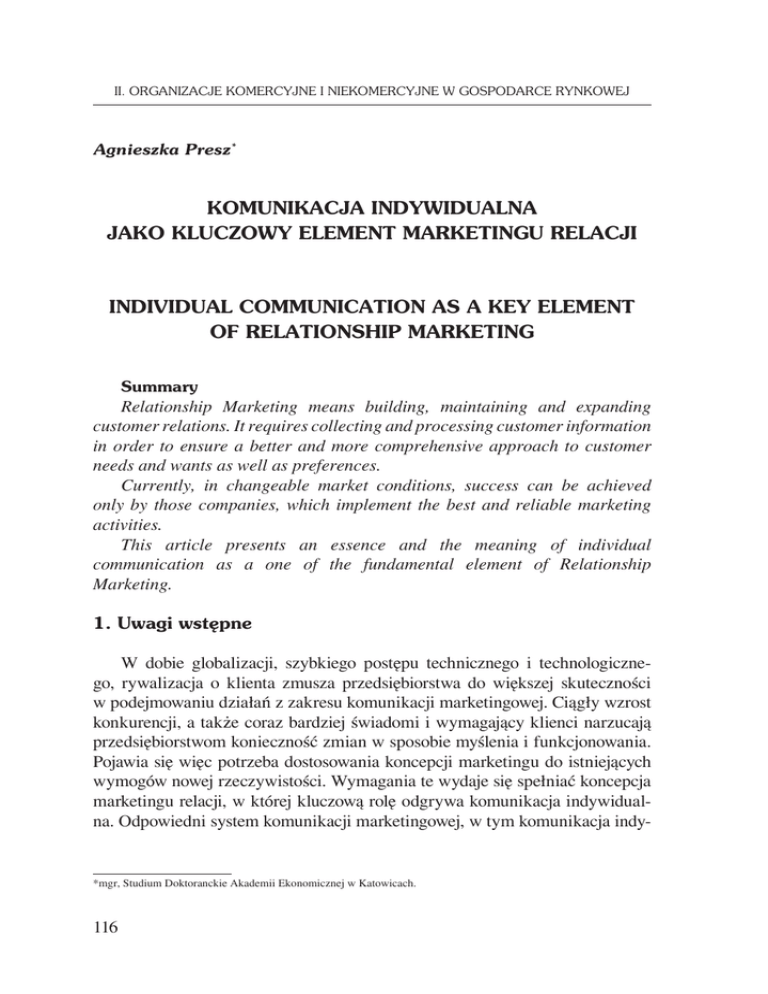 II. Organizacje komercyjne i niekomercyjne w gospodarce rynkowej Agnieszka Presz* KOMUNIKACJA INDYWIDUALNA JAKO KLUCZOWY ELEMENT MARKETINGU RELACJI INDIVIDUAL COMMUNICATION AS A KEY ELEMENT OF RELATIONSHIP MARKETING Summary Relationship Marketing means building, maintaining and expanding customer relations. It requires collecting and processing customer information in order to ensure a better and more comprehensive approach to customer needs and wants as well as preferences. Currently, in changeable market conditions, success can be achieved only by those companies, which implement the best and reliable marketing activities. This article presents an essence and the meaning of individual communication as a one of the fundamental element of Relationship Marketing. 1. Uwagi wstępne W dobie globalizacji, szybkiego postępu technicznego i technologicznego, rywalizacja o klienta zmusza przedsiębiorstwa do większej skuteczności w podejmowaniu działań z zakresu komunikacji marketingowej. Ciągły wzrost konkurencji, a także coraz bardziej świadomi i wymagający klienci narzucają przedsiębiorstwom konieczność zmian w sposobie myślenia i funkcjonowania. Pojawia się więc potrzeba dostosowania koncepcji marketingu do istniejących wymogów nowej rzeczywistości. Wymagania te wydaje się spełniać koncepcja marketingu relacji, w której kluczową rolę odgrywa komunikacja indywidualna. Odpowiedni system komunikacji marketingowej, w tym komunikacja indy- *mgr, Studium Doktoranckie Akademii Ekonomicznej w Katowicach. 116 widualna, sprzyja przepływom informacji o potrzebach klientów, nawiązywaniu kontaktów z klientami, a następnie tworzeniu długotrwałych więzi. Celem niniejszego artykułu jest omówienie istoty komunikacji indywidualnej oraz jej znaczenia w koncepcji marketingu relacji. 2. Marketing relacji – istota koncepcji Termin „marketing relacji” (z ang. relationship marketing) został po raz pierwszy użyty w literaturze w latach 70. Autorzy opracowań z zakresu marketingu relacji używają różnych odpowiedników terminu relationship marketing, np. marketing partnerski, marketing relacyjny, marketing więzi, marketing związków [Otto 2004, s. 36]. Koncepcja marketingu relacji wyrosła ze spostrzeżenia, że wartość klienta należy rozpatrywać w perspektywie długoterminowej, a nie w kategoriach pojedynczych, odrębnych transakcji. Jedna z pierwszych definicji marketingu relacji brzmi: „ Marketing relacji polega na identyfikowaniu, ustanawianiu, utrzymywaniu i umacnianiu przynoszących zysk relacji z klientami i innymi interesariuszami, tak by każda z zaangażowanych stron osiągnęła swoje cele; dokonuje się to poprzez wymianę i spełnianie wzajemnych obietnic” [Palmer, Lindgreen, Vanhamme 2005, nr 3]. Leonard Berry, uważany za twórcę pierwszej definicji marketingu relacji, określa go jako tworzenie, utrzymywanie i wzbogacanie relacji z klientami. Pozyskanie nowego klienta stanowi jedynie pierwszy krok w procesie marketingu [Otto 2004, s. 41]. Kolejnym autorem, który dokonał dużego wkładu w budowę teorii marketingu relacji jest Philip Kotler. Stworzył on klasyfikację zaangażowania firmy w stosowanie marketingu relacji, tworząc pięć sposobów odnoszenia się do klienta: • sposób podstawowy - sprzedawca sprzedaje produkt, lecz po sprzedaży nie kontaktuje się już z klientem nie widząc takiej potrzeby. Jest to orientacja dość typowa, zorientowana tylko na produkt; • sposób reagujący - sprzedawca sprzedaje produkt, zachęcając jednocześnie klienta, żeby zadzwonił, jeśli będzie miał jakieś pytania lub wątpliwości; • sposób odpowiedzialny - sprzedawca dzwoni do klienta wkrótce po dokonaniu sprzedaży, aby sprawdzić, czy produkt spełnia jego oczekiwania. Sprzedawca prosi przy tej okazji klienta o wyrażenie sugestii i wskazówek, które mogą posłużyć ulepszeniu produktu oraz o uwagi dotyczące zauważonych niedostatków. Zyskane w ten sposób informacje pomagają przedsiębiorstwu w ciągłym udoskonalaniu swojej oferty; 117 sposób proaktywny - sprzedawca telefonuje od czasu do czasu do klienta, proponując mu możliwość zakupu ulepszonej wersji produktu, albo informując go o planowanych nowych wersjach; • sposób partnerski - przedsiębiorstwo nieustannie współpracuje z klientem tak, aby odkryć metody umożliwiające klientowi zwiększenie oszczędności przy dokonywaniu zakupu oraz optymalne wykorzystanie możliwości danego produktu [Kotler 1999, s. 43]. Polscy autorzy również wnieśli duży wkład w definiowanie marketingu relacji, a na szczególną uwagę zasługuje zwłaszcza definicja M. Rydla i C. Ronkowskiego, dla których „marketing relacji oznacza koncepcję zarządzania i działania na rynku, według której skuteczność rynkowa firm zależna jest od nawiązywania partnerskich stosunków z uczestnikami rynku. Koncepcja ta zakłada budowę związków lojalnościowych z klientami i aliansów strategicznych z partnerami w biznesie [Mitręga 2009, s. 33]. Mimo mnogości i różnorodności definicji, można wyodrębnić kilka cech charakterystycznych dla marketingu relacji; są to: • koncentracja na utrzymaniu klienta - przedsiębiorstwa powinny dokonać przeszacowania środków wydatkowanych na działalność marketingową w ten sposób, by więcej niż dotychczas przeznaczyć na zatrzymanie przy sobie już pozyskanych klientów; • długi okres współpracy - w partnerstwie przedsiębiorstwo nie koncentruje się na jednej, najbliższej transakcji, lecz na wielu transakcjach, które będą realizowane w przyszłości; • jakość obsługi klienta - od sposobu, w jaki zostanie obsłużony klient, zależy, czy zechce do nas wrócić; • indywidualizacja - założeniem marketingu relacji jest zastępowanie masowej obsługi klientów indywidualnym podejściem do każdego z nich; • stała dwukierunkowa komunikacja z klientem - partnerzy prowadzą między sobą stały dialog, którego celem 