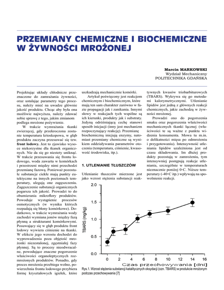 Przemiany chemiczne i biochemiczne w żywności mrożonej Marcin MARKOWSKI Wydział Mechaniczny POLITECHNIKA GDAŃSKA Projektując układy chłodnicze przeznaczone do zamrażania żywności, oraz ustalając parametry tego procesu, należy mieć na uwadze głównie jakość produktu. Chcąc aby była ona możliwie najwyższa, należy zdawać sobie sprawę z tego, jakim zmianom podlega mrożone pożywienie. W trakcie wymrażania tkanki zwierzęcej, gdy przekroczona zostanie temperatura krioskopowa, w głąb produktu zaczyna przesuwać się tzw. front lodowy. Jest to zjawisko wysoce niekorzystne dla tkanek organicznych. Nie da się go niestety uniknąć. W trakcie przesuwania się frontu lodowego, woda zawarta w komórkach i przestrzeni między nimi przechodzi przemianę fazową. Ponieważ pozostałe substancje ciekłe mają punkty eutektyczne na innych poziomach temperatury, ulegają one zagęszczeniu. Zagęszczenie substancji organicznych pogarsza ich jakość. Prowadzi to do obumierania mikroflory produktów. Powoduje wystąpienie procesów osmotycznych (w wyniku których rozpadają się błony komórkowe). Dodatkowo, w trakcie wymrażania wody zachodzi wymiana jonów między fazą płynną a strukturami komórkowymi. Posuwający się w głąb produktu front lodowy wywiera ciśnienie na tkanki. W efekcie jego wzrostu dochodzi do wyprowadzenia poza objętość mrożonki niezestalonej, zgęstniałej fazy płynnej. Są to procesy nieodwracalne, powodujące znaczne pogorszenie właściwości organoleptycznych rozmrożonych produktów. Ponadto, gdy proces mrożenia przebiega wolno, powierzchnia frontu lodowego przybiera formę kryształowych igiełek, które uszkadzają mechanicznie komórki. Artykuł poświęcony jest reakcjom chemicznym i biochemicznym, które mają ten sam charakter zarówno w fazie propagacji jak i zanikania. Innymi słowy w reakcjach tych wspólne są ich kierunki, produkty jak i substraty. Jedyną odróżniającą cechę stanowi sposób inicjacji (inny jest mechanizm rozpoczynający reakcję). Przemianę biochemiczną inicjują enzymy, natomiast przemiany chemiczne są wynikiem oddziaływania parametrów otoczenia (temperatura, ciśnienie, kwasowość środowiska, itp.). 1. Utlenianie tłuszczów Utlenianie tłuszczów mierzone jest jako wzrost stężenia substancji reak- tywnych kwasów triobarbiturowych (TBARS). Wykrywa się go metodami kalorymetrycznymi. Utlenianie lipidów jest jedną z głównych reakcji chemicznych, jakie zachodzą w żywności mrożonej. Prowadzi ono do pogorszenia smaku oraz pogorszenia właściwości mechanicznych tkanki łącznej (właściwości te są ważne z punktu widzenia konsumenta. Mowa tu m.in. o delikatności mięsa po odmrożeniu i przygotowaniu). Intensywność utleniania lipidów uzależniona jest od czasu składowania. Im dłużej produkty pozostają w zamrożeniu, tym intensywniej postępują reakcje utleniania, szczególnie w temperaturach nieznacznie poniżej 0◦C. Niższe temperatury (-40◦C itp.) wpływają na spowolnienie reakcji. Rys.1. Wzrost stężenia substancji katalitycznych oksydacji (ozn. TBARS) w produkcie mrożonym podczas przechowywania [7] Mechanizmem utleniania tłuszczów w produktach mrożonych jest peroksydacja. Oznacza to dosłownie niszczenie lipidów na drodze utleniania. W procesie tym wolne rodniki pobierają elektrony od lipidów z których zbudowane są błony komórkowe (powodując tym samym ich rozpad i propagację materiału komórkowego do przestrzeni międzykomórkowej). Reakcja ta ma charakter łańcuchowy i kończy się w zasadzie dopiero po całkowitym utlenieniu się lipidów w komórce. Najbardziej narażone na tą formę zniszczenia są polikwasy tłuszczowe nienasycone z racji swojej budowy cząsteczkowej (występowanie wielu podwójnych wiązań pomiędzy którymi znajdują się grupy metylenowe-CH2, które zawierają niezwykle reaktywny wodór). Inicjatorem reakcji są wolne rodniki kwasów tłuszczowych (reaktywne formy tlenu tj. OH- HO2). Wolne rodniki łączą się z atomami wodoru tworząc wodę i kolejny wolny rodnik kwasu tłuszczowego. Reakcja postępuje w sposób lawinowy, gdyż wolne rodniki kwasów tłuszczowych są niezwykle reaktywne i łatwo łączą się z wolnym tlenem cząsteczkowym tworząc peroksylowy wolny rodnik kwasu tłuszczowego. Rodniki peroksylowe są również niezwykle reaktywne i łatwo łączą się z wolnymi kwasami tłuszczowymi tworząc kolejne wolne rodniki oraz peroksydy (lipidowe lub cykliczne). Przebieg takiej reakcji ukazany jest schematycznie na rysunku 2. Reakcja zaczyna zanikać w momencie, gdy rodniki zaczną reagować ze sobą nawzajem (a nie z kwasami tłuszczowymi). Produktem połączenia dwóch wolnych rodników są bowiem związki nie biorące udziału w reakcji peroksydacji. żywe organizmy wytwarzają na ogół mechanizmy mające zapobiec propagacji tej reakcji. W tkance martwej proces może przebiegać aż do przereagowania wszystkich kwasów tłuszczowych i całego tlenu z tkanek. Peroksydacja uszkadza błony komórkowe. Produkty końcowe reakcji są mutagenne i kancerogenne. Są też wysoce toksyczne. Substancje zapobiegające postępowaniu peroksydacji są ogromnie ważne dla ssaków. Myszy laboratoryjne, które pozbawiono (za pomocą manipulacji genomem) enzymu GPX4 (fosforolipid hydroperoksydowy) zapobiegającego peroksydacji nie przeżyły nawet 8 dni w formie embrionalnej (nie dochodziło do wydania miotu). Kolejną przemianą jaka zachodzi w mrożonkach jest lipoliza. Jest to proces rozkładu hydrolitycznego triacyloglicerolu (trójglicerydu) w tkance tłuszczowej. W efekcie lipolizy dochodzi do powstania długołańcuchowych kwasów tłuszczowych i glicerolu. Niektóre postaci kwasów tłuszczowych są szkodliwe dla zdrowia, bowiem doprowadzają między innymi do miażdżycy tętnic. 2. Przemiany białek • Proteoliza Za pomocą znacznika elektroforetycznego zaob- Rys.2. Mechanizm utleniania tłuszczów w produktach mrożonych (