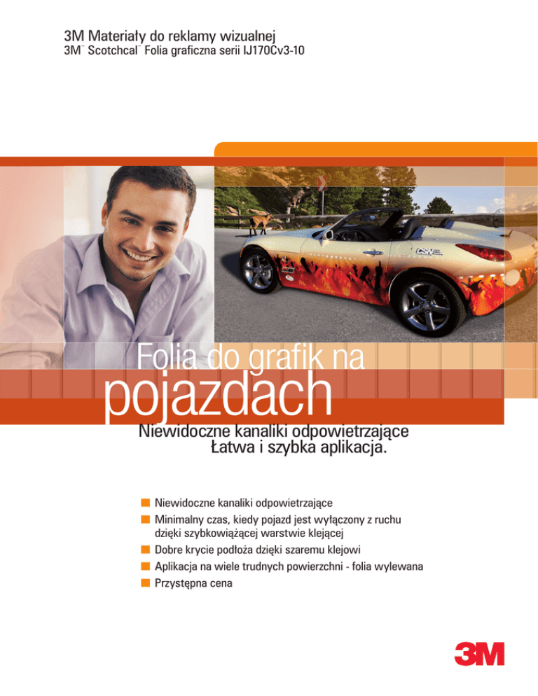3M Materiały do reklamy wizualnej 3M Scotchcal Folia graficzna serii IJ170Cv3-10 ™ ™ Folia do grafik na pojazdach Niewidoczne kanaliki odpowietrzające Łatwa i szybka aplikacja. n Niewidoczne kanaliki odpowietrzające n Minimalny czas, kiedy pojazd jest wyłączony z ruchu dzięki szybkowiążącej warstwie klejącej n Dobre krycie podłoża dzięki szaremu klejowi n Aplikacja na wiele trudnych powierzchni - folia wylewana n Przystępna cena 3M Scotchcal Folia graficzna serii IJ170Cv3-10 ™ ™ Nowa graficzna folia wylewana z klejem czułym na nacisk typu Comply™ wersja 3. Folia uzupełnia istniejące portfolio graficznych folii wylewanych 3M z segmentu premium. Świetnie nadaje się tam, gdzie cena jest kluczowym czynnikiem. 3M Scotchcal serii IJ 170 Cv3 to alternatywa do modnego oklejania całkowitego pojazdów, która doskonale wpisuje się w potrzeby rynku. Cechy i przewagi produktu n Klej Comply wersja 3 z kanalikami odpowietrzającymi n Dobra adhezja na powierzchniach przetłaczanych i nitowanych n Szary klej zapenia świetne właściwości kryjące folii n Szybkie i bez pozostałości kleju usuwanie folii z karoserii poprzez podgrzanie n Folia wylewana zapewniająca odpowiednią elastyczność i stabilność wymiarów Folie 3M to bezpieczeństwo aplikacji i gwarancja najwyższej jakości n Gwarancja 3M™ MCS™ – pierwsza i najszersza na rynku reklamowym gwarancja, która zapewnia optymalne zachowanie grafiki w całym okresie objętym gwarancją n 3M Performance Guarantee – gwarancja najwyższej jakości druku na zatwierdzonych przez 3M wybranych kombinacjach drukarek i tuszy Zastosowanie: n Krótko i długookresowe grafiki samochodowe oraz oznakownania i reklamy wewnętrzne i zewnętrzne n Możliwość aplikacji na proste przetłoczenia i powierzchnie nitowane n Folia usuwalna n Zaprojektowana do druku cyfrowego Piezo Ink Jet W celu uzyskania dodatkowych informacji zapraszamy na stronę http://www.3m.pl/reklama 3M Poland Sp. z o.o. Dział Materiałów do Reklamy Wizualnej al. Katowicka 117 05-830 Nadarzyn, Kajetany k/Warszawy tel./fax 22 739 60 20 www.3m.pl/reklama, [email protected] Copyright © 2010, 3M. All rights reserved. Wszystkie prawa zastrzeżone. 06 | 2010 lub prosimy o kontakt z firmą 3M.