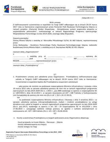 Załącznik nr 2 Wzór umowy O dofinansowanie uczestnictwa w wyjeździe na Targi CeBIT odbywające się w dniach 20-24 marca 2017 roku w Hannoverze organizowanym przez Pomorski Park Naukowo-Technologiczny Gdynia w ramach projektu „Pomorski Broker Eksportowy . Kompleksowy system wspierania eksportu w województwie pomorskim”, realizowanego w ramach Regionalnego Programu operacyjnego Województwa Pomorskiego na lata 2014-2020, zwanego dalej Wyjazdem. Zawarta pomiędzy Gminą Miasta Gdynia z siedzibą al. Marszałka Piłsudzkiego 52/54, 81-382 Gdynia, reprezentowaną przez: Annę Borkowską - Dyrektora Pomorskiego Parku Naukowo-Technologicznego Gdynia, Jednostki Budżetowej Gminy Miasta Gdyni, z siedzibą przy al. Zwycięstwa 96/98, 81-451 Gdynia zwanym dalej „Organizatorem” a ……………..……… z siedzibą przy ul. …………………………….., ….-…… ……………….., wpisaną do ……………………………..pod nr……………………………, NIP……………………………………, REGON……………………………., reprezentowanym przez: …………………….. -.……………………………… zwanym dalej „Przedsiębiorcą” §1 1. Przedmiotem umowy jest udzielenie przez Organizatora Przedsiębiorcy dofinansowania jego udziału w Targach CeBIT odbywające się w dniach 20-24 marca 2017 roku w Hannoverze. Uczestnictwo w wyjeździe będzie dla Przedsiębiorcy wsparciem udzielanym - jako pomoc de minimis na podstawie rozporządzenia Ministra infrastruktury i rozwoju z dnia 19 marca 2015 roku w sprawie udzielania pomocy de mini mis w ramach regionalnych programów operacyjnych na lata 2014-2020 (Dz.U. z 2015 r., poz.488) wydanego w oparciu o rozporządzenie KE nr 1407/2013 z dnia 18.12.2013 r. w sprawie stosowania art.107 i 108 Traktatu o funkcjonowaniu Unii Europejskiej do pomocy de mini mis (Dz.U.UE L 352 z 24.12.2013), lub - na podstawie rozporządzenia Ministra Infrastruktury i Rozwoju z dnia 3 września 2015 r. w sprawie udzielania pomocy mikroprzedsiębiorcom, małym i średnim przedsiębiorca na usługi doradcze oraz udział w targach w ramach regionalnych programów operacyjnych na lata 2014-2020 (Dz.U. poz.1417), wydanego w oparciu o art. 18 i 19 rozporządzenia KE nr 651/2014 z dnia 17.06.2014 r. uznającego niektóre rodzaje pomocy za zgodne z rynkiem wewnętrznym w zastosowaniu art. 107 i 108 traktatu (Dz.U. UE L 187 z 26.06.2014) §2 1. Koszty uczestnictwa Przedsiębiorcy w targach pokrywane przez Organizatora obejmują: - koszt przejazdu na trasie Gdynia - Hannover - Gdynia - koszty zakwaterowania na miejscu - koszty wstępu na Targi Regionalny Program Operacyjny Województwa Pomorskiego na lata 2014 - 2020 PPNT Gdynia, al. Zwycięstwa 96/98, 81-451 Gdynia +48 58 698 22 42 www.ppnt.pl - koszty opłaty współwystawienniczej, - koszty wynajmu i zabudowy powierzchni wystawienniczej 2. W wyjeździe biorą udział następujący pracownicy Przedsiębiorcy ( nie więcej niż 2 osoby): 2.1 (imię nazwisko, stanowisko, data urodzenia) 2.2 (imię nazwisko, stanowisko, data urodzenia) 3. Szacunkowy koszt udziału Przedsiębiorcy w wyjeździe wynosi 17 500zł zł, szacunkowy koszt udziału drugiego przedstawiciela szacowany jest na 3 500 zł 4. Maksymalny poziom dofinansowania a) 85% kosztu wskazanego w § 2 pkt 3, w przypadku skorzystania z pomocy de minimis b) 50% kosztu wskazanego w § 2 pkt 3, w przypadku skorzystania z pomocy publicznej na udział w targach 5. Koszty uczestnictwa nieobjęte dofinansowaniem będą stanowiły wkład własny Przedsiębiorcy. Po zakończeniu wyjazdu i rozliczeniu wszystkich faktur Organizator wystawi notę obciążeniowa z tytułu wkładu własnego z ostatecznym kosztem uczestnictwa 6. Przedsiębiorca jest zobowiązany do pokrycia szacunkowych kosztów uczestnictwa w wysokości … nie później, niż 5 dni roboczych od dnia podpisania umowy Wpłaty należy dokonać na rachunek bankowy Organizatora o numerze 02-1440-1084-0000-0000-0448-5939. Brak wpłaty jest jednoznaczny ze skreśleniem z listy uczestników wyjazdu. 7. W przypadku, gdy po rozliczeniu wszystkich faktur ostateczny koszt uczestnictwa Przedsiębiorcy w wyjeździe będzie mniejszy od kwoty o której mowa w pkt. 6, Organizator zwróci różnicę Przedsiębiorcy na konto bankowe o nr…… W przypadku gdy ostateczny koszt będzie większy od kwoty o której mowa w pkt. 6 przedsiębiorca wpłaci różnice na konto Organizatora. 8. W przypadku rezygnacji z wyjazdu wpłacony wkład własny zostanie zwrócony Przedsiębiorcy. W przypadku poniesienia przez Organizatora kosztów związanych z udziałem przedsiębiorcy w targach wpłacona kwota zostanie odpowiednio pomniejszona. 9. W przypadku udziału w Wyjeździe mniejszej niż pierwotnie zaplanowana liczba przedsiębiorstw, szacowany łączny koszt podany pkt.3 może ulec zmianie, co wpłynie także na wysokość wkładu własnego, który musi być wniesiony przez uczestnika wyjazdu. Organizator niezwłocznie poinformuje o tym fakcie zakwalifikowane do Wyjazdu Firmy. Jeśli koszt zmieni się o ponad 30% uczestnik wyjazdu będzie miał prawo do rezygnacji z udziału w wyjeździe bez ponoszenia żadnych kosztów. §3 1. Przedsiębiorca oświadcza, że zapoznał się z Regulaminem Wyjazdu i zobowiązuje się do przestrzegania jego postanowień oraz do pełnego udziału we wszystkich wydarzeniach organizowanych w ramach Wyjazdu. 2. Przedsiębiorca oświadcza, że - posiada siedzibę na terenie województwa pomorskiego, Regionalny Program Operacyjny Województwa Pomorskiego na lata 2014 - 2020 PPNT Gdynia, al. Zwycięstwa 96/98, 81-451 Gdynia +48 58 698 22 42 www.ppnt.pl - zalicza się do sektora MŚP1 - posiada PKD związane z tematyką targów - osoba/osoby zgłoszone do udziału w Targach zna/ja język angielski w stopniu umożliwiającym samodzielna prezentację oferty przedsiębiorstwa - posiada prawa autorskie do produktów prezentowanych podczas Targów - zobowiązuje się do 