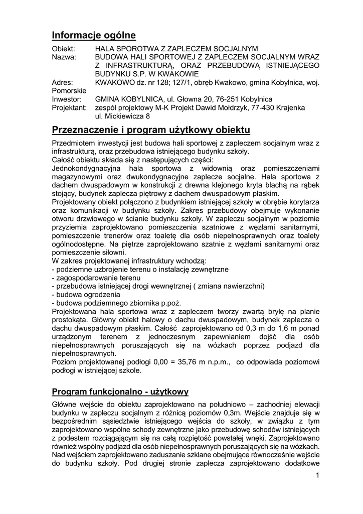 Informacje ogólne Obiekt: Nazwa: Adres: Pomorskie Inwestor: Projektant: HALA SPOROTWA Z ZAPLECZEM SOCJALNYM BUDOWA HALI SPORTOWEJ Z ZAPLECZEM SOCJALNYM WRAZ Z INFRASTRUKTURĄ, ORAZ PRZEBUDOWĄ ISTNIEJĄCEGO BUDYNKU S.P. W KWAKOWIE KWAKOWO dz. nr 128; 127/1, obręb Kwakowo, gmina Kobylnica, woj. GMINA KOBYLNICA, ul. Głowna 20, 76-251 Kobylnica zespół projektowy M-K Projekt Dawid Mołdrzyk, 77-430 Krajenka ul. Mickiewicza 8 Przeznaczenie i program użytkowy obiektu Przedmiotem inwestycji jest budowa hali sportowej z zapleczem socjalnym wraz z infrastrukturą, oraz przebudowa istniejącego budynku szkoły. Całość obiektu składa się z następujących części: Jednokondygnacyjna hala sportowa z widownią oraz pomieszczeniami magazynowymi oraz dwukondygnacyjne zaplecze socjalne. Hala sportowa z dachem dwuspadowym w konstrukcji z drewna klejonego kryta blachą na rąbek stojący, budynek zaplecza piętrowy z dachem dwuspadowym płaskim. Projektowany obiekt połączono z budynkiem istniejącej szkoły w obrębie korytarza oraz komunikacji w budynku szkoły. Zakres przebudowy obejmuje wykonanie otworu drzwiowego w ścianie budynku szkoły. W zapleczu socjalnym w poziomie przyziemia zaprojektowano pomieszczenia szatniowe z węzłami sanitarnymi, pomieszczenie trenerów oraz toaletę dla osób niepełnosprawnych oraz toalety ogólnodostępne. Na piętrze zaprojektowano szatnie z węzłami sanitarnymi oraz pomieszczenie siłowni. W zakres projektowanej infrastruktury wchodzą: - podziemne uzbrojenie terenu o instalację zewnętrzne - zagospodarowanie terenu - przebudowa istniejącej drogi wewnętrznej ( zmiana nawierzchni) - budowa ogrodzenia - budowa podziemnego zbiornika p.poż. Projektowana hala sportowa wraz z zapleczem tworzy zwartą bryłę na planie prostokąta. Główny obiekt halowy o dachu dwuspadowym, budynek zaplecza o dachu dwuspadowym płaskim. Całość zaprojektowano od 0,3 m do 1,6 m ponad urządzonym terenem z jednoczesnym zapewnianiem dojść dla osób niepełnosprawnych poruszających się na wózkach poprzez podjazd dla niepełnosprawnych. Poziom projektowanej podłogi 0,00 = 35,76 m n.p.m., co odpowiada poziomowi podłogi w istniejącej szkole. Program funkcjonalno - użytkowy Główne wejście do obiektu zaprojektowano na południowo – zachodniej elewacji budynku w zapleczu socjalnym z różnicą poziomów 0,3m. Wejście znajduje się w bezpośrednim sąsiedztwie istniejącego wejścia do szkoły, w związku z tym zaprojektowano wspólne schody zewnętrzne jako przebudowę schodów istniejących z podestem rozciągającym się na całą rozpiętość powstałej wnęki. Zaprojektowano również wspólny podjazd dla osób niepełnosprawnych poruszających się na wózkach. Nad wejściem zaprojektowano zaduszanie szklane obejmujące równocześnie wejście do budynku szkoły. Pod drugiej stronie zaplecza zaprojektowano dodatkowe 1 wejście/wyjście , które pełni rolę wyjścia ewakuacyjnego. Od strony północnej ze względu na różnicę wysokości w terenie zaprojektowano schody z wyjścia ewakuacyjnego, w tym miejscu różnica poziomów wynosi 1,06 m w stosunku do 0,00 budynku. Za wejściem głównym zaprojektowano wiatrołap z bezpośrednim dostępem do klatki schodowej, który stanowi hol główny wejściowy, zgodnie z wymogami o wysokości pomieszczenia 3,3 m. Z wiatrołapu przechodzi się do korytarzy stanowiących główną komunikację. Korytarz w zapleczu prowadzi do części halowej oraz stanowi połączenie z istniejącym budynkiem szkoły. Obiekt został zaprojektowany z podziałem na dwie części: I części stanowi budynek halowy parterowy z widownią rozkładaną w poziomie podłogi sportowej w charakterystycznej wnęce, widownia o łącznej pojemności 100 miejsc siedzących nie ogranicza pola gry. W sali sportowej o powierzchni tafli sportowej 657,8 m2 oraz wysokości pola gry 8,38 m zaprojektowano następujące boiska: o boisko główne do koszykówki o 3 boiska treningowe do koszykówki, ( kosze treningowe na ścianach bocznych ( boiska nie wymiarowe) o boisko główne do piłki ręcznej (boisko nie wymiarowe) o boisko główne do siatkówki Na ścianie w osi 1 zaprojektowano drabinki gimnastyczne oraz kotarę elektryczną rozdzielającą salę na dwie części. Z sali sportowej zaprojektowano dwa wyjścia ewakuacyjne, pierwsze bezpośrednio na urządzony teren, drugie poprzez zaplecze socjalne również na teren przyległy. Sala sportowa jest dobrze wygłuszona poprzez zastosowanie na ścianach szczytowych, ścianach podłużnych oraz sufitu podwieszanego, izolacji akustycznej z płyt akustycznych. Doświetlenie sali poprzez naświetla w ścianach podłużnych. W oknach sali sportowej zaprojektowano system rolet podtynkowych aby uniknąć nadmiernego naświetlenia sali sportowej oraz podniesieniu oszczędności energii, rolety opuszczane elektrycznie, sterownie zaprojektowano w pomieszczeniu trenerów. Bezpośrednio przy sali sportowej zaprojektowano pomieszczenia magazynowe. II część stanowi piętrowy budynek zaplecza socjalnego. W poziomie parteru zaprojektowano układy szatniowo – sanitarne, pom. trenerów, pom. gospodarcze, toaletę dla osób niepełnosprawnych oraz toalety ogólnodostępne. Z poziomu parteru zaprojektowano bezpośrednie wejście do szkoły oraz klatkę schodową prowadząca na piętro. Na piętrze zaprojektowano dodatkowe pomieszczenia szatniowo – sanitarne, pomieszczenie techniczne oraz siłownię. Nowo projektowany obiekt pokrywa w całości parametry funkcjonalno-użytkowe uzupełniające dla istniejącej szkoły. Podłogi Podłoga sportowa – sala W sali sportowej zaprojektowano posadzkę sportową kombi elastyczną z rolowaną wielowarstwową wykładziną sportową PCV na konstrukcji drewnianej, podwójnie legarowanej na podkładkach. Podłoga sportowa jako cały system /konstrukcja + wykładzina jako komplet/ musi posiadać zgodność ze wszystkimi parametrami normy EN 14904. Wszelkie aspekty techniczne takie