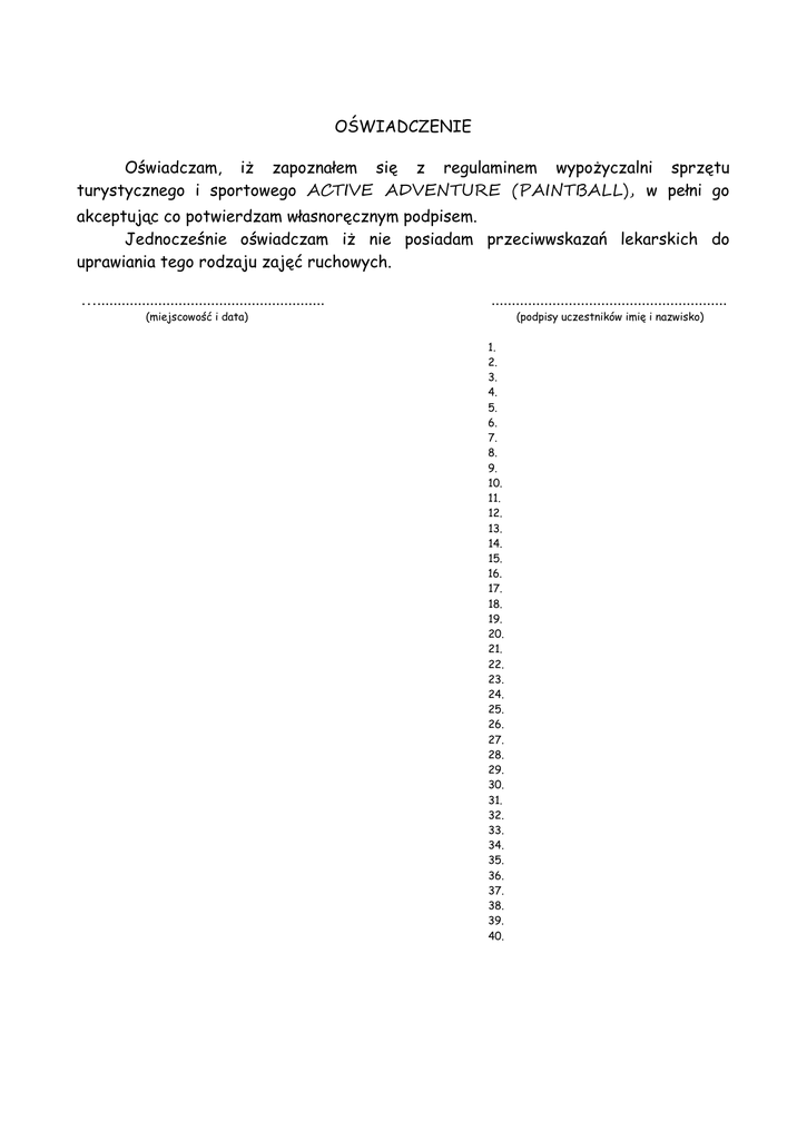 OŚWIADCZENIE Oświadczam, iż zapoznałem się z regulaminem wypożyczalni sprzętu turystycznego i sportowego ACTIVE ADVENTURE (PAINTBALL), w pełni go akceptując co potwierdzam własnoręcznym podpisem. Jednocześnie oświadczam iż nie posiadam przeciwwskazań lekarskich do uprawiania tego rodzaju zajęć ruchowych. …........................................................ .......................................................... (miejscowość i data) (podpisy uczestników imię i nazwisko) 1. 2. 3. 4. 5. 6. 7. 8. 9. 10. 11. 12. 13. 14. 15. 16. 17. 18. 19. 20. 21. 22. 23. 24. 25. 26. 27. 28. 29. 30. 31. 32. 33. 34. 35. 36. 37. 38. 39. 40.