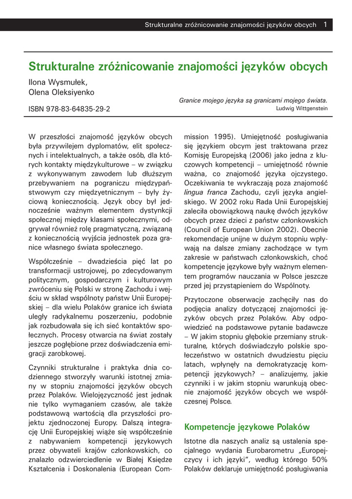 Strukturalne zróżnicowanie znajomości języków obcych 1 Strukturalne zróżnicowanie znajomości języków obcych Ilona Wysmułek, Olena Oleksiyenko ISBN 978-83-64835-29-2 W przeszłości znajomość języków obcych była przywilejem dyplomatów, elit społecznych i intelektualnych, a także osób, dla których kontakty międzykulturowe – w związku z wykonywanym zawodem lub dłuższym przebywaniem na pograniczu międzypaństwowym czy międzyetnicznym – były życiową koniecznością. Język obcy był jednocześnie ważnym elementem dystynkcji społecznej między klasami społecznymi, odgrywał również rolę pragmatyczną, związaną z koniecznością wyjścia jednostek poza granice własnego świata społecznego. Współcześnie – dwadzieścia pięć lat po transformacji ustrojowej, po zdecydowanym politycznym, gospodarczym i kulturowym zwróceniu się Polski w stronę Zachodu i wejściu w skład wspólnoty państw Unii Europejskiej – dla wielu Polaków granice ich świata uległy radykalnemu poszerzeniu, podobnie jak rozbudowała się ich sieć kontaktów społecznych. Procesy otwarcia na świat zostały jeszcze pogłębione przez doświadczenia emigracji zarobkowej. Czynniki strukturalne i praktyka dnia codziennego stworzyły warunki istotnej zmiany w stopniu znajomości języków obcych przez Polaków. Wielojęzyczność jest jednak nie tylko wymaganiem czasów, ale także podstawową wartością dla przyszłości projektu zjednoczonej Europy. Dalszą integrację Unii Europejskiej wiąże się współcześnie z nabywaniem kompetencji językowych przez obywateli krajów członkowskich, co znalazło odzwierciedlenie w Białej Księdze Kształcenia i Doskonalenia (European Com- Granice mojego języka są granicami mojego świata. Ludwig Wittgenstein mission 1995). Umiejętność posługiwania się językiem obcym jest traktowana przez Komisję Europejską (2006) jako jedna z kluczowych kompetencji – umiejętność równie ważna, co znajomość języka ojczystego. Oczekiwania te wykraczają poza znajomość lingua franca Zachodu, czyli języka angielskiego. W 2002 roku Rada Unii Europejskiej zaleciła obowiązkową naukę dwóch języków obcych przez dzieci z państw członkowskich (Council of European Union 2002). Obecnie rekomendacje unijne w dużym stopniu wpływają na dalsze zmiany zachodzące w tym zakresie w państwach członkowskich, choć kompetencje językowe były ważnym elementem programów nauczania w Polsce jeszcze przed jej przystąpieniem do Wspólnoty. Przytoczone obserwacje zachęciły nas do podjęcia analizy dotyczącej znajomości języków obcych przez Polaków. Aby odpowiedzieć na podstawowe pytanie badawcze – W jakim stopniu głębokie przemiany strukturalne, których doświadczyło polskie społeczeństwo w ostatnich dwudziestu pięciu latach, wpłynęły na demokratyzację kompetencji językowych? – analizujemy, jakie czynniki i w jakim stopniu warunkują obecnie znajomość języków obcych we współczesnej Polsce. Kompetencje językowe Polaków Istotne dla naszych analiz są ustalenia specjalnego wydania Eurobarometru „Europejczycy i ich języki”, według którego 50% Polaków deklaruje umiejętność posługiwania 2 Strukturalne zróżnicowanie znajomości języków obcych się przynajmniej jednym językiem obcym (European Commission 2012). Wyniki te potwierdza badanie Centrum Badania Opinii Społecznej z 2012 roku, w którym aż 51% dorosłych Polaków zapewniło, że jest w stanie posługiwać się jakimś językiem obcym. W sferze deklaratywnej kompetencje te są zatem wysokie, co pozwalałoby mieć nadzieję na dalsze upowszechnianie się tego coraz bardziej istotnego kapitału kulturowego w polskim społeczeństwie. Tymczasem Europejskie Badania Kompetencji Językowych (First European Survey on Language Competences, ESLC) prowadzone w środowisku polskich nastolatków, a więc grupy społecznej urodzonej i socjalizowanej w „potransformacyjnej” Polsce, wskazują, że tylko 25% z nich posługuje się językiem obcym w stopniu umożliwiającym komunikację na przeciętnym i ponadprzeciętnym poziomie B1/B2 (European Commission 2011). Uzyskane w tym badaniu wyniki skłaniają do refleksji nad możliwymi różnicami między deklaratywną a praktyczną znajomością języków obcych, zachęcają również do bliższego przyjrzenia się edukacji szkolnej jako podstawowemu i dostępnemu dla każdego ucznia źródłu nauczania języka obcego. Podstawowe założenie powszechności edukacji przewiduje bowiem równy dostęp do wszystkich zasobów, bez względu na czynniki statusowe przypisane jednostce. Przywoływane wydanie Eurobarometru wskazuje jednak, że 68% Europejczyków uczy się języka obcego wyłącznie na poziomie obowiązkowej edukacji szkolnej, co potwierdza jej wciąż niepodważalną rolę przy formowaniu wykształcenia współczesnych Europejczyków (European Commission 2012). Wpływ systemu szkolnego Polski system edukacji doświadczył po 1989 roku licznych zmian zarówno programów nauczania, jak i celów stawianych przed nauczycielami i uczniami. W zakresie nauczania języka obcego główne zmiany nastąpiły przede wszystkim po reformie gimnazjalnej z 1999 roku. Zmiany zachodziły stopniowo i zmierzały do podwyższenia poziomu nauczania języków obcych w szkołach. Podstawa programowa dla szkół podstawowych, gimnazjów i liceów z 2009 roku przewiduje obowiązkowe nauczanie przynajmniej dwóch języków obcych, umożliwia także kontynuację nauki wybranego języka, rozpoczętej na wcześniejszych etapach systemu edukacyjnego. W praktyce sprowadza się to do możliwości dalszej nauki języka angielskiego w gimnazjum i liceum oraz wyboru drugiego języka w gimnazjum – przede wszystkim rosyjskiego i niemieckiego – i kontynuacji jego uczenia się w liceum (MEN 2009). Istotną zmianą jest również wprowadzenie w 2005 roku egzaminu pisemnego z nowożytnego języka obcego do przedmiotów obowiązkowych na
