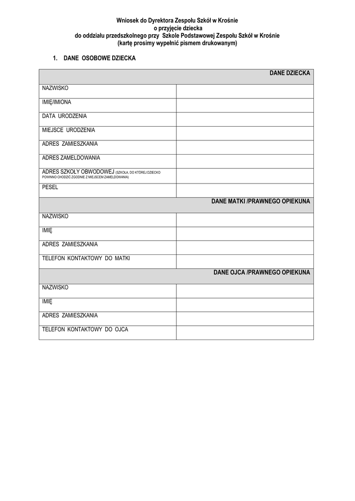 Wniosek do Dyrektora Zespołu Szkół w Krośnie o przyjęcie dziecka