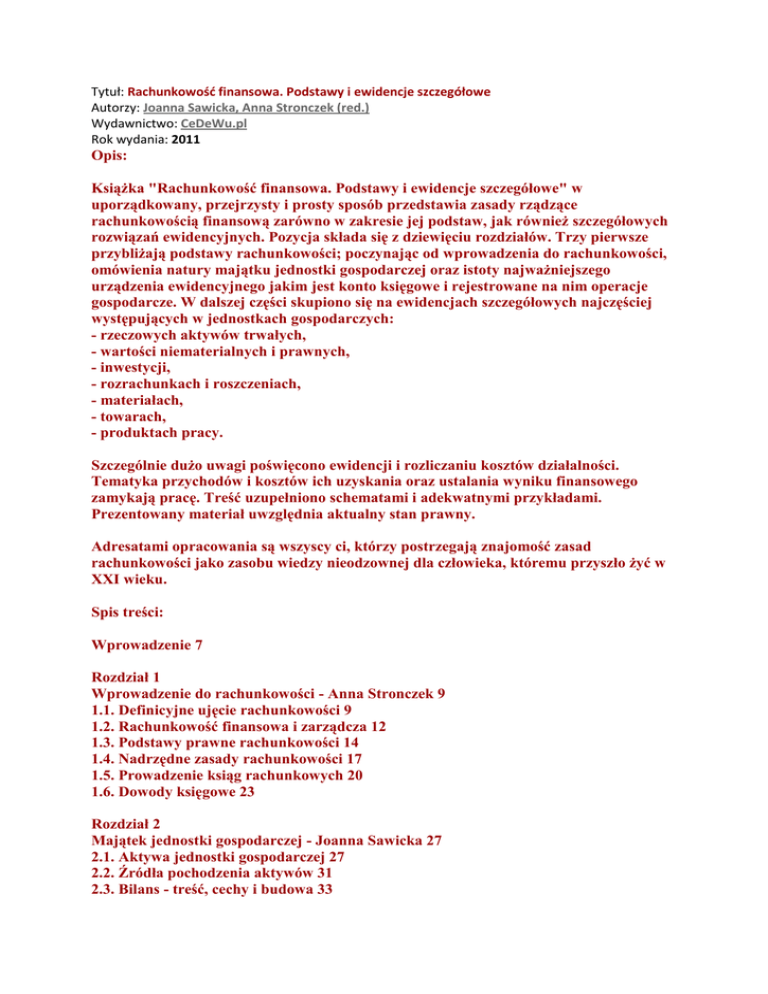 Tytuł: Rachunkowość finansowa. Podstawy i ewidencje szczegółowe Autorzy: Joanna Sawicka, Anna Stronczek (red.) Wydawnictwo: CeDeWu.pl Rok wydania: 2011 Opis: Książka "Rachunkowość finansowa. Podstawy i ewidencje szczegółowe" w uporządkowany, przejrzysty i prosty sposób przedstawia zasady rządzące rachunkowością finansową zarówno w zakresie jej podstaw, jak również szczegółowych rozwiązań ewidencyjnych. Pozycja składa się z dziewięciu rozdziałów. Trzy pierwsze przybliżają podstawy rachunkowości; poczynając od wprowadzenia do rachunkowości, omówienia natury majątku jednostki gospodarczej oraz istoty najważniejszego urządzenia ewidencyjnego jakim jest konto księgowe i rejestrowane na nim operacje gospodarcze. W dalszej części skupiono się na ewidencjach szczegółowych najczęściej występujących w jednostkach gospodarczych: - rzeczowych aktywów trwałych, - wartości niematerialnych i prawnych, - inwestycji, - rozrachunkach i roszczeniach, - materiałach, - towarach, - produktach pracy. Szczególnie dużo uwagi poświęcono ewidencji i rozliczaniu kosztów działalności. Tematyka przychodów i kosztów ich uzyskania oraz ustalania wyniku finansowego zamykają pracę. Treść uzupełniono schematami i adekwatnymi przykładami. Prezentowany materiał uwzględnia aktualny stan prawny. Adresatami opracowania są wszyscy ci, którzy postrzegają znajomość zasad rachunkowości jako zasobu wiedzy nieodzownej dla człowieka, któremu przyszło żyć w XXI wieku. Spis treści: Wprowadzenie 7 Rozdział 1 Wprowadzenie do rachunkowości - Anna Stronczek 9 1.1. Definicyjne ujęcie rachunkowości 9 1.2. Rachunkowość finansowa i zarządcza 12 1.3. Podstawy prawne rachunkowości 14 1.4. Nadrzędne zasady rachunkowości 17 1.5. Prowadzenie ksiąg rachunkowych 20 1.6. Dowody księgowe 23 Rozdział 2 Majątek jednostki gospodarczej - Joanna Sawicka 27 2.1. Aktywa jednostki gospodarczej 27 2.2. Źródła pochodzenia aktywów 31 2.3. Bilans - treść, cechy i budowa 33 2.4. Inwentaryzacja 39 2.5. Zasady wyceny pozycji bilansowych 44 Rozdział 3 Konto księgowe - Anna Stronczek 49 3.1. Operacje gospodarcze, ich charakterystyka i podział 49 3.2. Wpływ operacji gospodarczych na składniki bilansu 50 3.3. Konto księgowe 53 3.4. Funkcjonowanie kont bilansowych 56 3.5. Funkcjonowanie kont wynikowych 59 3.6. Zasada podwójnego zapisu 63 3.7. Zestawienie obrotów i sald 65 3.8. Poprawianie błędów księgowych 68 3.9. Dzielenie i łączenie kont 72 3.10. Plan kont 79 Rozdział 4 Rzeczowe aktywa trwałe oraz wartości niematerialne i prawne - Joanna Sawicka 83 4.1. Środki trwałe 83 4.2. Środki trwałe w budowie 97 4.3. Amortyzacja środków trwałych 101 4.4. Wartości niematerialne i prawne 106 Rozdział 5 Inwestycje i ich ewidencja - Joanna Sawicka 119 5.1. Inwestycje i ich klasyfikacja 119 5.2. Środki pieniężne 123 5.2.1. Środki pieniężne w kasie 123 5.2.2. Rachunki bankowe 126 5.2.3. Środki pieniężne w drodze 129 5.2.4. Inne środki pieniężne 130 Rozdział 6 Rozrachunki i roszczenia - Anna Stronczek 135 6.1. Charakterystyka rozrachunków 135 6.2. Rozrachunki z dostawcami i odbiorcami 141 6.3. Ewidencja rozrachunków publicznoprawnych 146 6.3.1. Rozrachunki z tytułu podatku od towarów i usług (VAT) 147 6.3.2. Rozrachunki z ZUS 151 6.3.3. Inne rozrachunki publicznoprawne 153 6.4. Ewidencja rozrachunków z pracownikami 154 6.5. Ewidencja pozostałych rozrachunków 161 Rozdział 7 Materiały, towary i produkty pracy - Anna Surowiec, Elżbieta Marcinkowska 169 7.1. Pojęcie i klasyfikacja zapasów 169 7.1.1. Zasady wyceny materiałów i towarów 171 7.1.2. Zasady wyceny produktów pracy 179 7.2. Ewidencja obrotu materiałami 181 7.3. Ewidencja obrotu towarami 188 7.4. Ewidencja produktów pracy 192 Rozdział 8 Ewidencja i rozliczanie kosztów działalności - Elżbieta Marcinkowska, Anna Surowiec 197 8.1 Definicja kosztów 197 8.2. Klasyfikacja kosztów 198 8.3. Podstawowe układy ewidencyjne 202 8.4. Warianty ewidencji kosztów działalności zasadniczej 203 8.5. Uproszczona ewidencja kosztów 204 8.6. Ewidencja kosztów według rodzajów 206 8.6.1. Charakterystyka kont układu rodzajowego 207 8.6.2. Rozliczenie kosztów rodzajowych 213 8.6.3. Księgowanie kosztów w układzie rodzajowym 214 8.7. Ewidencja kosztów w układzie funkcjonalnym 215 8.7.1. Charakterystyka kont układu funkcjonalnego 216 8.7.2. Rozliczenie kosztów działalności 227 8.7.3. Księgowanie kosztów w układzie funkcjonalnym 228 8.8. Ewidencja kosztów w układzie rodzajowym i funkcjonalnym 229 8.9. Rozliczenia międzyokresowe kosztów - Joanna Sawicka 233 8.10. Kalkulacja kosztów działalności - Anna Stronczek 239 Rozdział 9 Przychody i koszty ich uzyskania. Wynik finansowy - Anna Stronczek 243 9.1. Elementy tworzące wynik finansowy 243 9.2. Przychody działalności operacyjnej i koszty ich uzyskania 247 9.3. Pozostałe przychody i koszty operacyjne 249 9.4. Przychody i koszty finansowe 252 9.5. Zyski i straty nadzwyczajne 253 9.6. Obowiązkowe obciążenia wyniku finansowego i jego rozliczenie 254 9.7. Metody ustalania wyniku finansowego 255 9.8. Rozliczenie wyniku finansowego 264 Bibliografia 267