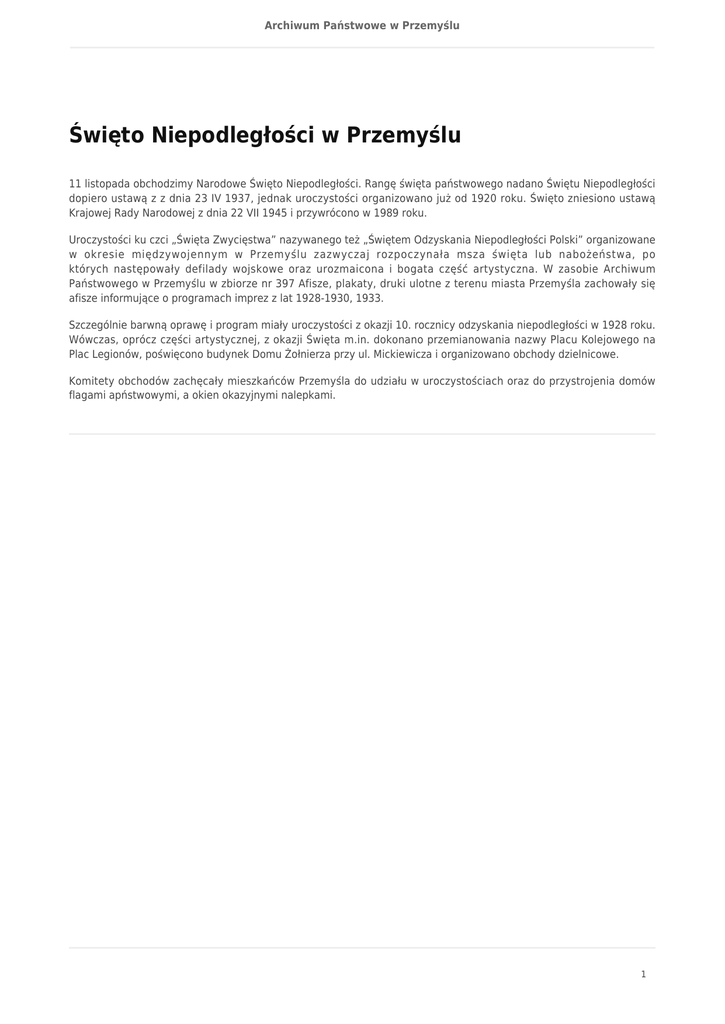 Archiwum Państwowe w Przemyślu Święto Niepodległości w Przemyślu 11 listopada obchodzimy Narodowe Święto Niepodległości. Rangę święta państwowego nadano Świętu Niepodległości dopiero ustawą z z dnia 23 IV 1937, jednak uroczystości organizowano już od 1920 roku. Święto zniesiono ustawą Krajowej Rady Narodowej z dnia 22 VII 1945 i przywrócono w 1989 roku. Uroczystości ku czci „Święta Zwycięstwa” nazywanego też „Świętem Odzyskania Niepodległości Polski” organizowane w okresie międzywojennym w Przemyślu zazwyczaj rozpoczynała msza święta lub nabożeństwa, po których następowały defilady wojskowe oraz urozmaicona i bogata część artystyczna. W zasobie Archiwum Państwowego w Przemyślu w zbiorze nr 397 Afisze, plakaty, druki ulotne z terenu miasta Przemyśla zachowały się afisze informujące o programach imprez z lat 1928-1930, 1933. Szczególnie barwną oprawę i program miały uroczystości z okazji 10. rocznicy odzyskania niepodległości w 1928 roku. Wówczas, oprócz części artystycznej, z okazji Święta m.in. dokonano przemianowania nazwy Placu Kolejowego na Plac Legionów, poświęcono budynek Domu Żołnierza przy ul. Mickiewicza i organizowano obchody dzielnicowe. Komitety obchodów zachęcały mieszkańców Przemyśla do udziału w uroczystościach oraz do przystrojenia domów flagami apństwowymi, a okien okazyjnymi nalepkami. 1