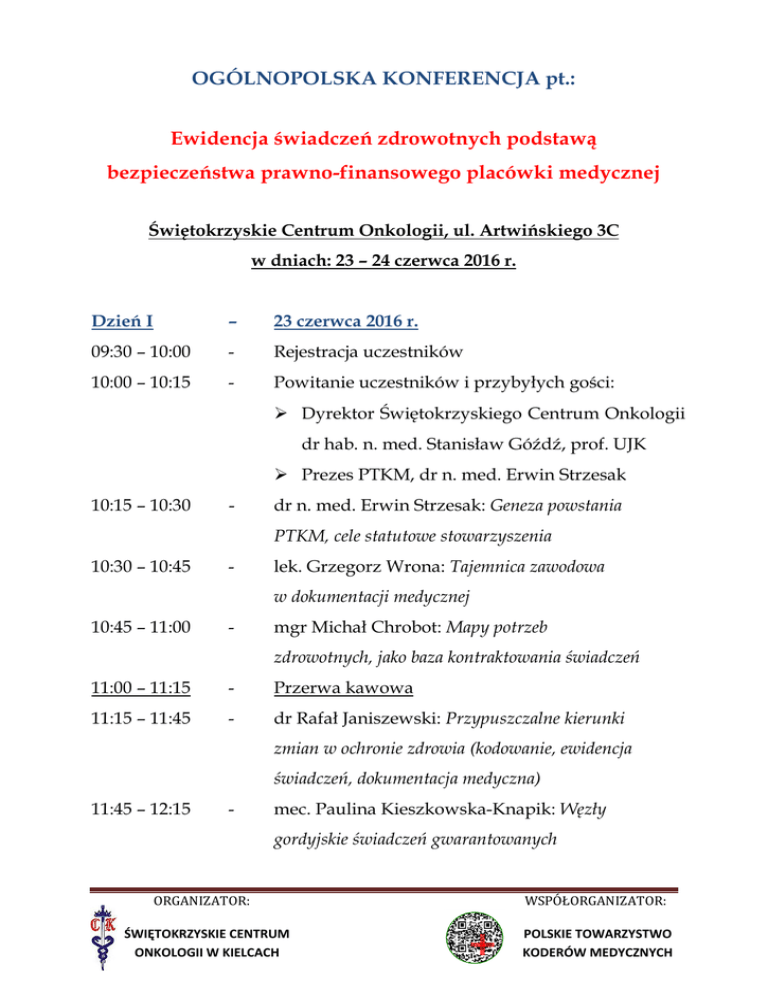 OGÓLNOPOLSKA KONFERENCJA pt.: Ewidencja świadczeń zdrowotnych podstawą bezpieczeństwa prawno-finansowego placówki medycznej Świętokrzyskie Centrum Onkologii, ul. Artwińskiego 3C w dniach: 23 – 24 czerwca 2016 r. Dzień I – 23 czerwca 2016 r. 09:30 – 10:00 - Rejestracja uczestników 10:00 – 10:15 - Powitanie uczestników i przybyłych gości: Dyrektor Świętokrzyskiego Centrum Onkologii dr hab. n. med. Stanisław Góźdź, prof. UJK Prezes PTKM, dr n. med. Erwin Strzesak 10:15 – 10:30 - dr n. med. Erwin Strzesak: Geneza powstania PTKM, cele statutowe stowarzyszenia 10:30 – 10:45 - lek. Grzegorz Wrona: Tajemnica zawodowa w dokumentacji medycznej 10:45 – 11:00 - mgr Michał Chrobot: Mapy potrzeb zdrowotnych, jako baza kontraktowania świadczeń 11:00 – 11:15 - Przerwa kawowa 11:15 – 11:45 - dr Rafał Janiszewski: Przypuszczalne kierunki zmian w ochronie zdrowia (kodowanie, ewidencja świadczeń, dokumentacja medyczna) 11:45 – 12:15 - mec. Paulina Kieszkowska-Knapik: Węzły gordyjskie świadczeń gwarantowanych ORGANIZATOR: ŚWIĘTOKRZYSKIE CENTRUM ONKOLOGII W KIELCACH WSPÓŁORGANIZATOR: POLSKIE TOWARZYSTWO KODERÓW MEDYCZNYCH 12:15 – 12:30 - mgr Michał Chrobot: Aktualne problemy w ewidencji i rozliczaniu świadczeń lekowych 12:30 – 13:00 - dr n. med. Piotr Kędzierawski: Breast Cancer Unit w ŚCO – ocena dotychczasowego funkcjonowania BCU, zasady akredytacji zewnętrznej 13:00 – 14:00 - Lunch 14:00 – 14:15 - dr n. med. Beata Jagielska: Dokumentacja medyczna w praktyce badań klinicznych 14:15 – 14:30 - dr n. pr. Kamila Kocańda: Wady i zalety płatnika jako partnera świadczeniodawców 14:30 – 15:00 - dr hab. n. med. Marek Postuła: Antybiotykoterapia i terapia przeciwgrzybicza w szpitalu a koszty leczenia 15:00 – 15:15 - Przerwa kawowa 15:15 – 15:30 - dr n. ekon. Marcin Motnyk: Rola Centrów Onkologii w diagnostyce i leczeniu pacjentów onkologicznych 15:30 – 16:00 - mgr Renata Wachowicz: Problemy z ewidencją świadczeń oraz ciągłością rozliczeń - efekt decyzji o konsolidacji szpitali 16:00 – 17:00 - Dyskusja 19:00 – 22:00 - Uroczysta kolacja ORGANIZATOR: ŚWIĘTOKRZYSKIE CENTRUM ONKOLOGII W KIELCACH WSPÓŁORGANIZATOR: POLSKIE TOWARZYSTWO KODERÓW MEDYCZNYCH Dzień II – 24 czerwca 2016 r. 10:00 – 12:00 - Walne Zebranie Członków Polskiego Towarzystwa Koderów Medycznych: przyjęcie nowych członków PTKM wybory Zarządu i Komisji Kontrolnej PTKM uchwalenie zmian w Statucie PTKM kierunki rozwoju PTKM dyskusja 12:00 – 12:15 - Przerwa kawowa 12:15 – 14:30 - Sesja sponsorowana przez Gilead Polska sp. z o.o. 12:15 – 12:30 - dr n. med. Dorota Zarębska – Michaluk: Przełom w leczeniu WZW C - od diagnozy do eradykacji wirusa w świetle obowiązującego Programu Lekowego 12:30 – 14:00 - mec. Zbigniew Pawlak: Nowelizacja Prawa Zamówień Publicznych 2016 – wpływ na proces udzielania zamówień na dostawy produktów leczniczych 14:00 – 14:30 - mgr Michał Chrobot: Rozliczanie świadczeń udzielanych w ramach programów lekowych a mechanizmy Instrumentów Dzielenia Ryzyka 14:30 – 14:35 - Zamknięcie konferencji, podziękowania 14:35 – 15:00 - Lunch ORGANIZATOR: ŚWIĘTOKRZYSKIE CENTRUM ONKOLOGII W KIELCACH WSPÓŁORGANIZATOR: POLSKIE TOWARZYSTWO KODERÓW MEDYCZNYCH SPONSORZY KONFERENCJI SPONSORZY GŁÓWNI: POZOSTALI SPONSORZY: ORGANIZATOR: ŚWIĘTOKRZYSKIE CENTRUM ONKOLOGII W KIELCACH WSPÓŁORGANIZATOR: POLSKIE TOWARZYSTWO KODERÓW MEDYCZNYCH