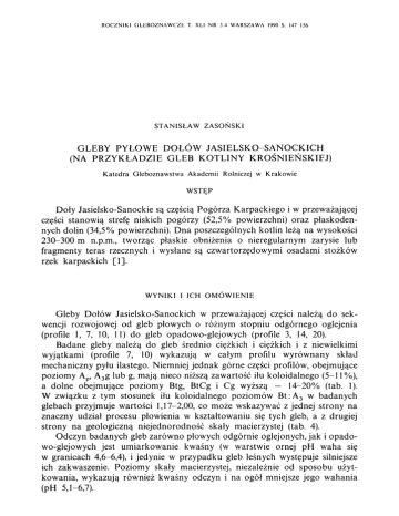 R O C ZN IK I GLHBOZNAWCZL-: T. XLI NR 3 4 WARSZAWA 1990 S. 147 156 S T A N IS Ł A W Z A S O Ń S K I G LE B Y P Y ŁO W E D O Ł Ó W JA S IE L S K O -S A N O C K IC H (NA P R Z Y K Ł A D Z IE G LE B K O T L IN Y K R O Ś N IE Ń S K IE J) Katedra Gleboznawstwa Akademii Rolniczej w Krakowie W STĘP D oły Jasielsko-Sanockie są częścią Pogórza Karpackiego i w przeważającej części stanowią strefę niskich pogórzy (52,5% powierzchni) oraz płaskoden nych dolin (34,5% powierzchni). Dna poszczególnych ko tlin leżą na wysokości 230-300 m n.p.m., tworząc płaskie obniżenia o nieregularnym zarysie lub fragmenty teras rzecznych i wysłane są czwartorzędowymi osadami stożków rzek karpackich [1]. W Y N IK I I IC H O M Ó W IE N IE Gleby Dołów Jasielsko-Sanockich w przeważającej części należą do sek wencji rozwojowej od gleb płowych o różnym stopniu odgórnego oglejenia (profile 1, 7, 10, 11) do gleb opadowo-glejowych (profile 3, 14, 20). Badane gleby należą do gleb średnio ciężkich i ciężkich i z niewielkimi wyjątkami (profile 7, 10) wykazują w całym profilu wyrównany skład mechaniczny pyłu ilastego. Niemniej jednak górne części profilów, obejmujące poziomy A p, A 3g lub g, mają nieco niższą zawartość iłu koloidalnego (5-11%), a dolne obejmujące poziomy Btg, BtCg i Cg wyższą — 14-20% (tab. 1). W związku z tym stosunek iłu koloidalnego poziomów B t :A 3 w badanych glebach przyjmuje wartości 1,17-2,00, co może wskazywać z jednej strony na znaczny udział procesu płowienia w kształtowaniu się tych gleb, a z drugiej strony na geologiczną niejednorodność skały macierzystej (tab. 4). Odczyn badanych gleb zarówno płowych odgórnie oglejonych, jak i opado wo-glejowych jest umiarkowanie kwaśny (w warstwie ornej pH waha się w granicach 4,6-6,4), i jedynie w przypadku gleb leśnych występuje silniejsze ich zakwaszenie. Poziomy skały macierzystej, niezależnie od sposobu użyt kowania, wykazują również kwaśny odczyn i na ogół mniejsze jego wahania (pH 5,1-6,7). T a b e la Zawartość niektórych form żelaza i stopień ich uruchomienia Content of various forms of iron and the degree of its mobilization Fe Profil Profile Głębokość Depth cm Poziom całkowite wolne ruchome total free mobile Horizon % stosunek — ratio wolne ruchome całkowite wolne free mobile total free Ił koloidal. Colloidal clay % A. Gleby płowe odgórnie oglejone — Pseudogleyed soils lessivés 1 Jedlicze 0-15 A, 1,57 0,72 0,078 45,9 15-36 A3 1,59 0,53 0,040 36-55 А з6 Btg 2,09 0,72 0,034 33,3 34,4 2,41 1,04 43,1 Btg 2,52 0,91 0,024 0,034 55-96 96-138 M oderów ka 12 7,5 11 4,7 13 2,3 3,7 16 16 5,1 3,7 18 17 138-156 BtCg 2,55 0,82 0,042 32,1 156-185 Cg 2,85 0,97 0,036 34,0 Ap 1,96 2,47 0,91 0,97 0,081 46,4 8,9 0,029 39,3 3,0 1,42 1,42 0,029 53,6 2 ,0 16 0,038 52,7 2,7 17 0-28 28-52 7 36,1 1 0 ,8 A 3g 52-77 Btg 2,65 77-98 Btg 2,69 98-135 Btg 2,79 BtCg 2,79 1,24 1,27 Cg 3,11 135-160 160-195 0 -2 4 10 24-36 36-51 Bajdy 51-84 A p 2 ,0 1 A3 1,61 A 3g Btg 1,51 2,09 9 11 0,045 44,4 3,6 15 45,5 40,5 3,1 3,2 19 1,26 0,040 0,041 2 0 0,62 0,65 0,036 0,041 30,8 5,8 13 40,4 6,3 12 0,46 0,034 30,5 7,4 14 1,24 0,027 59,3 2 ,2 17 1 Tabcla 1 c. d. (continued) 84-121 121-153 11 Wojaszówka 0 -2 2 22-41 41-63 63-107 107-151 Btg 2,79 BtCg 2,85 1,16 1,23 A P 1,63 1,85 2,19 0,037 41,6 3,2 17 0,041 43,2 3.3 14 0,65 0,61 0,041 39,9 6,3 10 0,042 6,9 13 0,97 0,031 33,0 44,3 14 19 A 3g Btg Btg 2,41 0 ,8 6 0,038 35,7 3,2 4,4 BtCg 2,35 0,78 0,029 33,2 3,7 B. Gleby opadowo-glejowc 0-3 0 30-45 3 Turaszówka 14 Ustrobna 20 Jaszczew A p 19 Pseudogley soils 1,25 0,45 0,084 36,0 18,7 1,89 0,74 39,2 18 16 17 8 2 ,6 8 0 ,6 8 0,055 0,049 25,4 7,4 7,2 Btg 2,58 2,43 0,72 0,82 0,060 0,052 27,9 33,7 8,3 6,3 136-158 BtCg 2,30 0,91 4,9 18 Cg 2,07 0,82 0,045 0,051 39,6 158-175 39,6 6 ,2 16 1,64 0,097 29,9 54,2 45-68 g Btg 68-92 Btg 92-136 0-19 19-47 1 ,6 8 0,49 0,91 0,047 47-98 g Btg 2,76 0,61 0,069 98-126 Btg 2,30 0,58 126-153 Cg 2 ,2 0 0,49 0,059 0,045 22,3 9,2 0 -2 1 AP 1,69 1,89 2,54 0,075 0,047 29,0 51,3 0,85 0,97 0,053 33,5 83-121 g Btg Btg 0,49 0,97 15,3 21-40 40-83 CG 0,065 0,071 44,5 121-160 A P 2,18 2,08 0,63 19,8 10 11 5,2 14 2 2 ,1 11,3 25,2 1 0 ,2 18 17 30,3 4,8 18 6 7 6 ,2 14 6,7 12 1 1 ,2 9 150 S. Zasoński ZAWARTOŚĆ RÓŻNYCH FORM ŻHLAZA Żelazo wolne — w glebach płowych odgórnie oglejonych daje się zauważyć słabo zaznaczona akumulacja tego składnika w poziomach iluwialnych, w których obserwuje się też podwyższoną zawartość iłu koloidalnego (tab. 1). W procesie płowienia bowiem żelazo wolne i frakcja koloidalna przemieszczają się razem i są akumulowane w poziomie iluwialnym. Stąd też oba te składniki wykazują w profilu wysoki stopień korelacji, co objawia się również zbliżoną wartością ich wskaźników przemieszczania. W badanych glebach wskaźniki te wynoszą dla żelaza wolnego 1,75, a dla iłu koloidalnego 1,32 (tab. 4). W glebach opadowo-glejowych natomiast obserwuje się podwyższoną zawartość żelaza wolnego w poziomach g. Skutkiem tego wskaźnik zróż nicowania iłu koloidalnego w profilu różni się znacznie od wskaźnika zróżnicowania żelaza wolnego (co do wartości i charakteru) i w tej grupie gleb przyjmuje odpowiednio wartości 1,70 i 0,82 (tab. 4). W ynika stąd, że w przypa dku gleb opadowo-glejowych w poziomach g zaznacza się akumulacja żelaza wolnego (ma ono tu „sołonczakowaty” charakter), które występuje niezależnie od frakcji koloidalnej, czego dowodem jest fakt, że poziomy o podwyższonej zawartości żelaza wolnego nie pokrywają się z poziomami o podwyższonej zawartości iłu koloidalnego. Żelazo ruchome — w glebach płowych odgórnie oglejonych występuje w dość znacznych ilościach — średnio 0,039%, przy czym nie wykazuje wyraźniejszych prawidłowości w profilowym rozmieszczeniu (tab. 1, 4). W glebach opadowo-glejowych żelazo ruchome występuje na ogół w więk szych ilościach ni