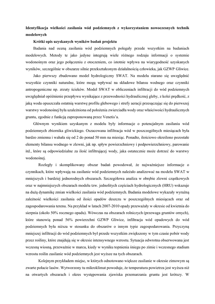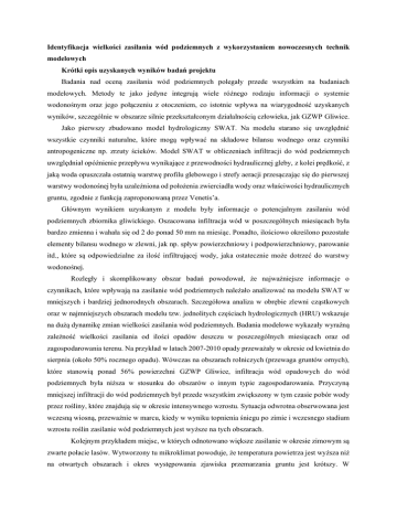Identyfikacja wielkości zasilania wód podziemnych z wykorzystaniem nowoczesnych technik modelowych Krótki opis uzyskanych wyników badań projektu Badania nad oceną zasilania wód podziemnych polegały przede wszystkim na badaniach modelowych. Metody te jako jedyne integrują wiele różnego rodzaju informacji o systemie wodonośnym oraz jego połączeniu z otoczeniem, co istotnie wpływa na wiarygodność uzyskanych wyników, szczególnie w obszarze silnie przekształconym działalnością człowieka, jak GZWP Gliwice. Jako pierwszy zbudowano model hydrologiczny SWAT. Na modelu starano się uwzględnić wszystkie czynniki naturalne, które mogą wpływać na składowe bilansu wodnego oraz czynniki antropogeniczne np. zrzuty ścieków. Model SWAT w obliczeniach infiltracji do wód podziemnych uwzględniał opóźnienie przepływu wynikające z przewodności hydraulicznej gleby, z kolei prędkość, z jaką woda opuszczała ostatnią warstwę profilu glebowego i strefy aeracji przesączając się do pierwszej warstwy wodonośnej była uzależniona od położenia zwierciadła wody oraz właściwości hydraulicznych gruntu, zgodnie z funkcją zaproponowaną przez Venetis’a. Głównym wynikiem uzyskanym z modelu były informacje o potencjalnym zasilaniu wód podziemnych zbiornika gliwickiego. Oszacowana infiltracja wód w poszczególnych miesiącach była bardzo zmienna i wahała się od 2 do ponad 50 mm na miesiąc. Ponadto, ilościowo określono pozostałe elementy bilansu wodnego w zlewni, jak np. spływ powierzchniowy i podpowierzchniowy, parowanie itd., które są odpowiedzialne za ilość infiltrującej wody, jaka ostatecznie może dotrzeć do warstwy wodonośnej. Rozległy i skomplikowany obszar badań powodował, że najważniejsze informacje o czynnikach, które wpływają na zasilanie wód podziemnych należało analizować na modelu SWAT w mniejszych i bardziej jednorodnych obszarach. Szczegółowa analiza w obrębie zlewni cząstkowych oraz w najmniejszych obszarach modelu tzw. jednolitych częściach hydrologicznych (HRU) wskazuje na dużą dynamikę zmian wielkości zasilania wód podziemnych. Badania modelowe wykazały wyraźną zależność wielkości zasilania od ilości opadów deszczu w poszczególnych miesiącach oraz od zagospodarowania terenu. Na przykład w latach 2007-2010 opady przeważały w okresie od kwietnia do sierpnia (około 50% rocznego opadu). Wówczas na obszarach rolniczych (przewaga gruntów ornych), które stanowią ponad 56% powierzchni GZWP Gliwice, infiltracja wód opadowych do wód podziemnych była niższa w stosunku do obszarów o innym typie zagospodarowania. Przyczyną mniejszej infiltracji do wód podziemnych był przede wszystkim zwiększony w tym czasie pobór wody przez rośliny, które znajdują się w okresie intensywnego wzrostu. Sytuacja odwrotna obserwowana jest wczesną wiosną, przeważnie w marcu, kiedy w wyniku topnienia śniegu po zimie i wczesnego stadium wzrostu roślin zasilanie wód podziemnych jest wyższe na tych obszarach. Kolejnym przykładem miejsc, w których odnotowano większe zasilanie w okresie zimowym są zwarte połacie lasów. Wytworzony tu mikroklimat powoduje, że temperatura powietrza jest wyższa niż na otwartych obszarach i okres występowania zjawiska przemarzania gruntu jest krótszy. W konsekwencji, w miesiącach zimowych infiltracja do wód podziemnych zachodzi częściej niż na otwartych terenach rolniczych, gdzie przemarzanie gruntu trwa dłużej, uniemożliwiając przesączanie się wody. Model SWAT pozwala także na szczegółową analizę wpływu wielu pojedynczych czynników decydujących o zasilaniu wód podziemnych w obrębie pojedynczej zlewni cząstkowej. Na przykład analiza dwóch jednolitych części hydrologicznych w obrębie tej samej zlewni cząstkowej, różniących się między sobą tylko rzeźbą terenu wskazuje, że infiltracja wód opadowych w HRU o nachyleniu terenu powyżej 15% może być nawet o 30% mniejsza w stosunku do HRU charakteryzującej się spadkami terenu w granicach 7-15% Wyniki uzyskane z poprawnie skonstruowanego modelu SWAT zostały wykorzystane w celu opracowania prawidłowego modelu konceptualnego dla modelu hydrogeologicznego wykonanego w programie FEFLOW oraz posłużyły jako dane do kalibracji tego modelu. Model FEFLOW uzupełnia słabe strony modelu SWAT, dzięki możliwości znacznie dokładniejszego odwzorowania procesów zachodzących w warstwach wodonośnych. Jednocześnie SWAT dostarcza informacji o potencjalnym zasilaniu wód podziemnych i o stratach wód opadowych związanych z innymi procesami zachodzącymi przed infiltracją do wód podziemnych, takimi jak parowanie, spływ powierzchniowy i podpowierzchniowy, pobór wody przez rośliny czy retencja glebowa. Integracja tych dwóch modeli sprzyja więc wytworzeniu efektu synergii, który, dzięki odmiennemu podejściu do wyznaczenia szukanej wartości zasilania wód podziemnych, wpływa znacząco na ograniczenie niepewności uzyskanych wyników. GZWP Gliwice to zbiornik węglanowy wyznaczony w skałach wapienia muszlowego i retu. Jest zbiornikiem hydrogeologicznie półzakrytym, silnie zuskokowanym, znajdującym się pod silnym wpływem antropopresji. Działalność człowieka uwidacznia się przede wszystkim w intensywnym poborze wód w celu zaopatrzenia ludności i przemysłu w wodę oraz w drenażu wód podziemnych sztolniami na obszarze dawnego wydobywania rud cynku i ołowiu. Wybór modelu FEFLOW jest najbardziej korzystny więc optymalny ze względu na możliwość lepszego odwzorowania tak skomplikowanego obszaru elastyczną siatką opartą na elementach skończonych. Podczas budowy modelu wykorzystano także elementy dyskretne do odwzorowania sztolni, wykorzystując prawo HagenPoiseuille. Przestrzenny rozkład zasilania wód podziemnych w obrębie zbiornika gliwickiego zmienia się w szerokim zakresie od kilku do ponad 300 mm/rok. Najmniejsze wartości zasilania obserwowane są w zachodnie