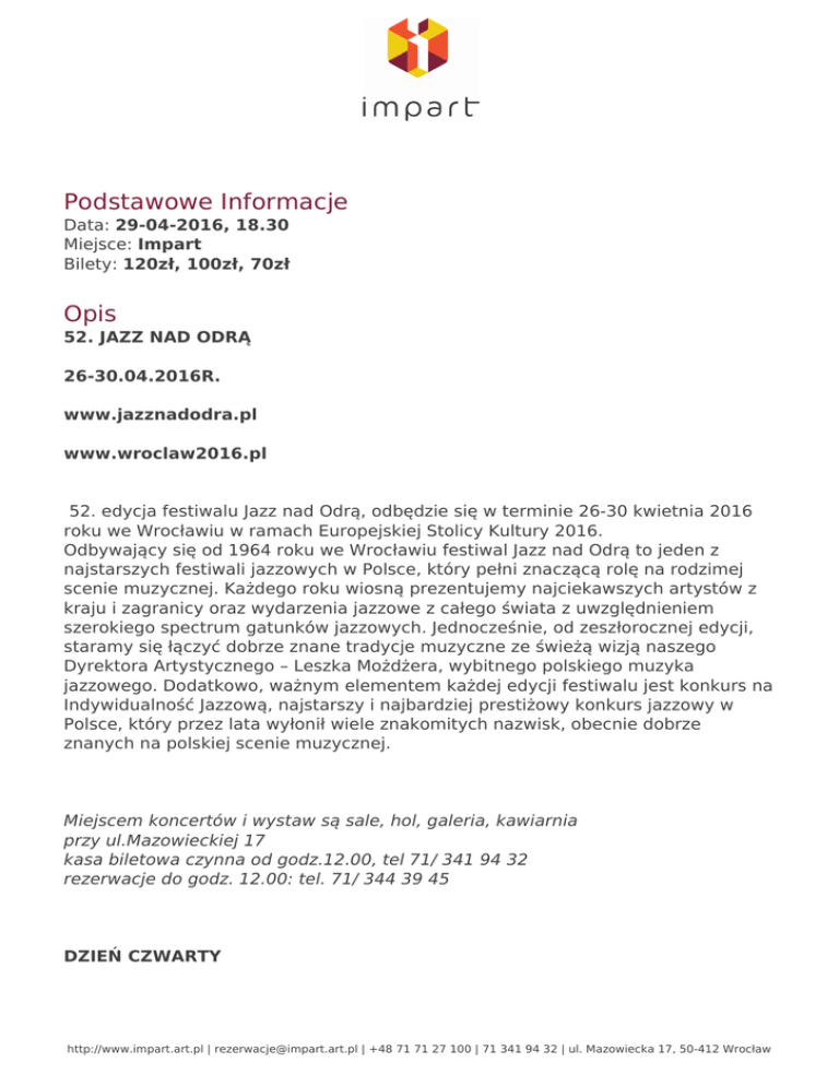 Podstawowe Informacje Data: 29-04-2016, 18.30 Miejsce: Impart Bilety: 120zł, 100zł, 70zł Opis 52. JAZZ NAD ODRĄ 26-30.04.2016R. www.jazznadodra.pl www.wroclaw2016.pl 52. edycja festiwalu Jazz nad Odrą, odbędzie się w terminie 26-30 kwietnia 2016 roku we Wrocławiu w ramach Europejskiej Stolicy Kultury 2016. Odbywający się od 1964 roku we Wrocławiu festiwal Jazz nad Odrą to jeden z najstarszych festiwali jazzowych w Polsce, który pełni znaczącą rolę na rodzimej scenie muzycznej. Każdego roku wiosną prezentujemy najciekawszych artystów z kraju i zagranicy oraz wydarzenia jazzowe z całego świata z uwzględnieniem szerokiego spectrum gatunków jazzowych. Jednocześnie, od zeszłorocznej edycji, staramy się łączyć dobrze znane tradycje muzyczne ze świeżą wizją naszego Dyrektora Artystycznego – Leszka Możdżera, wybitnego polskiego muzyka jazzowego. Dodatkowo, ważnym elementem każdej edycji festiwalu jest konkurs na Indywidualność Jazzową, najstarszy i najbardziej prestiżowy konkurs jazzowy w Polsce, który przez lata wyłonił wiele znakomitych nazwisk, obecnie dobrze znanych na polskiej scenie muzycznej. Miejscem koncertów i wystaw są sale, hol, galeria, kawiarnia przy ul.Mazowieckiej 17 kasa biletowa czynna od godz.12.00, tel 71/ 341 94 32 rezerwacje do godz. 12.00: tel. 71/ 344 39 45 DZIEŃ CZWARTY http://www.impart.art.pl | [email protected] | +48 71 71 27 100 | 71 341 94 32 | ul. Mazowiecka 17, 50-412 Wrocław 29.04.2016R. (piątek) godz. 15.00 I sala kameralna IMPART wstęp wolny KONKURS NA INDYWIDUALNOŚĆ JAZZOWĄ’2016 sala teatralna IMPART godz. 18.30 A TRIBUTE TO JAN JOHANSSON - JAN LUNDGREN with MATTIAS SVENSSON & STRING QUARTET Jan Lundgren - piano Mattias Svensson - double bass, & STRING QUARTET IREK WOJTCZAK “FOLK FIVE” QUINTET Irek Wojtczak - saksofony, klarnet basowy Tomasz Dąbrowski - trąbka Piotr Mania - fortepian Adam Żuchowski - kontrabas Kuba Staruszkiewicz - perkusja THE COOKERS Billy Harper - sax Eddie Henderson - trumpet Jaleel Shaw - alto & soprano sax David Weiss - trumpet George Cables - piano Cecil McBee - bass Billy Hart - drums godz. 23.30 sala kameralna IMPART - wstęp wolny CONFUSION PROJECT Michał Ciesielski – piano Piotr Gierszewski – bass guitar Adam Golicki – drums JAM SESSION http://www.impart.art.pl | [email protected] | +48 71 71 27 100 | 71 341 94 32 | ul. Mazowiecka 17, 50-412 Wrocław * WYDARZENIA TOWARZYSZĄCE (GALERIA IMPART) WYSTAWA OKŁADEK MAGAZYNU JazzPRESS WYSTAWA PLAKATÓW KONKURSOWYCH * Organizator zastrzega sobie prawo do zmiany programu ** Ceny biletów: IMPART (26-29 kwietnia) Koncerty w sali teatralnej – 120 zł (pierwsze 16 rzędów), 100 zł (pod balkonem), 70 zł (balkon) Koncerty w sali kameralnej – wstęp wolny HALA STULECIA (30 kwietnia) patrz tutaj 50 zł ( miejsca nienumerowane) Sprzedaż: www.jazznadodra.pl, www.impart.art.pl, www.eventim.pl oraz w punktach sprzedaży Media Markt, Empik, Saturn. * 30 kwietnia 2016r. ŚWIATOWY DZIEŃ JAZZU - patrz na następnej stronie Serdecznie zapraszamy do zakupu z limitowanej serii biletów VIP. Oferta obejmuje: - wstęp do specjalnej strefy VIP umiejscowionej w najlepszej części widowni na balkonie widokowym; - koszulkę festiwalową z limitowanej edycji - opaskę VIP umożliwiającą swobodne poruszanie się podczas trwania całego koncertu - 2 unikalne plakaty festiwalowe: Jazz nad Odrą 2016 oraz Światowy Dzień Jazzu UNESCO Wrocław Europejska Stolica Kultury 2016 - 3 kupony na piwo z możliwością wymiany na napoje bezalkoholowe - smycz pamiątkowa http://www.impart.art.pl | [email protected] | +48 71 71 27 100 | 71 341 94 32 | ul. Mazowiecka 17, 50-412 Wrocław Posiadacze biletów VIP mają zagwarantowane osobne, dedykowane wejście na teren hali. -cena pakietu 150 zł/os. Hala Stulecia W Hali Stulecia zostanie wyznaczona specjalna strefa dla osób niepełnosprawnych. Przed zakupem biletu prosimy o kontakt pod adresem [email protected] http://www.impart.art.pl | [email protected] | +48 71 71 27 100 | 71 341 94 32 | ul. Mazowiecka 17, 50-412 Wrocław Powered by TCPDF (www.tcpdf.org)