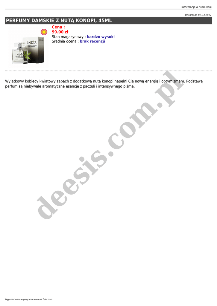 Informacje o produkcie Utworzono 02-03-2017 PERFUMY DAMSKIE Z NUTĄ KONOPI, 45ML Cena : 99.00 zł Stan magazynowy : bardzo wysoki Średnia ocena : brak recenzji de es is .c o m .p l Wyjątkowy kobiecy kwiatowy zapach z dodatkową nutą konopi napełni Cię nową energią i optymizmem. Podstawą perfum są niebywale aromatyczne esencje z paczuli i intensywnego piżma. Wygenerowano w programie www.oscGold.com