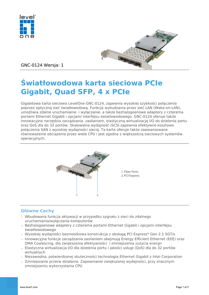GNC-0124 Wersja: 1 Światłowodowa karta sieciowa PCIe Gigabit, Quad SFP, 4 x PCIe Gigabitowa karta sieciowa LevelOne GNC-0124, zapewnia wysokiej szybkości połączenia poprzez optyczną sieć światłowodową. Funkcja wybudzania przez sieć LAN (Wake-on-LAN), umożliwia zdalne uruchamianie i wyłączanie, a także bezhalogoenowe adaptery z czterema portami Ethernet Gigabit i opcjami interfejsu światłowodowego. GNC-0124 oferuje także innowacyjne narzędzia zarządzania zasilaniem, elastyczną wirtualizację I/O do dzielenia portu oraz QoS dla do 32 portów. Skalowalna wydajność iSCSI zapewnia efektywne kosztowo połączenia SAN z wysokiej wydajności siecią. Ta karta oferuje także zaawansowane równoważenie obciążenia przez wiele CPU i jest zgodna z większością sieciowych systemów operacyjnych. Główne Cechy - Wbudowana funkcja aktywacji w przypadku sygnału z sieci do zdalnego uruchamiania/wyłączania komputerów - Bezhalogoenowe adaptery z czterema portami Ethernet Gigabit i opcjami interfejsu światłowodowego - Wysokiej wydajności bezmostkowa konstrukcja z obsługą PCI Express* Gen 2.1 5GT/s - Innowacyjne funkcje zarządzania zasilaniem obejmują Energy Efficient Ethernet (EEE) oraz DMA Coalescing, dla zwiększenia efektywności i zmniejszenia zużycia energii - Elastyczna wirtualizacja I/O dla dzielenia portu i jakości usługi (QoS) dla do 32 portów wirtualnych - Niezawodna, potwierdzonej skuteczności technologia Ethernet Gigabit z Intel Corporation - Zmniejszanie przerw działania: Zapewnianie zwiększonej wydajności, przy znacznym zmniejszeniu wykorzystania CPU www.level1.com Page 1 of 3 Specyfikacje Specyfikacja systemowa Standardy i protokoły: IEEE* 802.3 auto-negotiation IEEE 802.3 10-BASE-T, Ethernet IEEE 802.3u 100-BASE-TX, Fast Ethernet IEEE 802.3ab 1000BASE-T, Gigabit Ethernet IEEE 802.3x Flow Control (full-duplex flow control) IEEE 802.3z 1000Base-X Gigabit Ethernet IEEE 1588 protocol and 802.1AS implementation IEEE802.3az Energy Efficient Ethernet (EEE) IEEE 802.1q Virtual Local Area Network (VLAN) Złącza i okablowanie: 4 x SFP Port 1000Base-SX/LX PCI Express* v2.1 (5.0 GT/s & 2.5 GT/s) x4/x2/x1 Dioda: Link/Activity Cechy Generalne: 8 Tx and 8 Rx queues per port, Receive Side Scaling (RSS), Message Signal Interrupt Extension (MSI-X), UDP, TCP and IP checksum offloads, UDP and TCP Transmit Segmentation Offload (TSO), SCTP receive and transmit checksum offloads, stateless offloads (header splitting), jumbo frames (9.5k), Intel® VT-c (VMDq, SR-IOV), IEEE 1588 (time sync) / 802.1AS Zarządzanie: IPMI pass-through via SMBus or NC-SI, WoL, PXE remote boot, ISCSI boot, VLAN filtering Performance Prędkość transmisji danych: Integrated PHY for 10/100/1000 Mb/s for multispeed, full, and half-duplex Ramki Jumbo (K): 9.5 K Środowisko Temperature (°C): Operating: 0 °C~55 °C (32 °F~131 °F) Storage: -40 °C~70 °C (-40 °F~158 °F) Wilgotność (Nieskondensowana): Operating: 5% ~ 95% Storage: 5% ~ 95% Specyfikacje fizyczna Wymiary (Szerokość x głębokość x wysokość mm): 150x 69x 17 mm Waga (g): 100g Others www.level1.com Page 2 of 3 System operacyjny: Windows 10 DOS, Novell ODI Windows XP/Vista/7/8/8.1 Windows Server 2003/2008/2008 R2/2012/2012 R2 Linux 2.4 series kernel、2.6.x、3.x FreeBSD 7.x or most of the FreeBSD UnixWare / Open Unix 8 Sun Solaris x86 Xen4 Diagram Order Information GNC-0124 Zawartość Opakowania GNC-0124 Low Profile Bracket Instrukcja szybkiej instalacji ‘QIG’ Resource CD (User Manual, Driver) No liability or responsibility for any errors or omissions in the content. Specifications are subject to change without notice. All mentioned brand names are registered trademarks and property of their owners. Copyright © Digital Data Communications GmbH, Germany. All Rights Reserved. www.level1.com Powered by TCPDF (www.tcpdf.org) Page 3 of 3