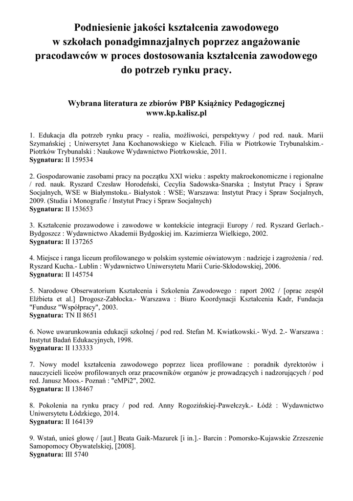 Podniesienie jakości kształcenia zawodowego w szkołach ponadgimnazjalnych poprzez angażowanie pracodawców w proces dostosowania kształcenia zawodowego do potrzeb rynku pracy. Wybrana literatura ze zbiorów PBP Książnicy Pedagogicznej www.kp.kalisz.pl 1. Edukacja dla potrzeb rynku pracy - realia, możliwości, perspektywy / pod red. nauk. Marii Szymańskiej ; Uniwersytet Jana Kochanowskiego w Kielcach. Filia w Piotrkowie Trybunalskim.Piotrków Trybunalski : Naukowe Wydawnictwo Piotrkowskie, 2011. Sygnatura: II 159534 2. Gospodarowanie zasobami pracy na początku XXI wieku : aspekty makroekonomiczne i regionalne / red. nauk. Ryszard Czesław Horodeński, Cecylia Sadowska-Snarska ; Instytut Pracy i Spraw Socjalnych, WSE w Białymstoku.- Białystok : WSE; Warszawa: Instytut Pracy i Spraw Socjalnych, 2009. (Studia i Monografie / Instytut Pracy i Spraw Socjalnych) Sygnatura: II 153653 3. Kształcenie prozawodowe i zawodowe w kontekście integracji Europy / red. Ryszard Gerlach.Bydgoszcz : Wydawnictwo Akademii Bydgoskiej im. Kazimierza Wielkiego, 2002. Sygnatura: II 137265 4. Miejsce i ranga liceum profilowanego w polskim systemie oświatowym : nadzieje i zagrożenia / red. Ryszard Kucha.- Lublin : Wydawnictwo Uniwersytetu Marii Curie-Skłodowskiej, 2006. Sygnatura: II 145754 5. Narodowe Obserwatorium Kształcenia i Szkolenia Zawodowego : raport 2002 / [oprac zespół Elżbieta et al.] Drogosz-Zabłocka.- Warszawa : Biuro Koordynacji Kształcenia Kadr, Fundacja "Fundusz "Współpracy", 2003. Sygnatura: TN II 8651 6. Nowe uwarunkowania edukacji szkolnej / pod red. Stefan M. Kwiatkowski.- Wyd. 2.- Warszawa : Instytut Badań Edukacyjnych, 1998. Sygnatura: II 133333 7. Nowy model kształcenia zawodowego poprzez licea profilowane : poradnik dyrektorów i nauczycieli liceów profilowanych oraz pracowników organów je prowadzących i nadzorujących / pod red. Janusz Moos.- Poznań : "eMPi2", 2002. Sygnatura: II 138467 8. Pokolenia na rynku pracy / pod red. Anny Rogozińskiej-Pawełczyk.- Łódź : Wydawnictwo Uniwersytetu Łódzkiego, 2014. Sygnatura: II 164139 9. Wstań, unieś głowę / [aut.] Beata Gaik-Mazurek [i in.].- Barcin : Pomorsko-Kujawskie Zrzeszenie Samopomocy Obywatelskiej, [2008]. Sygnatura: III 5740 10. Zatrudnienie w Polsce 2006 : produktywność dla pracy / pod red. Maciej Bukowski.- Warszawa : Departament Analiz Ekonomicznych i Prognoz : Ministerstwo Pracy i Polityki Społecznej, 2007. Sygnatura: III 5470 11. Wyścig z maszynami : jak rewolucja cyfrowa napędza innowacje, zwiększa wydajność i w nieodwracalny sposób zmienia rynek pracy? / Erik Brynjolfsson, Andrew McAfee ; przeł. Maksymilian Sielicki.- Warszawa : Kurhaus Publishing, 2015. Sygnatura: II 165515 12. Edukacja zawodowa w aspekcie przemian społeczno-gospodarczych : wyznania, szanse, zagrożenia / Ryszard Gerlach.- Bydgoszcz : Wydawnictwo Uniwersytetu Kazimierza Wielkiego, 2007. Sygnatura: II 147736 13. Rynek pracy : perspektywa instytucjonalna / Wiesława Kozek.- Warszawa : Wydawnictwa Uniwersytetu Warszawskiego, cop. 2013. Sygnatura: II 161659 14. Kształcenie zawodowe - wyzwania, priorytety, standardy / Stefan M. Kwiatkowski.- Wyd. 2 uzup.Warszawa : Instytut Badań Edukacyjnych, 2008. Sygnatura: II 152740 15. Wyścig z maszynami : jak rewolucja cyfrowa napędza innowacje, zwiększa wydajność i w nieodwracalny sposób zmienia rynek pracy? / Erik Brynjolfsson, Andrew McAfee ; przeł. Maksymilian Sielicki.- Warszawa : Kurhaus Publishing, 2015. Sygnatura: II 165515 16. Elementy cyfryzacji edukacji / Kazimierz Mikulski.- Toruń : Wyd. Adam Marszałek, 2015. (Biblioteka Pedagogiki Mediów) Sygnatura: II 165134 17. Edukacja zawodowa kluczem do jednoczącej się Europy / Jadwiga Serkowska-Mąka.- Toruń : Wydawnictwo Adam Marszałek, cop. 2004. Sygnatura: II 139785 18. Kształcenie zawodowe w postindustrialnej gospodarce : demografia, grupowanie, klasyfikacja, doradztwo / Tomasz Sobierajski.- Warszawa : Krajowy Ośrodek Wspierania Edukacji Zawodowej i Ustawicznej, 2013. Sygnatura: II 165851 19. Zaproszenie do monitorowania : monitorowanie wdrażania podstawy programowej kształcenia w zawodach jako badanie w działaniu / Tomasz Sobierajski.- Warszawa : Krajowy Ośrodek Wspierania Edukacji Zawodowej i Ustawicznej, 2015. Sygnatura: III 7876 20. Moja przyszła praca : materiały metodyczne do pracy z uczniami szkół zawodowych / Grażyna Sołtysińska, Elżbieta Żywiec-Dąbrowska.- Warszawa : Krajowy Ośrodek Wspierania Edukacji Zawodowej, 2001. (Vademecum Nauczyciela Szkoły Zawodowej ; 2) Sygnatura: II 135734, II 165686 21. Funkcjonowanie współczesnego rynku pracy : wybrane uwarunkowania / Agata SzydlikLeszczyńska.- Warszawa : "Difin", 2012. Sygnatura: II 159236, II 159523 22. Zatrudnienie i instytucje rynku pracy w warunkach starzejących się zasobów - badania dla Polski / Bogusława Urbaniak.- Łódź : Wydawnictwo Uniwersytetu Łódzkiego, 2011. Sygnatura: II 159567 23. Zatrudnienie i instytucje rynku pracy w warunkach starzejących się zasobów - badania dla Polski / Bogusława Urbaniak.- Łódź : Wydawnictwo Uniwersytetu Łódzkiego, 2011. Sygnatura: II 159567 24. Współpraca szkół zawodowych z pracodawcami : przykładowe rozwiązania / [aut. Paulina Zaręba i in.].- Warszawa : Krajowy Ośrodek Wspierania Edukacji Zawodowej i Ustawicznej, 2013. Sygnatura: II 165732, II 165733 25. Moja przyszła praca : materiały metodyczne do pracy z uczniami szkół zawodowych / Grażyna Sołtysińska, Elżbieta Żywiec-Dąbrowska.- Warszawa : Krajowy Ośrodek Wspierania Edukacji Zawodowej, 2001. (Vademecum Nauczyciela Szkoły Zawodowej ; 2) Sygnatura: II 135734, II 165686 Opracowanie: Jolanta Szymańska Dział Udostępniania Zbiorów PBP KP w Kaliszu Kalisz dn. 14.09.2016 r.