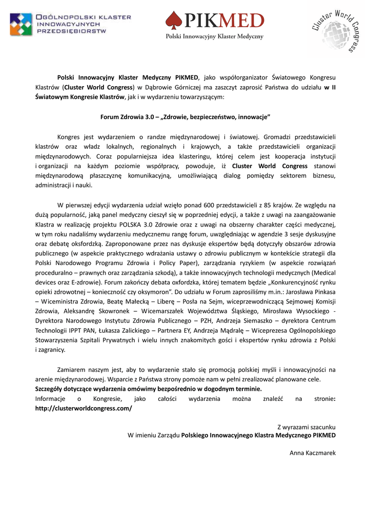 Polski Innowacyjny Klaster Medyczny PIKMED, jako współorganizator Światowego Kongresu Klastrów (Cluster World Congress) w Dąbrowie Górniczej ma zaszczyt zaprosić Państwa do udziału w II Światowym Kongresie Klastrów, jak i w wydarzeniu towarzyszącym: Forum Zdrowia 3.0 – „Zdrowie, bezpieczeństwo, innowacje” Kongres jest wydarzeniem o randze międzynarodowej i światowej. Gromadzi przedstawicieli klastrów oraz władz lokalnych, regionalnych i krajowych, a także przedstawicieli organizacji międzynarodowych. Coraz popularniejsza idea klasteringu, której celem jest kooperacja instytucji i organizacji na każdym poziomie współpracy, powoduje, iż Cluster World Congress stanowi międzynarodową płaszczyznę komunikacyjną, umożliwiającą dialog pomiędzy sektorem biznesu, administracji i nauki. W pierwszej edycji wydarzenia udział wzięło ponad 600 przedstawicieli z 85 krajów. Ze względu na dużą popularność, jaką panel medyczny cieszył się w poprzedniej edycji, a także z uwagi na zaangażowanie Klastra w realizację projektu POLSKA 3.0 Zdrowie oraz z uwagi na obszerny charakter części medycznej, w tym roku nadaliśmy wydarzeniu medycznemu rangę forum, uwzględniając w agendzie 3 sesje dyskusyjne oraz debatę oksfordzką. Zaproponowane przez nas dyskusje ekspertów będą dotyczyły obszarów zdrowia publicznego (w aspekcie praktycznego wdrażania ustawy o zdrowiu publicznym w kontekście strategii dla Polski Narodowego Programu Zdrowia i Policy Paper), zarządzania ryzykiem (w aspekcie rozwiązań proceduralno – prawnych oraz zarządzania szkodą), a także innowacyjnych technologii medycznych (Medical devices oraz E-zdrowie). Forum zakończy debata oxfordzka, której tematem będzie „Konkurencyjność rynku opieki zdrowotnej – konieczność czy oksymoron”. Do udziału w Forum zaprosiliśmy m.in.: Jarosława Pinkasa – Wiceministra Zdrowia, Beatę Małecką – Liberę – Posła na Sejm, wiceprzewodniczącą Sejmowej Komisji Zdrowia, Aleksandrę Skowronek – Wicemarszałek Województwa Śląskiego, Mirosława Wysockiego Dyrektora Narodowego Instytutu Zdrowia Publicznego – PZH, Andrzeja Siemaszko – dyrektora Centrum Technologii IPPT PAN, Łukasza Zalickiego – Partnera EY, Andrzeja Mądralę – Wiceprezesa Ogólnopolskiego Stowarzyszenia Szpitali Prywatnych i wielu innych znakomitych gości i ekspertów rynku zdrowia z Polski i zagranicy. Zamiarem naszym jest, aby to wydarzenie stało się promocją polskiej myśli i innowacyjności na arenie międzynarodowej. Wsparcie z Państwa strony pomoże nam w pełni zrealizować planowane cele. Szczegóły dotyczące wydarzenia omówimy bezpośrednio w dogodnym terminie. Informacje o Kongresie, jako całości wydarzenia można znaleźć na stronie: http://clusterworldcongress.com/ Z wyrazami szacunku W imieniu Zarządu Polskiego Innowacyjnego Klastra Medycznego PIKMED Anna Kaczmarek Forum Zdrowia 3.0 Zdrowie, bezpieczeństwo, innowacje Ramowy program: 1. Sesja I - Zdrowie publiczne • aspekty praktyczne wdrażania ustawy o zdrowiu publicznym (w kontekście strategii dla Polski NPZ i PP) 2. Sesja II - Risk Alert – Zarządzanie kulturą bezpieczeństwa dla pacjenta i pracowników ochrony zdrowia • zarządzanie ryzykiem • zdarzenia niepożądane - aspekty zdrowotne, finansowe, gospodarcze i systemowe • komunikacja i zmiana zachowań • zarządzanie szkodą – rekonstrukcja zdrowia 3. Sesja III - Polinnovation - Innowacje technologiczne • Medical Devices - współpraca międzysektorowa wpływ na rozwój usług i technologii zdrowotnych, • eZdrowie - wdrażanie rozwiązań na Polski rynek w kwestii doświadczeń europejskich i dyrektyw UE • Projekt Mars 4. Debata oxfordzka – „Konkurencyjność rynku opieki zdrowotnej – konieczność czy oksymoron” Więcej informacji o całym wydarzeniu znajdą Państwo na: http://clusterworldcongress.com/pl/info/