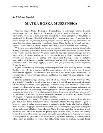 Świat skalny okolic Muszyny 103 Ks. Władysław Szczebak MATKA BOSKA MUSZYŃSKA Gotycka figura Matki Boskiej z Dzieciątkiem, z głównego ołtarza kościoła parafialnego pw. św. Józefa w Muszynie, przybyła tutaj z Krakowa, z Katedr) wawelskiej. Wiadomo o tym z notatki znalezionej w roku ubiegłym w dokumentaci; należących do Kapituły Katedralnej Krakowskiej. Notatka nosi datę 17 września 1616 roku i podaje, że: na pokorną prośbę parafian kościoła Muszyńskiego przekazano dlc tegoż kościoła ołtarz zawierający rzeźbione figury Matki Boskiej i świętych dziewic z kaplicy Świętej Trójcy, a na jego miejsce dano inny, z przedstawieniem Męki Pańskiej. 1 W świetle tej notatki okazało się, że nie ma podstaw twierdzenie, jakoby figura Matki Boskiej z Muszyny powstała w Nowym Sączu i była dziełem rzeźbiarza Jakuba z Sącza, który tworzył także na Spiszu.2 Wyjaśniła nadto, że figura jest pozostałością po dawnym tryptyku, czyli ołtarzu szafiastym, i że otaczały ją wtedy figurki świętych dziewic. Tryptyk ten mieścił się w kaplicy pod wezwaniem Świętej Trójcy w Katedrze wawelskiej, obok innego tryptyku, istniejącego tam do dziś, mającego wypisaną datę powstania: 1467. Ten drugi tryptyk, z roku 1467, jest poświęcony właśnie tajemniej Trójcy Świętej. Figura Matki Boskiej z Muszyny oraz należące do niej dwie małe figurki św. Jadwigi Śląskiej i św. Otylii, wykazują wielkie podobieństwo do stylu rzeźb tegc drugiego wawelskiego tryptyku. Podobieństwo jest wyraźne i nie można mieć wątpliwości, że powstały one w pracowni tego samego rzeźbiarza, lecz zapewne niecc później, tuż po roku 1470. Rzeźba małopolska tego okresu, czyli od lat 60. wieku XV aż do przybycia Wita Stwosza (1477), cechuje się odchodzeniem w draperii szat od zdecydowanych głębokich lub rurkowanych fałdów „stylu pięknego”. Draperie tracą teraz płynność i rytmiczność układu, przedstawiają się jako zmięte w drobne i gęste, geometryczne załamania, na brzegach zawijają się i odwijają, nie rezygnując tu i ówdzie z głębszych cięć, dla efektu mocnego światłocienia. Jest to okres przedstwoszowski, zwany też niekiedy „ciemnym”. Wymienione cechy dają się łatwo rozpoznać zarówno w wawelskim ołtarzu Świętej Trójcy, jak i w figurze muszyńskiej Matki Boskiej. Ów krakowski rzeźbiarz z Wawelu — nieznany nam dotąd z imienia i nazwiska — jest nazywany przez historyków sztuki mistrzem ołtarza Świętej Trójcy. Figura z Muszyny, która wyszła z jego warsztatu, przedstawia Matkę Boską jako Królową Nieba i Panią Aniołów, stojącą na firmamencie niebieskim, ze srebrnym księżycem u dołu (patrz fot. na kolorowej wkładce). Spod płaszcza Matki Boskiej wychylają się postacie trzech aniołków, zaś Ona sama trzyma na prawej ręce Dziecię Jezus, w lewe; zaś dzierży królewskie berło. Dzieciątko jest nagie, Ona natomiast suknię ma srebrzystą, przepasaną złotym paskiem ze sprzączką, a na głowie srebrzysty welon Spadający z ramion płaszcz, udrapowany na przedzie w różnorodne fałdy, także mieną się złotem, zaś jego brzegi Ks. Władysław Szczebak odchylają się tu i ówdzie, ukazując czerwoną podszewkę. 104 Matka Boska Muszyńska 105 Matka Boska, o ujmująco łagodnym obliczu, zwraca nieco twarz ku Dzieciątku, spoglądając z życzliwością na owoc granatu (palestyńskie jabłko), który trzyma Ono w rączce. Granat — ze względu na czerwony kolor łupiny oraz wielką ilość ściśle ze sobą zespolonych ziaren — jest symbolem Kościoła.3 Wyobraża ludzi wiernych Chrystusowi, złączonych wiarą i miłością, odkupionych Jego krwawą Ofiarą krzyżową. Matka Najświętsza występuje zatem w tej figurze nie tylko jako Bogurodzica, wyniesiona ponad wszelkie stworzenie, ale również jako Matka Odkupiciela i Wspo- możycielka Wiernych. Sprawozdanie z wizytacji biskupiej, przeprowadzonej w tutejszej parafii w roku 1728 stwierdza, że figura ta była w dawnych czasach otoczona w Muszynie wielkim kultem. Wyrazem tego były wysadzane drogimi kamieniami złote i srebrne ozdoby, które miała wtedy na sobie, oraz bardzo liczne i różnorodne wota, składane przez wiernych jako podziękowanie za otrzymane łaski.4 O wyjątkowych rozmiarach tego kultu świadczy również fakt, że gdy 21 lat potem, w 1749 roku, biskup krakowski Jędrzej Stanisław Kostka Załuski konsekrował obecny kościół muszyński, to na pierwszym miejscu nadał mu wezwanie Najświętszej Maryi Panny w tajemnicy Nawiedzenia, a następnie św. Józefa, który był wówczas — i jest obecnie — patronem parafii, oraz św. Stanisława Szczepanowskiego i św. Stanisława Kostki, jako patronów Królestwa Polskiego. Na tablicy dedykacyjnej, istniejącej do dziś w kościele, wspomniano wtedy, że Najchwalebniejsza Boża Rodzicielka jest naszą Ucieczką — „Refugium”, a więc Wspomożycielką we wszystkich potrzebach. W ostatnich miesiącach ubiegłego roku — staraniem proboszcza, ks. Józefa Wierzbickiego — figura została poddana badaniom laboratoryjnym i gruntownej konserwacji w pracowni konserwatorskiej na Wawelu, pod kierunkiem mgr Ewy Wiłkojć. Wcześniej jeszcze — od 5 maja do 30 lipca tegoż roku — brała udział w wielkiej Wystawie Jubileuszowej: Wawel 1000 - 2000, zajmując poczesne miejsce w komnatach Zamku Królewskiego, wśród najcenniejszych skarbów kultury polskiej ostatniego tysiąclecia. Uroczyste wprowadzenie figury do kościoła po wystawie i po konserwacji odbyło się w I niedzielę Adwentu, 3 grudnia 2000 roku. Przypisy: 1. Archiwum Kurii Metropolitalnej w Krakowie (AKMK), Acta Actorum Rmi Capituli Cathedr. Ecclesiae Cracoviensis, 1616, No limo, k. 417 (327), rkps; por. H. Małkiewicz, Matka Boska z Dzieciątkiem, św. Jadwiga Śląska i św. Otylia, (w:) Wawel 1000 - 2000. Wystawa Jubileuszowa. Kultura artystyczna dworu królewskiego i katedry. Zamek Królewski na Wawelu, V-VI