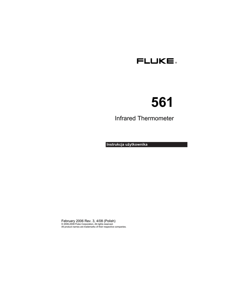 ® 561 Infrared Thermometer Instrukcja użytkownika February 2006 Rev. 3, 4/08 (Polish) © 2006-2008 Fluke Corporation, All rights reserved. All product names are trademarks of their respective companies. OGRANICZONA GWARANCJA I OGRANICZENIE ODPOWIEDZIALNOOCI Niniejszy produkt firmy Fluke będzie wolny od wad materiałowych i produkcyjnych przez okres dwa lata od daty zakupu. Niniejsza gwarancja nie obejmuje bezpieczników, baterii wymiennych lub uszkodzeń powstałych w wyniku wypadku, zaniedbania, niewłaściwego użycia, modyfikacji, skażenia lub nieprawidłowych warunków działania lub obsługi. Punkty sprzedaży nie posiadają uprawnień do oferowania żadnych innych gwarancji w imieniu firmy Fluke. Aby skorzystać z serwisu w czasie trwania gwarancji należy skontaktować się z najbliższym autoryzowanym Centrum Serwisowym firmy Fluke w celu uzyskania informacji dotyczących autoryzacji zwrotu, a następnie wysłać produkt do tego Centrum Serwisowego podając opis problemu. NINIEJSZA GWARANCJA JEST JEDYNYM ZADOŚĆUCZYNIENIEM DLA NABYWCY. ŻADNE INNE GWARANCJE - NA PRZYKŁAD ZDATNOŚCI PRODUKTU DO DANEGO CELU, NIE SĄ ANI WYRAŻONE ANI NIE MOGĄ BYĆ DOROZUMIANE. FIRMA FLUKE NIE JEST ODPOWIEDZIALNA ZA ŻADNE SPECJALNE, POŚREDNIE, PRZYPADKOWE LUB WYNIKOWE USZKODZENIA LUB STRATY POWSTAŁE Z JAKIEJKOLWIEK PRZYCZYNY LUB ZAŁOŻENIA. Ponieważ w niektórych stanach lub krajach nie jest dozwolone wyłączenie lub ograniczenie dorozumianej gwarancji lub przypadkowych lub wynikowych strat, to oświadczenie o ograniczeniu odpowiedzialności producenta może nie mieć zastosowania do każdego Nabywcy. Fluke Corporation P.O. Box 9090 Everett, WA 98206-9090 U.S.A. 11/99 Fluke Europe B.V. P.O. Box 1186 5602 BD Eindhoven Holandia Spis treści Tytuł Strona Wstęp......................................................................................... Kontakt z firmą Fluke ................................................................. Informacje na temat bezpieczeństwa ......................................... Cechy urządzenia ...................................................................... Wyświetlacz ............................................................................... Przyciski i złącze ........................................................................ Zasada działania termometru..................................................... Używanie termometru ................................................................ Lokalizowanie gorącego lub zimnego punktu ......................... Odległość i powierzchnia pomiaru .......................................... Pole widzenia ......................................................................... Emisyjność ............................................................................. Przełączanie między stopniami °C i °F ................................... Używanie kontaktowej sondy temperatury ............................. Symbol HOLD......................................................................... Konserwacja .............................................................................. Wymiana baterii...................................................................... Czyszczenie soczewki............................................................ Czyszczenie obudowy ............................................................ Rozwiązywanie problemów i diagnostyka .................................. Certyfikaty CE ............................................................................ Dane techniczne ........................................................................ i 1 1 2 3 4 5 6 6 6 6 7 7 8 9 10 10 10 10 10 11 11 11 561 Instrukcja użytkownika ii Spis tabel Tabela 1. 2. 3. Tytuł Strona Symbole ..................................................................................... 3 Emisyjność powierzchni ............................................................. 8 Zalecane sondy temperatury...................................................... 10 iii 561 Instrukcja użytkownika iv Spis rysunków Rysunek 1. 2. 3. 4. 5. 6. 7. 8. Tytuł Strona Symbole i oznaczenia dotyczące bezpieczeństwa..................... Infrared Thermometer ................................................................ Wyświetlacz termometru ............................................................ Lokalizowanie gorącego lub zimnego punktu............................. Odległość i powierzchnia pomiaru.............................................. Pole widzenia ............................................................................. Przełączanie między stopniami °C i °F....................................... Podłączanie sondy temperatury ................................................. v 3 4 5 6 7 7 9 9 561 Instrukcja użytkownika vi 561 Infrared Thermometer Wstęp Urządzenie Fluke 561 Infrared Thermometer, nazywane w niniejszym dokumencie “termometrem”, umożliwia określanie temperatury powierzchni za pomocą pomiaru ilości energii promieniowania podczerwonego emitowanego przez powierzchnię obiektu lub przez bezpośredni kontakt przy użyciu sondy z termoparą. Termometr jest przeznaczony w szczególności do użytku w systemach ogrzewania, wentylacji i klimatyzacji (HVAC). Niniejsza instrukcja dotyczy wszystkich wersji urządzenia Fluke 561. Uwaga: Modele japońskie wskazują temperaturę tylko w stopniach Celsjusza. Kontakt z firmą Fluke Aby skontaktować się z firmą Fluke, należy zadzwonić pod jeden z następujących numerów telefonów: USA: 1-888-44-FLUKE (1-888-443-5853) Kanada: 1-800-36-FLUKE (1-800-363-5853) Europa: +31-40-267-5200 Japonia: +81-3-3434-0181 Singapur: +65-738-5655 Z każdego miejsca na świecie: +1-425-446-5500 Serwis w USA: 1-888-99-FLUKE (1-888-993-5853) Można też odwiedzić witrynę internetową firmy Fluke: www.fluke.com. Aby zarejestrować produkt, należy przejść do witryny pod adresem http://register.fluke.com. 1 561 Instrukcja