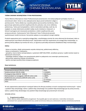 TAŚMA OKIENNA WEWNĘTRZNA TYTAN PROFESSIONAL Taśma Okienna Wewnętrzna Tytan Professional jest przeznaczona do izolacji połączeń pomiędzy murem, a ościeżnicami okien i drzwi w celu zabezpieczenia złącza przed wnikaniem wilgoci z pomieszczenia. Taśma składa się z wysokiej jakości paroszczelnej membrany, która gwarantuje optymalną wartość współczynnika Sd, pokrytej z obu stron włókniną poliestrową. Taśma jest kompatybilna z takimi materiałami jak kleje, tynki itp. Ze względu na swoje właściwości produkt nadaje się do instalacji w miejscach, w których wymagane jest stosowanie produktów o niskim współczynniku paro przepuszczalności. Zastosowanie Taśm Okiennych Tytan Professional pozwala wyeliminować mostki termiczne i korzystnie wpływa na oszczędność energii cieplnej. Produkt wyposażony jest w specjalną wstęgę kleju, umożliwiającą montaż do ramy okiennej lub drzwiowej, także w niekorzystnych warunkach atmosferycznych. Opcjonalnie może być wyposażony we wstęgę kleju butylowego, za pomocą której odbywa się montaż do muru, co ogranicza potrzebę stosowania dodatkowo kleju montażowego. Zalety: - łatwa w montażu, dzięki zastosowaniu wysoko elastycznej, poliestrowej włókniny, - łatwa w tynkowaniu i malowaniu, - specjalna, mocna taśma samoprzylepna z systemem GRIP SOLUTION umożliwia sprawny i szybki montaż nawet w rękawicach ochronnych, - zapobiega wnikaniu wilgoci oraz powstawaniu pleśni w połączeniu oraz wewnątrz pomieszczenia, - gwarantuje najwyższą izolację uszczelnienia, - spełnia wymogi wysokiej klasy energooszczędności. Dane techniczne: Parametr Paroprzepuszczalność (PN-EN 12572) Wodoszczelność (PN-EN 1928) Przyleganie kleju (DIN EN 1939-C) Wytrzymałość na rozciąganie (DIN EN 12311-2/A) Wydłużenie przy zerwaniu (DIN EN 12311-2/A) Odporność na UV Kolor Wartość ≥55m ≥ 0,04MPa 15N/25mm ≥ 8MPa ≥ 70% 12 miesięcy Niebieski W celu zapewnienia optymalnych rozwiązań Selena SA oferuje produkty w trzech rozwiązaniach technicznych – taśma z paskiem kleju akrylowego, taśma z pakiem kleju akrylowego oraz paskiem kleju butylowego (po tej samej stronie), taśma z pakiem kleju akrylowego oraz paskiem kleju butylowego (po przeciwnych stronach). SPOSÓB UŻYCIA 1. Przygotowanie podłoża Otwór okienny należy odpowiednio przygotować. W przypadku gdy mur jest wykonany z materiałów nierównych, porowatych lub z pustymi przestrzeniami (np. pustak ceramiczny) należy przy zastosowaniu zaprawy cementowej wyrównać TP/TOW/26112013 go zarówno w świetle otworu jak i po jego obwodzie w celu zapewnienia właściwego przylegania warstwy kleju. Dla wzmocnienia podłoża wskazane jest zatopienie siatki. Wyrównane podłoże na którym będą stosowane taśmy zagruntować (np. Tytan Professional Grunt Uniwersalny). 2. Przygotowanie stolarki otworowej Przed przystąpieniem do wyklejania taśmami ramy okiennej należy ją odtłuścić za pomocą np. benzyny ekstrakcyjnej lub acetonu. Rama powinna być sucha, wolna od brudu, kurzu i innych zanieczyszczeń. Przymierzyć okno do otworu okiennego w celu zwrócenia uwagi na odległości pomiędzy narożnikami stolarki a narożnikami otworu okiennego oraz prawidłowego doboru taśm pod kątem ich szerokości i umiejscowienia pasków kleju. 3. Oklejanie stolarki otworowej Do wyklejania ram stolarki otworowej używane są dwa rodzaje taśm: - Tytan Professional Taśma Okienna Zewnętrzna – paroprzepuszczalna w kolorze białym - Tytan Professional Taśma Okienna Wewnętrzna – paroszczelna w kolorze niebieskim Możliwe jest zastąpienie w/w taśm , Tytan Professional Taśma Okienna Uniwersalna o zmiennym współczynniku Sd w kolorze szarym, stosowaną zarówno po stronie wewnętrznej jak i zewnętrznej okna. Wyklejanie rozpocząć od taśmy wewnętrznej - paroszczelnej w kolorze niebieskim. W celu aktywacji kleju należy zerwać taśmę zabezpieczającą. Montaż rozpocząć w połowie wysokości okna, kierując się ku dołowi. W narożnikach wykonać zakładki równe odległości pomiędzy narożnikiem ramy okiennej a otworu w celu zapewnienia właściwego połączenia taśmy z murem. Miejsca łączenia taśm podkleić klejem montażowym (np. Tytan Professional Klej Dekarski). Sposób i moment wyklejania taśm zewnętrznych – paroprzepuszczalnych w kolorze białym uzależniony jest od sposobu montażu stolarki otworowej oraz dostępu do okna po jego zamocowaniu mechanicznym. TP/TOW/26112013 a. Przy montażu poza licem muru, na konsolach montażowych - wskazane jest wyklejenia taśmy zewnętrznej przed umieszczeniem okna w miejscu montażu. W przypadku montażu stolarki równo z licem muru zalecane jest wyklejanie stykowe umożliwiające połączenie okna z murem. Montażu taśm dokonać w następującej kolejności: - strefa podokienna - piony (lewy i prawy) - strefa nadokienna W przypadku łatwego dostępu do okna wyklejania można dokonać po mechanicznym montażu stolarki. b. 4. Montaż stolarki otworowej Montaż stolarki wykonać zgodnie z instrukcją producenta, zwracając szczególną uwagę na prawidłowe usytuowanie kotew. Przed przystąpieniem do wypełnienia szczeliny pianą poliuretanową (np. Tytan Professional Low Expansion) wskazane jest połączenie okna z murem taśmą, za pomocą kleju butylowego, aplikując go poprzez zerwanie taśmy ochronnej. Wypełnić szczelinę pianą zgodnie z instrukcją producenta. Po całkowitym utwardzeniu piany poliuretanowej i ewentualnym odcięciu nadmiarów, zerwać taśmę ochronną z paska kleju butylowego i połączyć taśmę wewnętrzną z murem. UWAGA Przed upływem 3 miesięcy konieczne jest zabezpieczenie taśm przed degradującym ich parametry techniczne promieniowaniem UV. Dostępne produkty: Tytan Professional Taśma Okienna Wewnętrzna, 70 mm Tytan Professional Taśma Okienna Wewnętrzna, 100 mm Tytan Professional Taśma Okienna Wewnętrzna, 150 mm Tytan Professional Taśma Okienna Wewnętrzna z Butyle